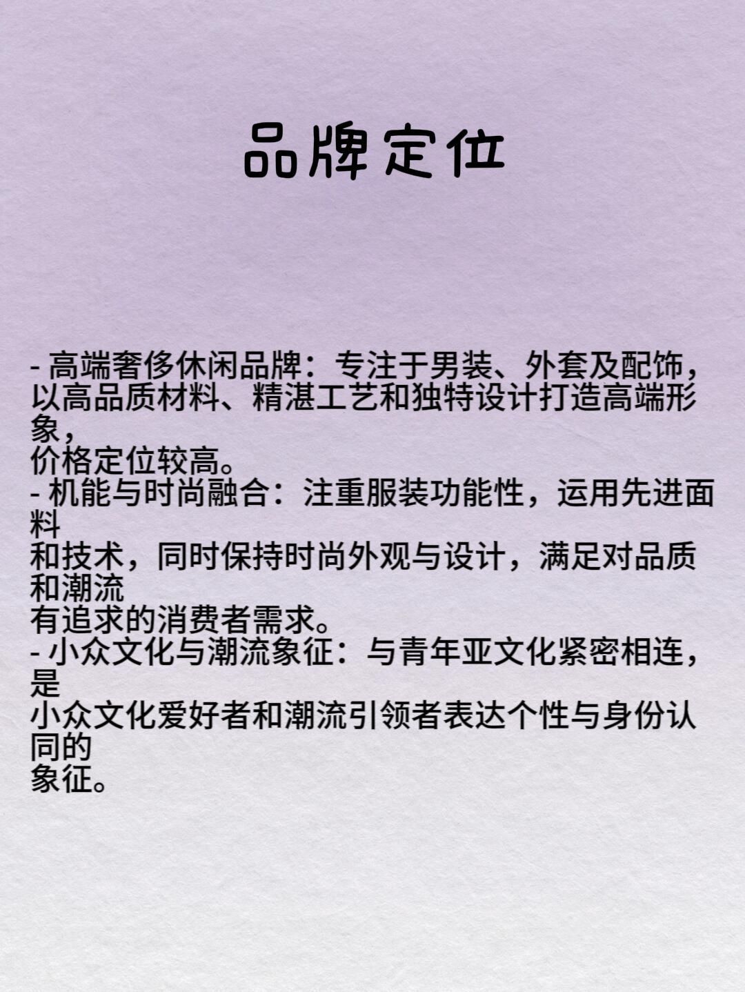 - 高端奢侈休闲品牌:专注于男装、外套及配饰,以高品质材料、精湛工艺和独特设计打造高端形象,价格定位较高。