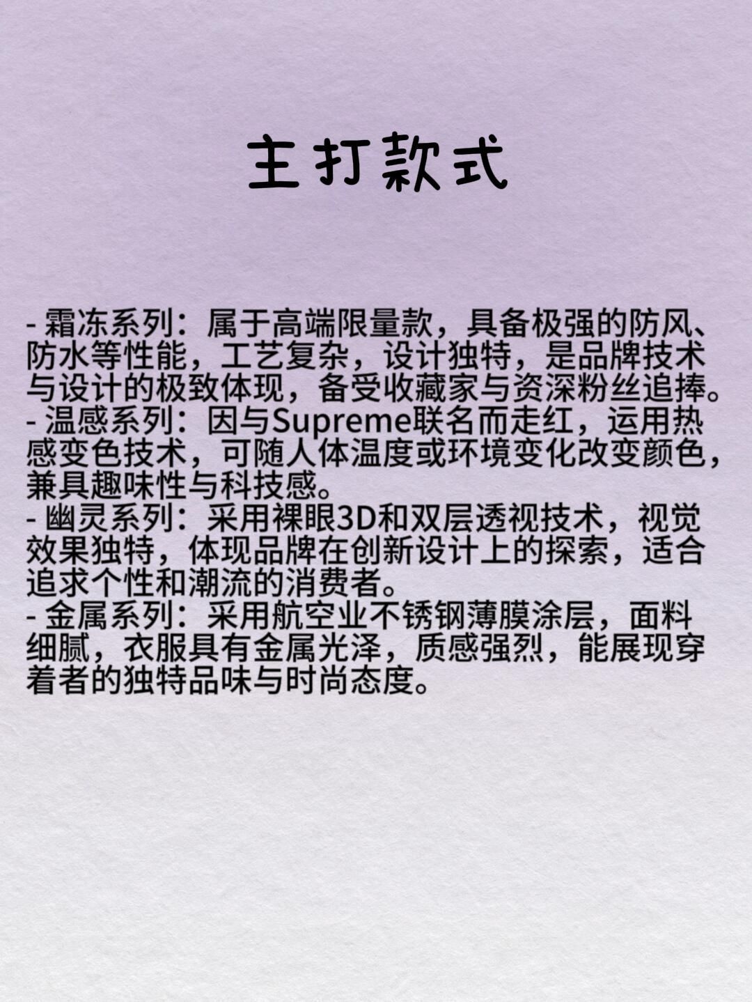 - 霜冻系列:属于高端限量款,具备极强的防风、防水等性能,工艺复杂,设计独特,是品牌技术与设计的极致体现,备受收藏家与资深粉丝追捧。