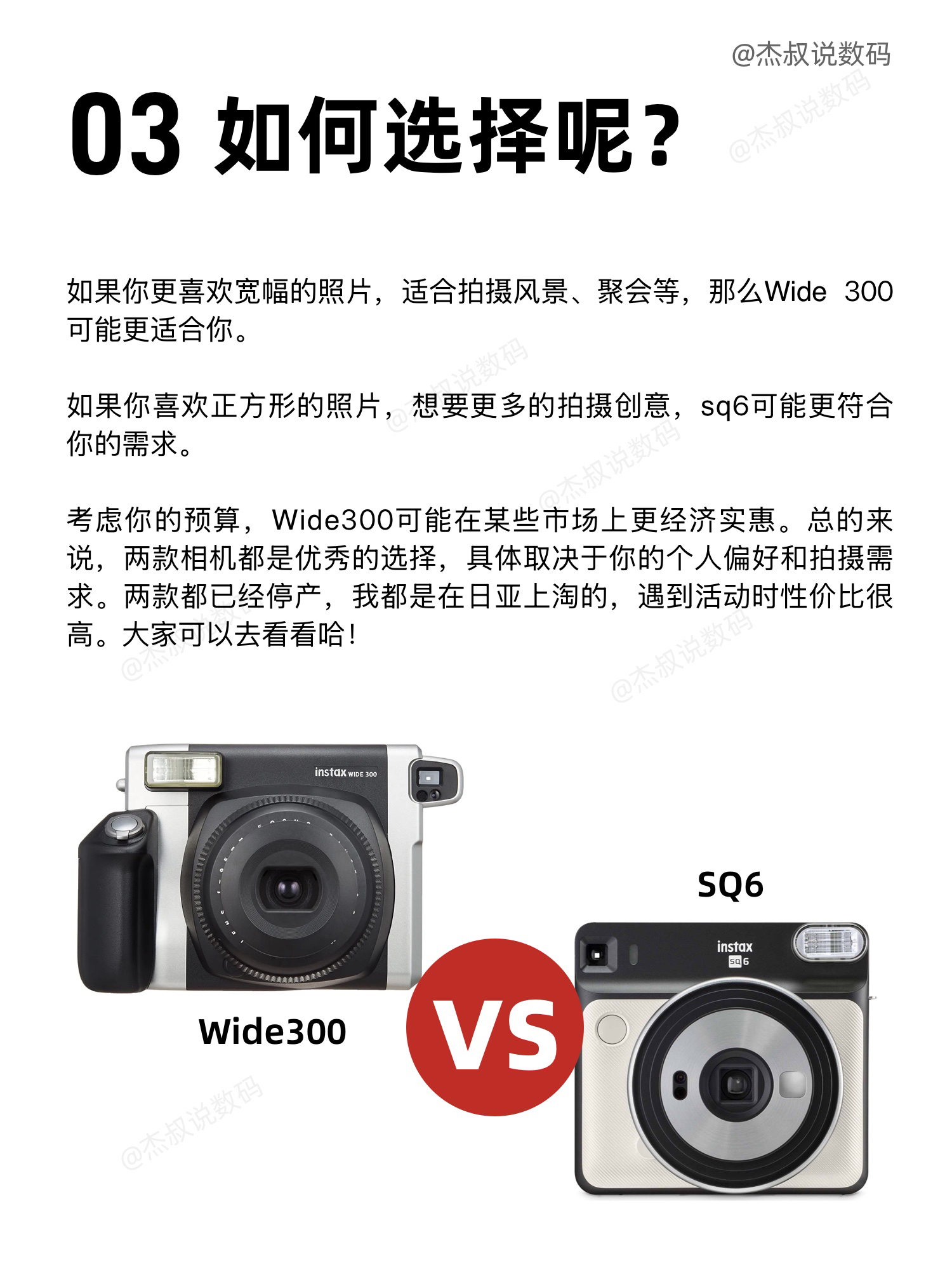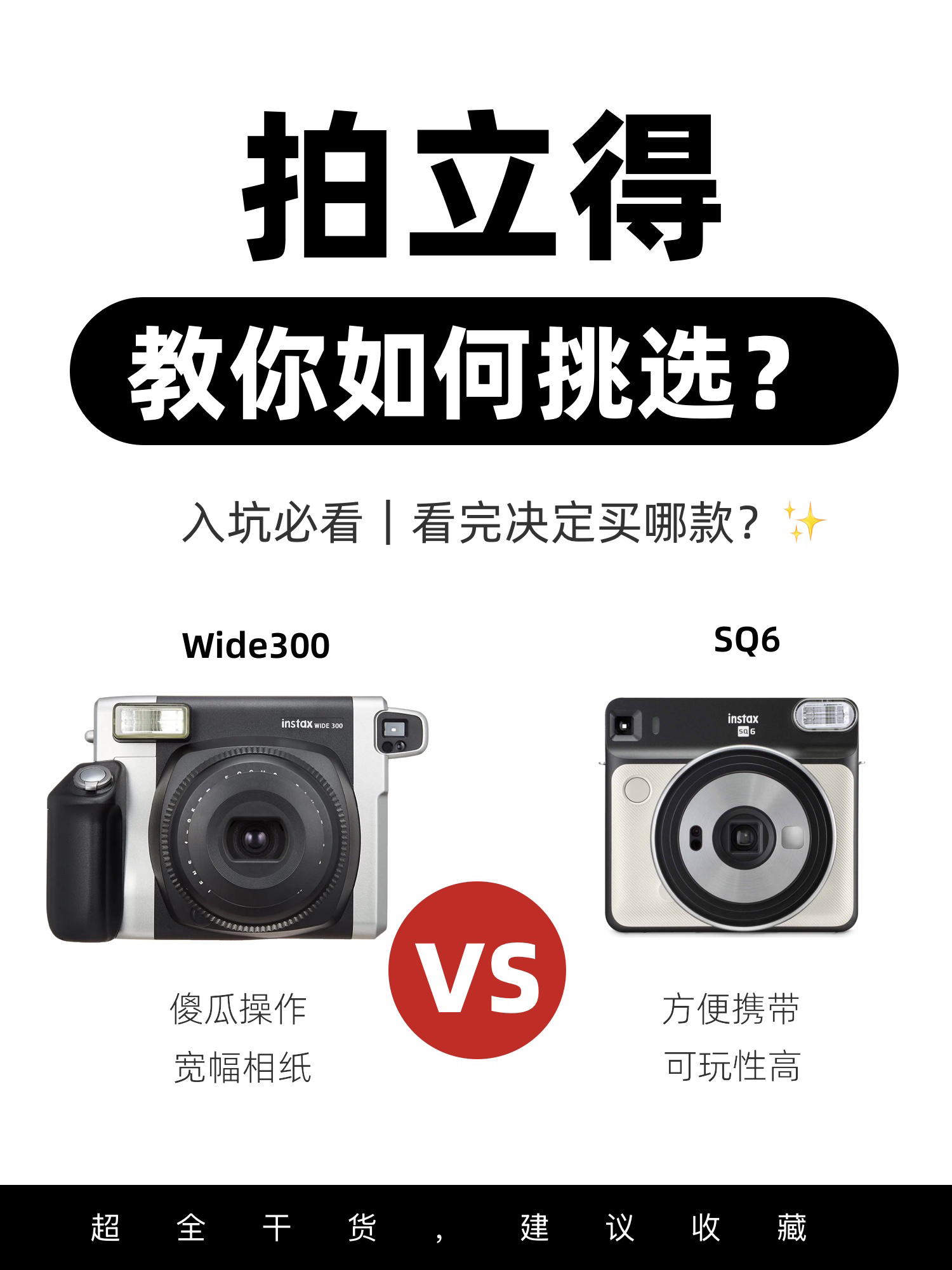拍立得应该怎么选?究竟是Wide300还是sq6? 纠结的小伙伴们,看这里!🎉🎉 📷 如果你更喜欢宽幅的照片,适合拍摄风景、聚会等,那么Wide 300可能更适合你。 如果你喜欢正方形的照片,想要更多的拍摄创意以及好看的外观,sq6可能更符合你的需求。 总的来说,两款相机都是优秀的选择,具体取决于你的个人偏好和拍摄需求。不过两款都已经停产,国内大多溢价严重。 🎁最后,我要说的是,这两款...