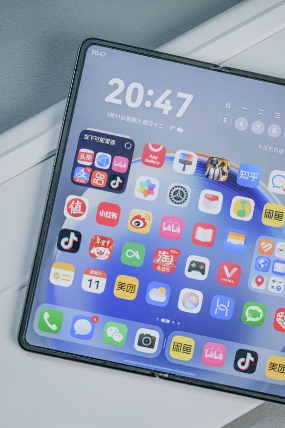 也是整上折叠屏了😁😁转转上的95新也是绝了,各种磕碰划痕 但使用体验还是很不错,拿到手就升了鸿蒙NEXT,系统超级丝滑,主流软件也基本都适配了。不过Mate X5的处理器毕竟已经落后两代了,玩游戏确实拉跨,玩一局王者荣耀基本就要发热降频了。 目前大屏和副屏的使用时间大概6:4,大屏用来看视频看书,小屏用于微信、工作,新鲜劲还没过,还在不断探索中