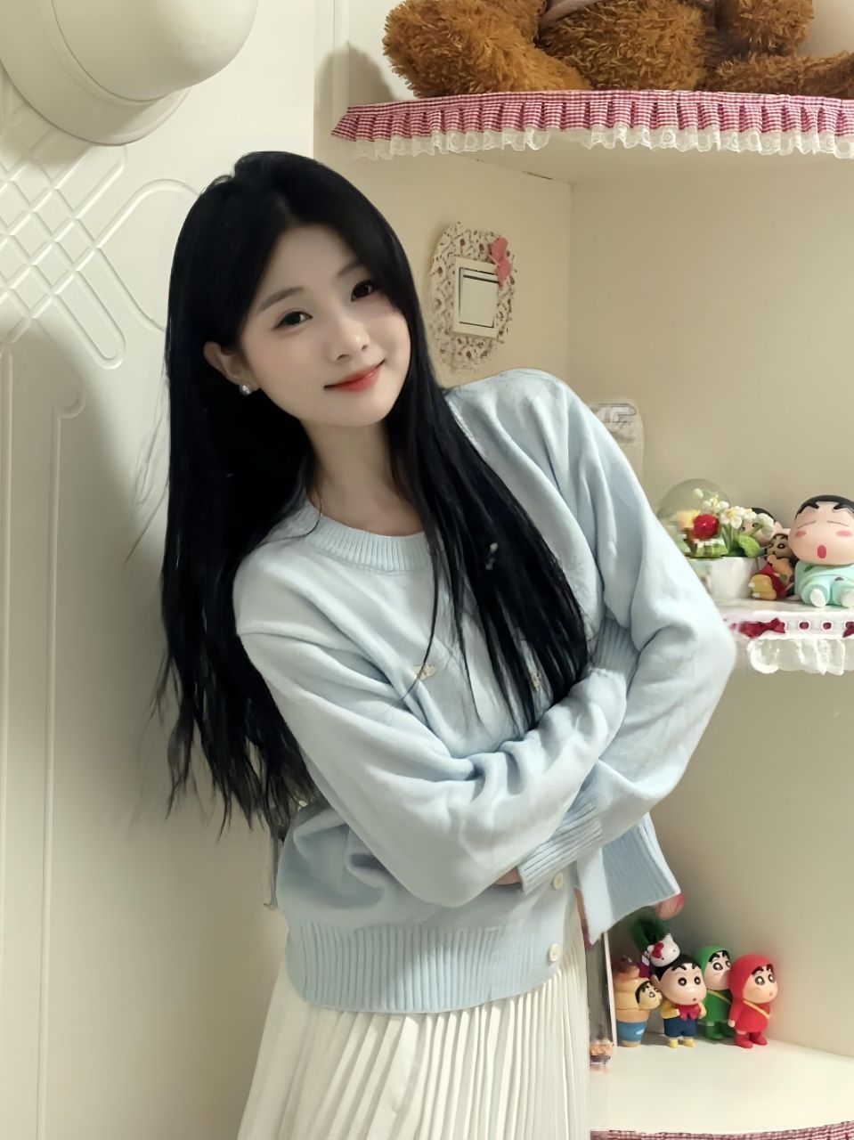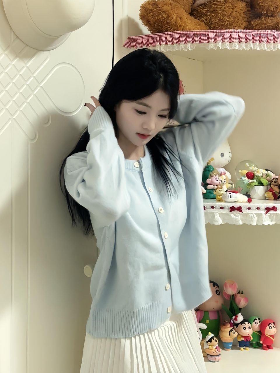 特别喜欢这件蓝色针织开衫! 浅蓝色显得人嫩嫩哒~ 衬的肤色也很白净