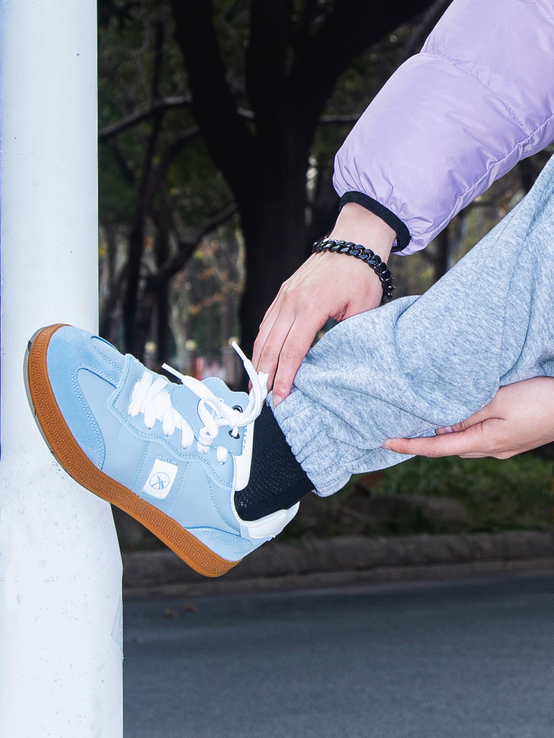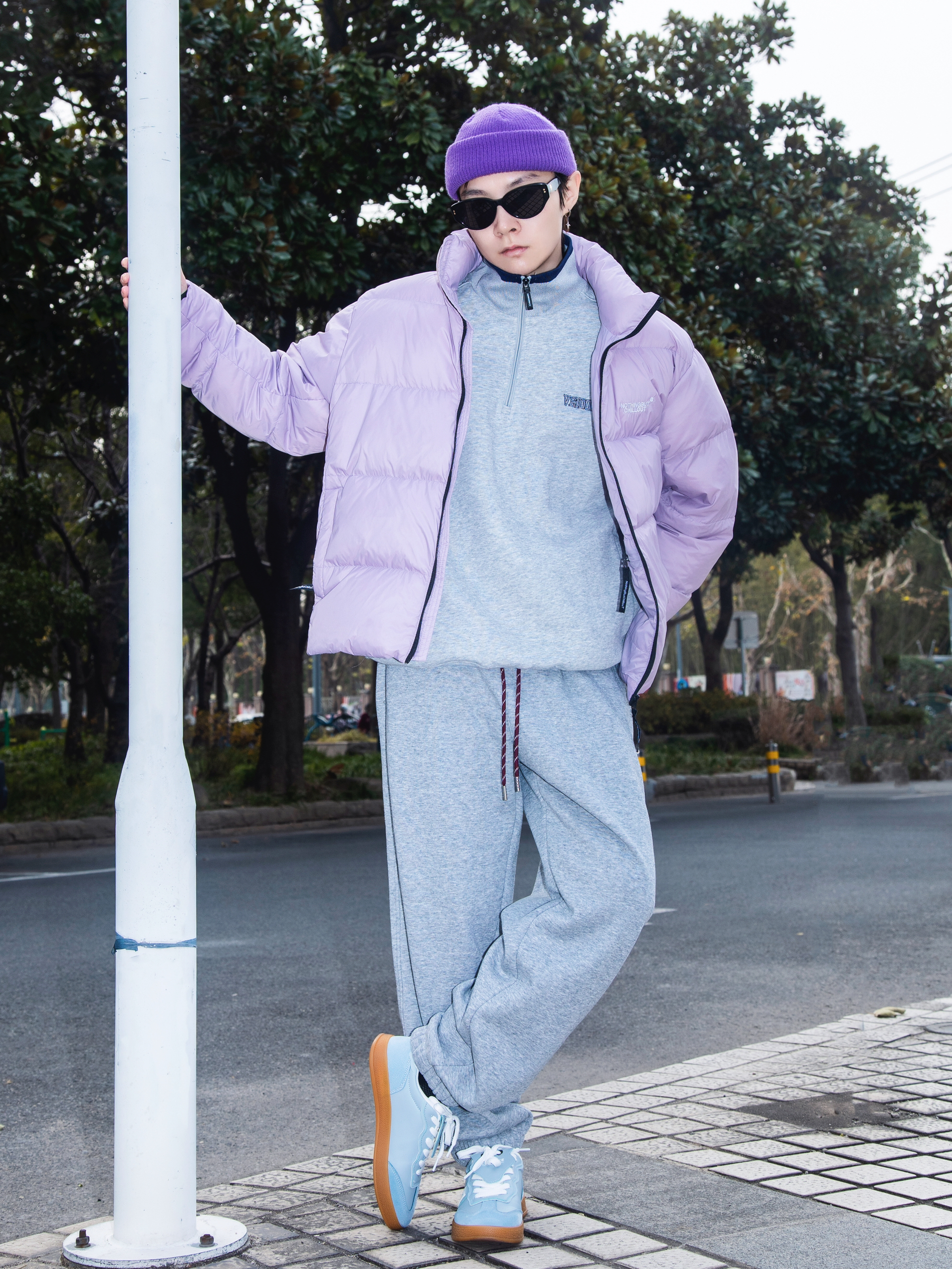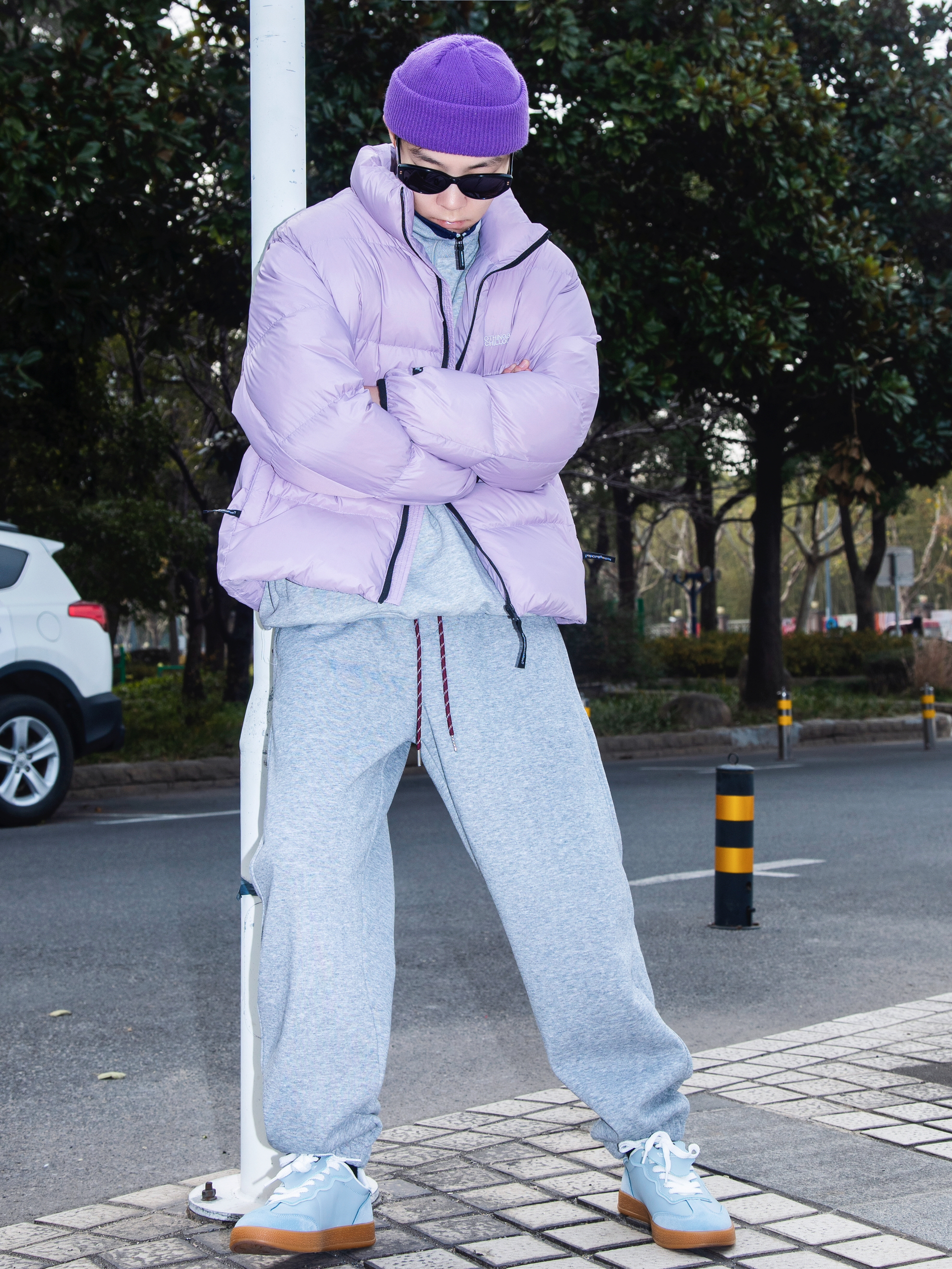 这个冬天离不开棉服和羽绒 分享一套浅色系排骨羽绒服穿搭 穿搭指南: 上身一件灰色立领卫衣 重磅加厚 把拉链拉起来 潮酷感十足 外搭一件紫色排骨羽绒服 又轻薄又保暖 再也不用担心臃肿过冬 下身一条灰色束脚卫裤 有垂感的版型自显高级 上脚一双中国航天跆拳道鞋 浅蓝配色 鞋身轻盈 牛津鞋底 上脚一整个简介复古味儿 戴一顶紫色冷帽呼应一下 这一套排骨精穿搭申请出战
