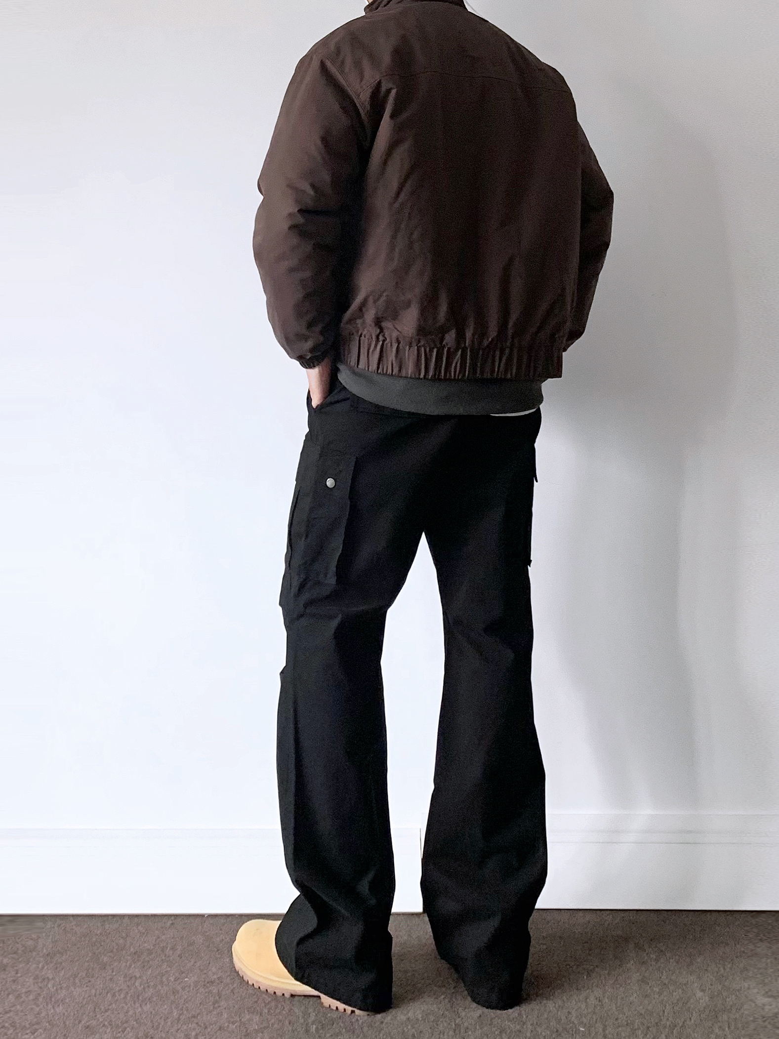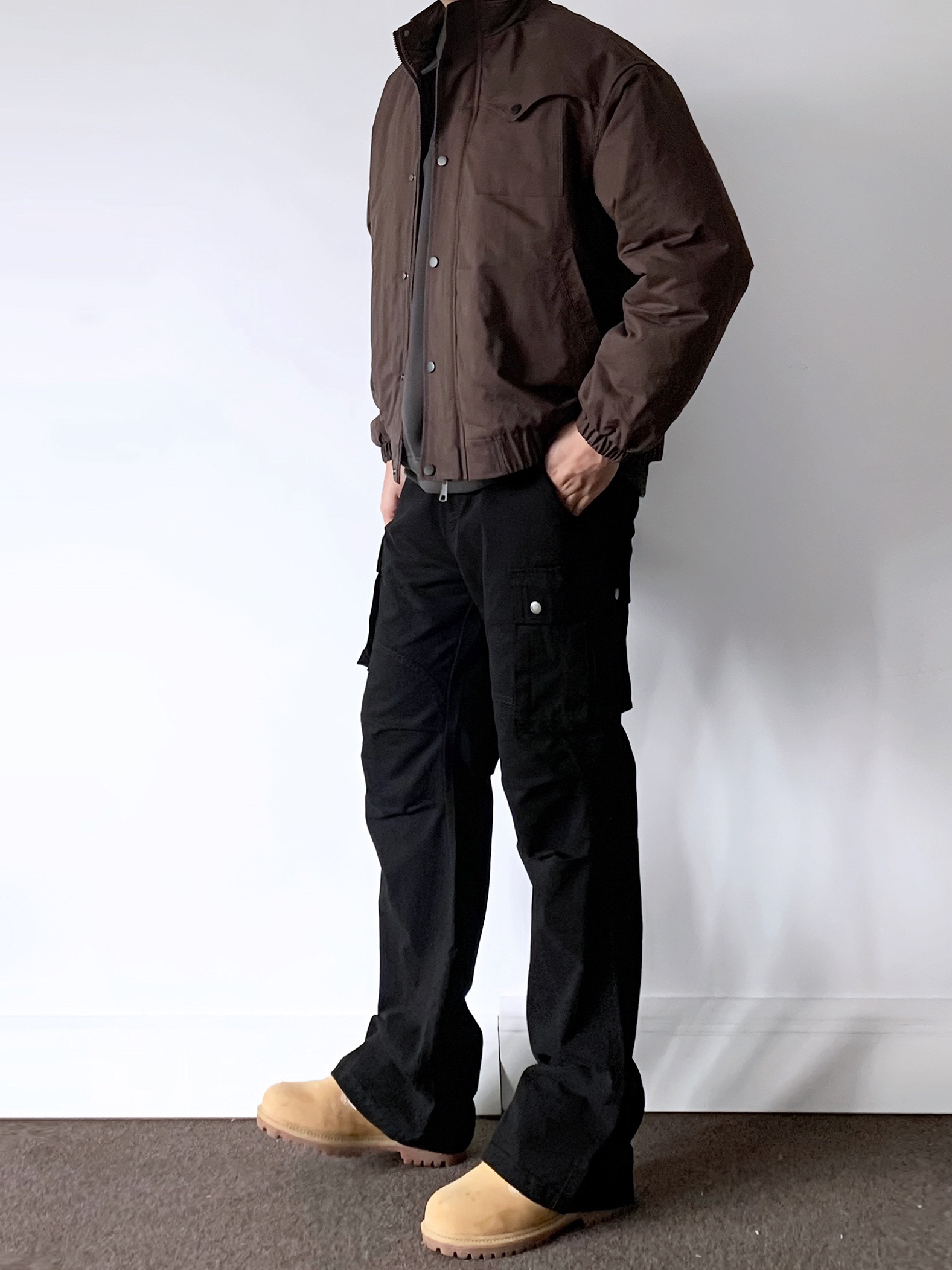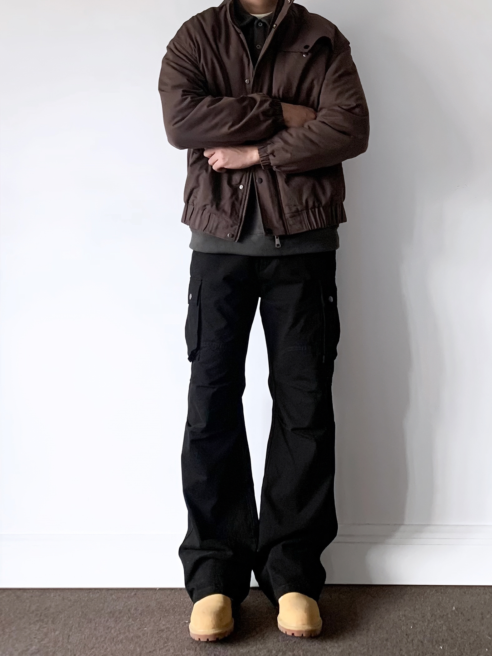 今日份OOTD: 咖色廓形立领棉服内搭灰色卫衣 搭配阔腿工装裤➕大黄靴 整体街头氛围感十足!利落帅气感Get~