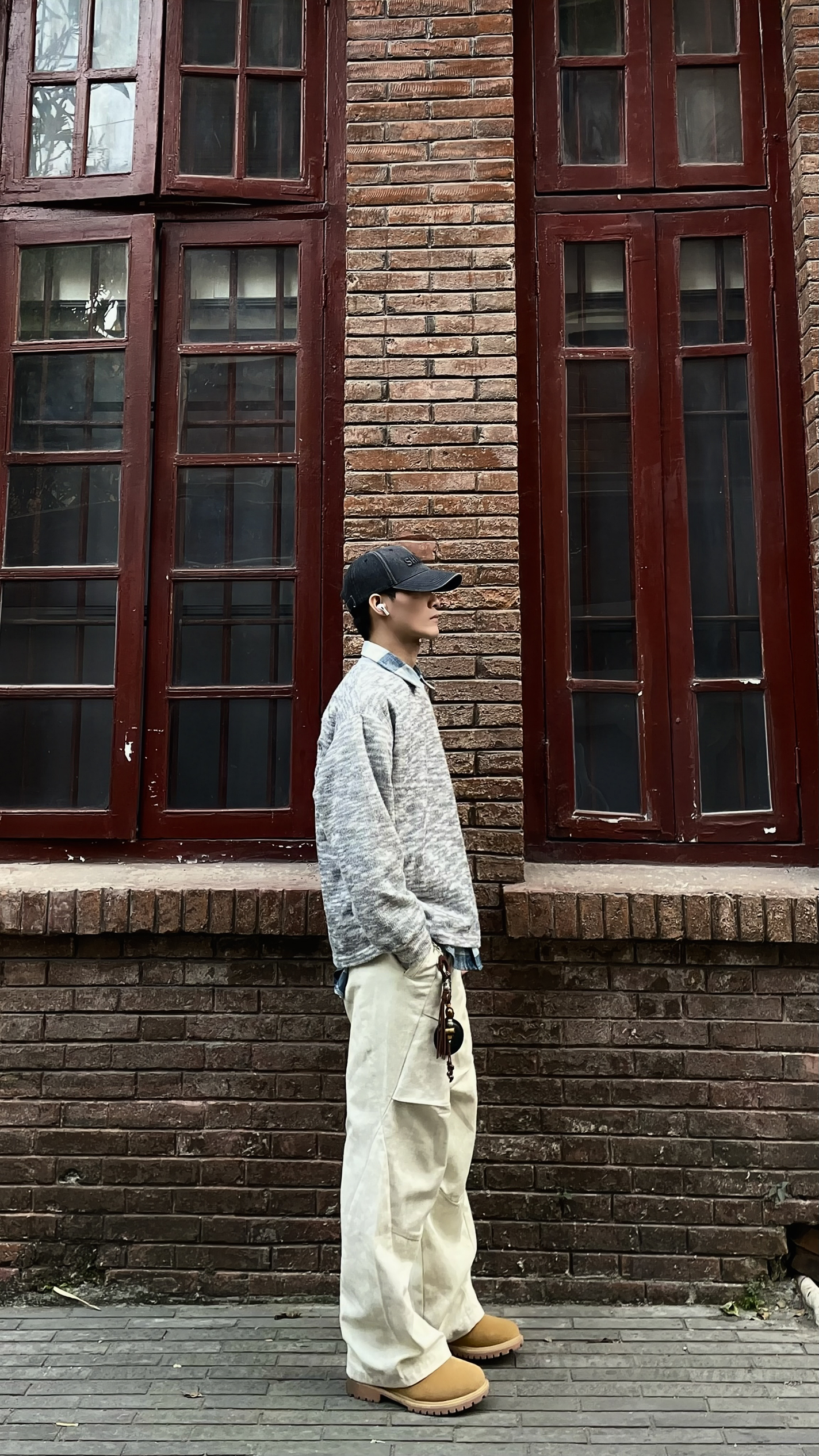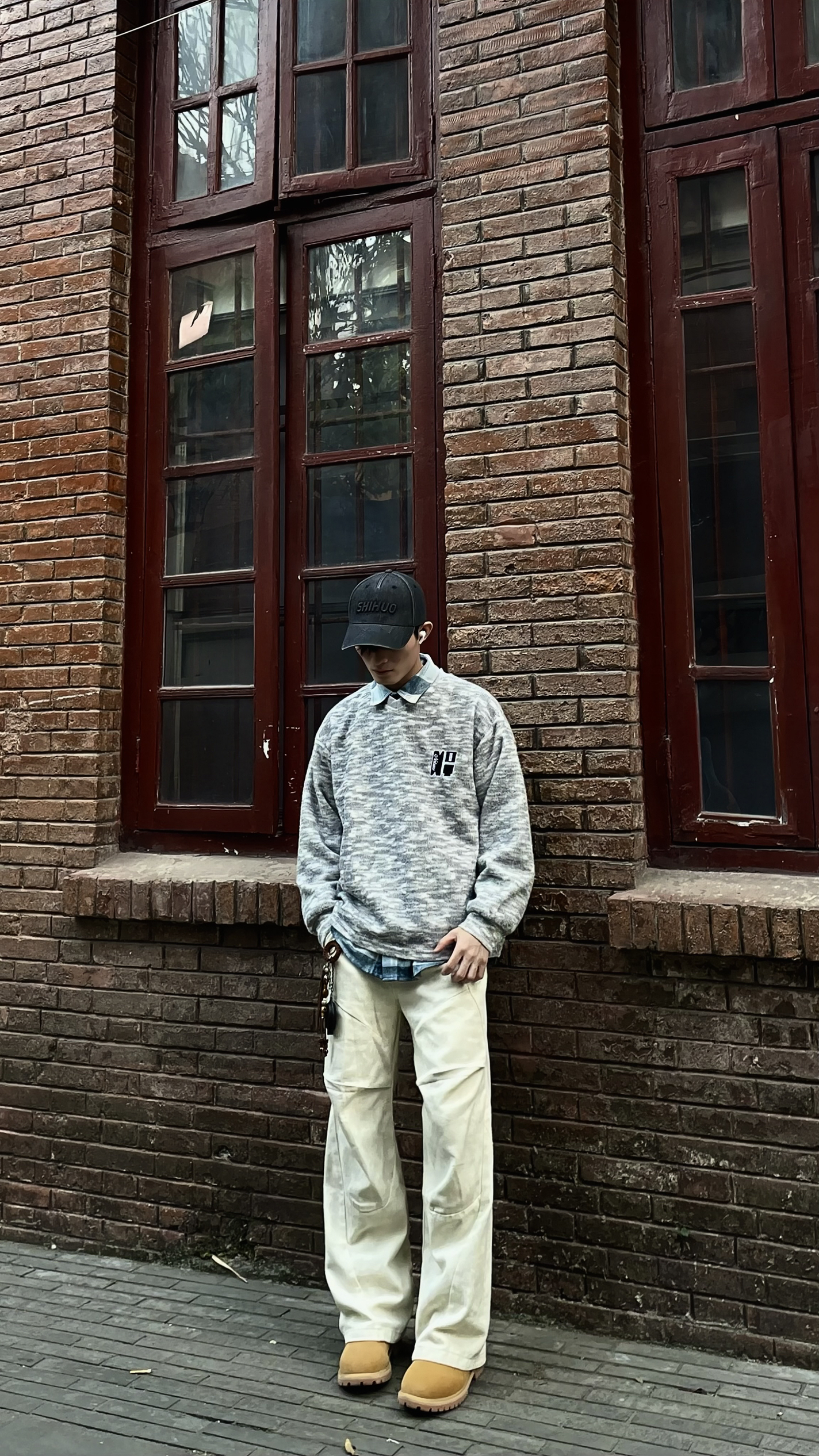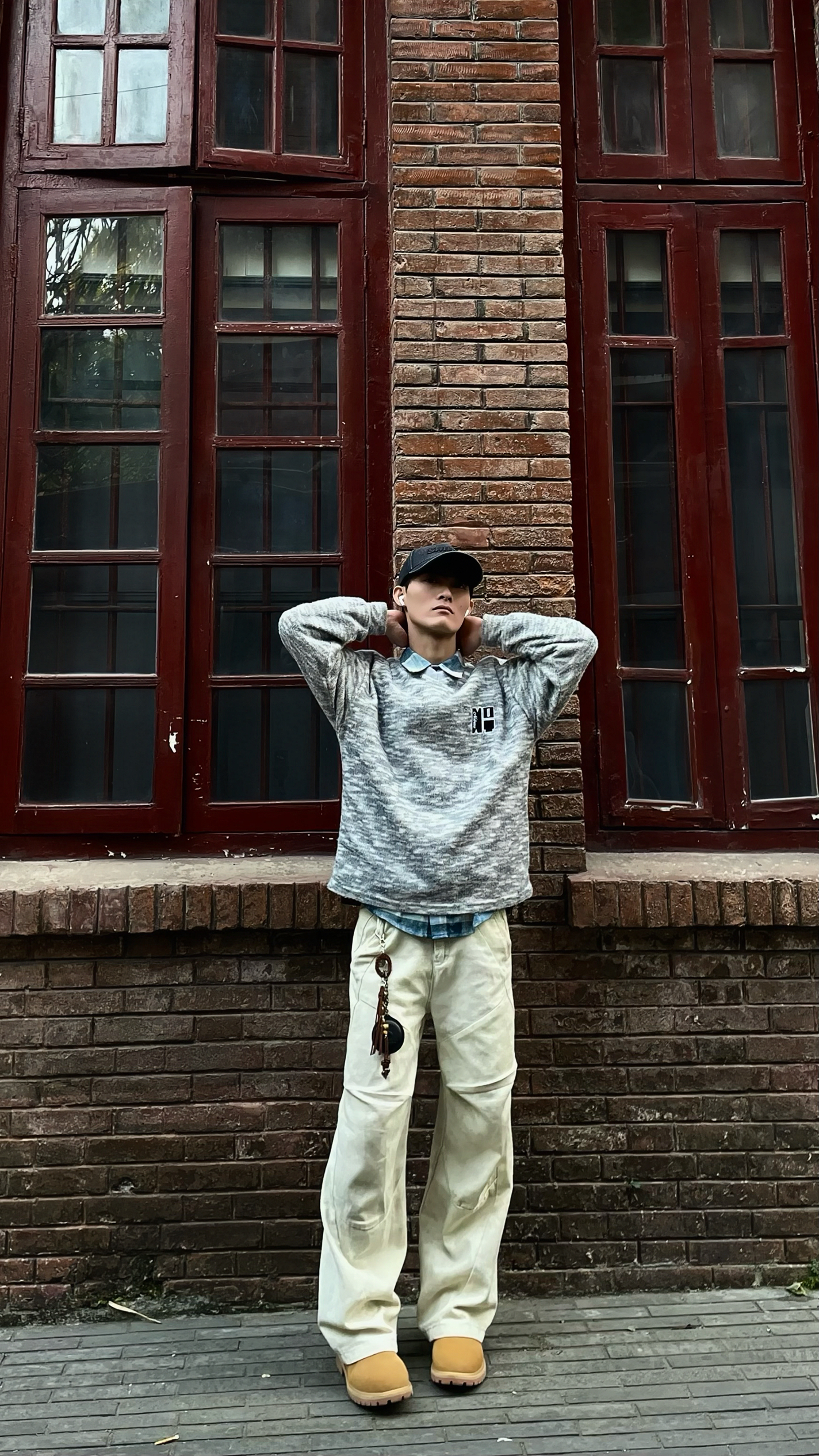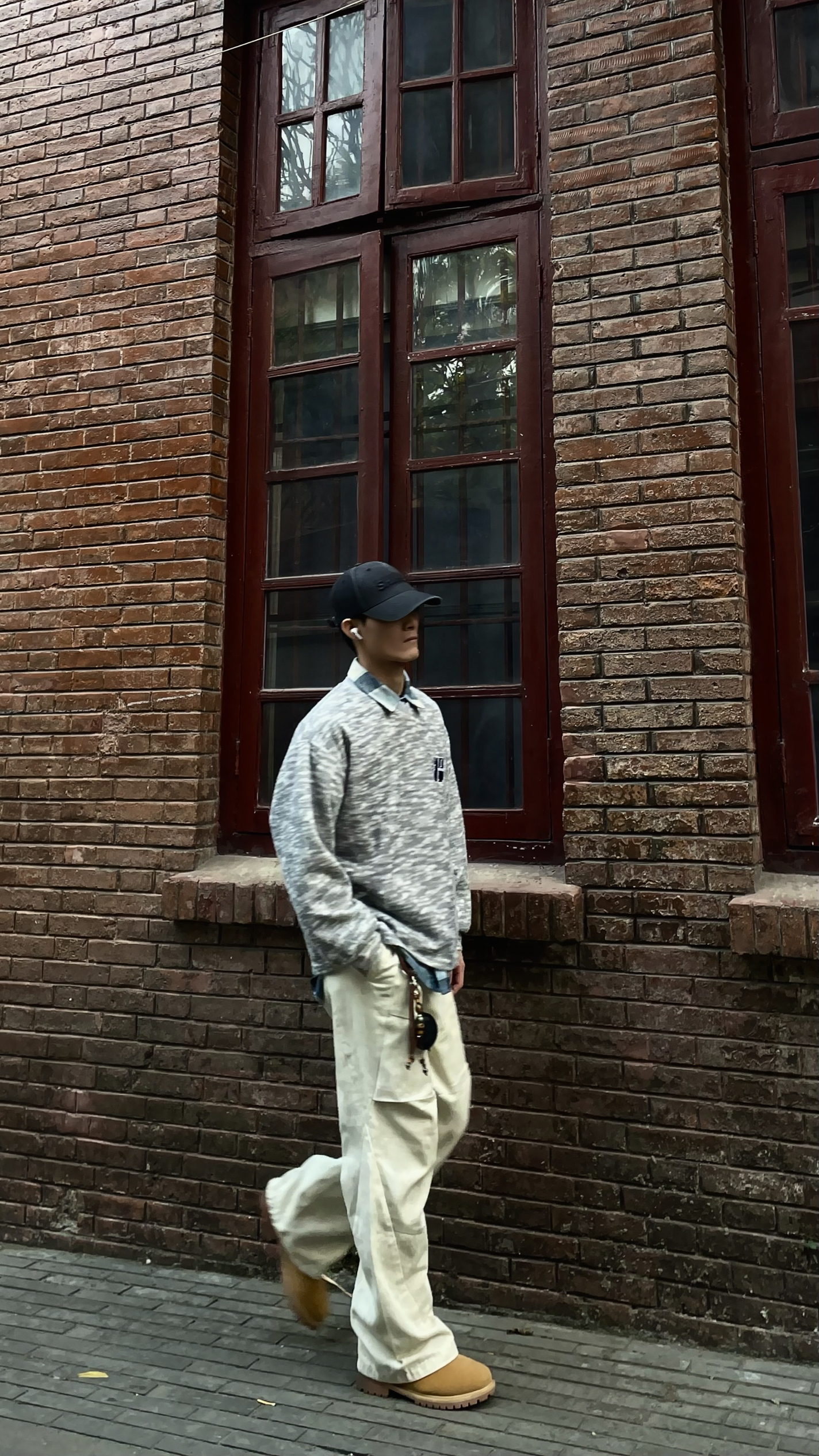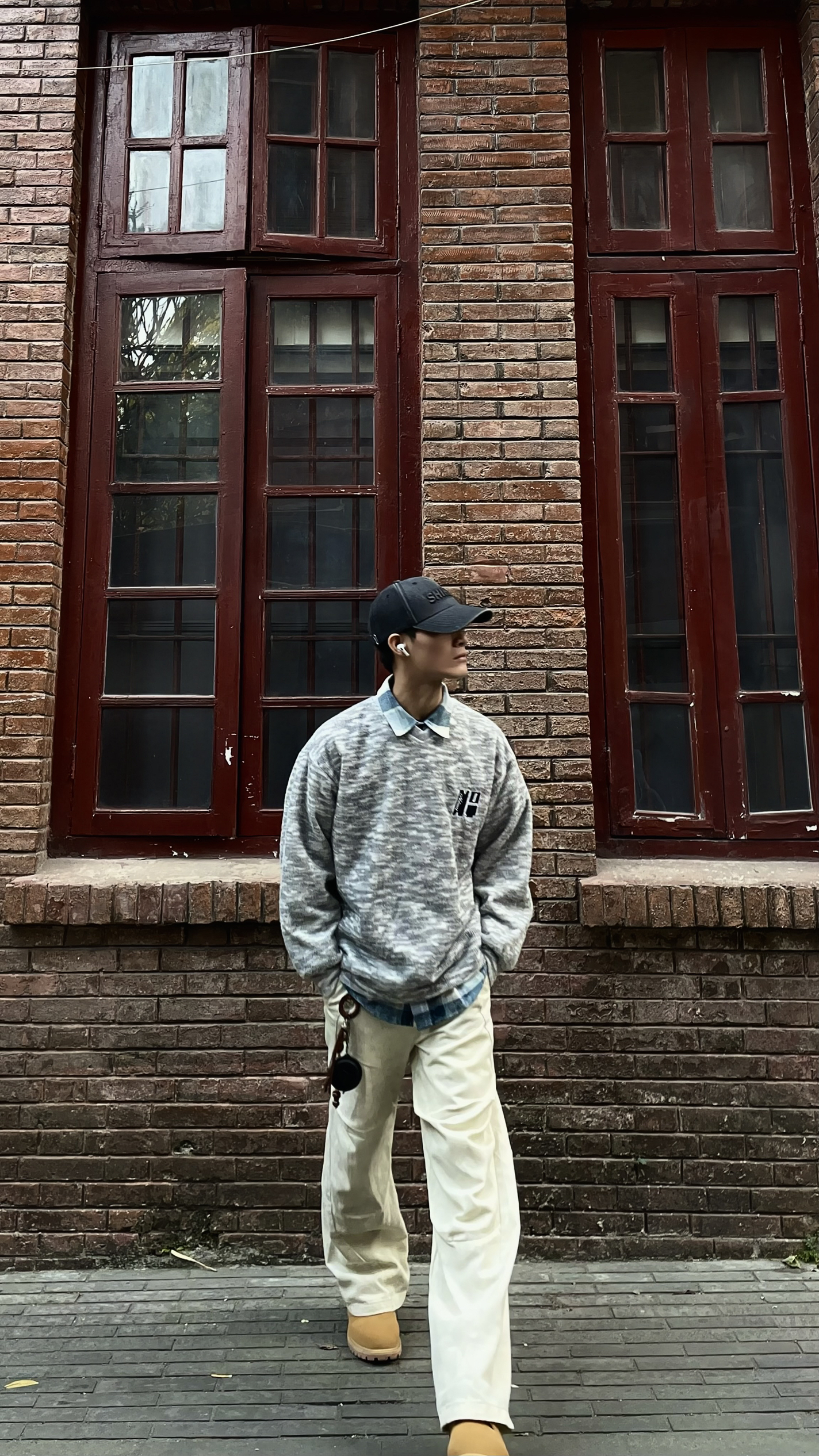 🎲冬日男生如何穿出慵懒感,赶紧学习这套2025开年Fitcheck🌬️ 🧑🏻🦱简单的介绍今天的穿搭[爱心_blue] 📸灰色毛绒感宽松V领毛衣➕米白色微喇工装裤 — — — — — — — — — — — — — — — ①OOTD 👔 No Tears 毛绒感宽松V领毛衣,胸前LOGO字母刺绣图案,落肩套头的简约款,整体美式复古学院风 — 👖ProMax 褶皱微喇牛仔裤,直筒拖地感的版型,...