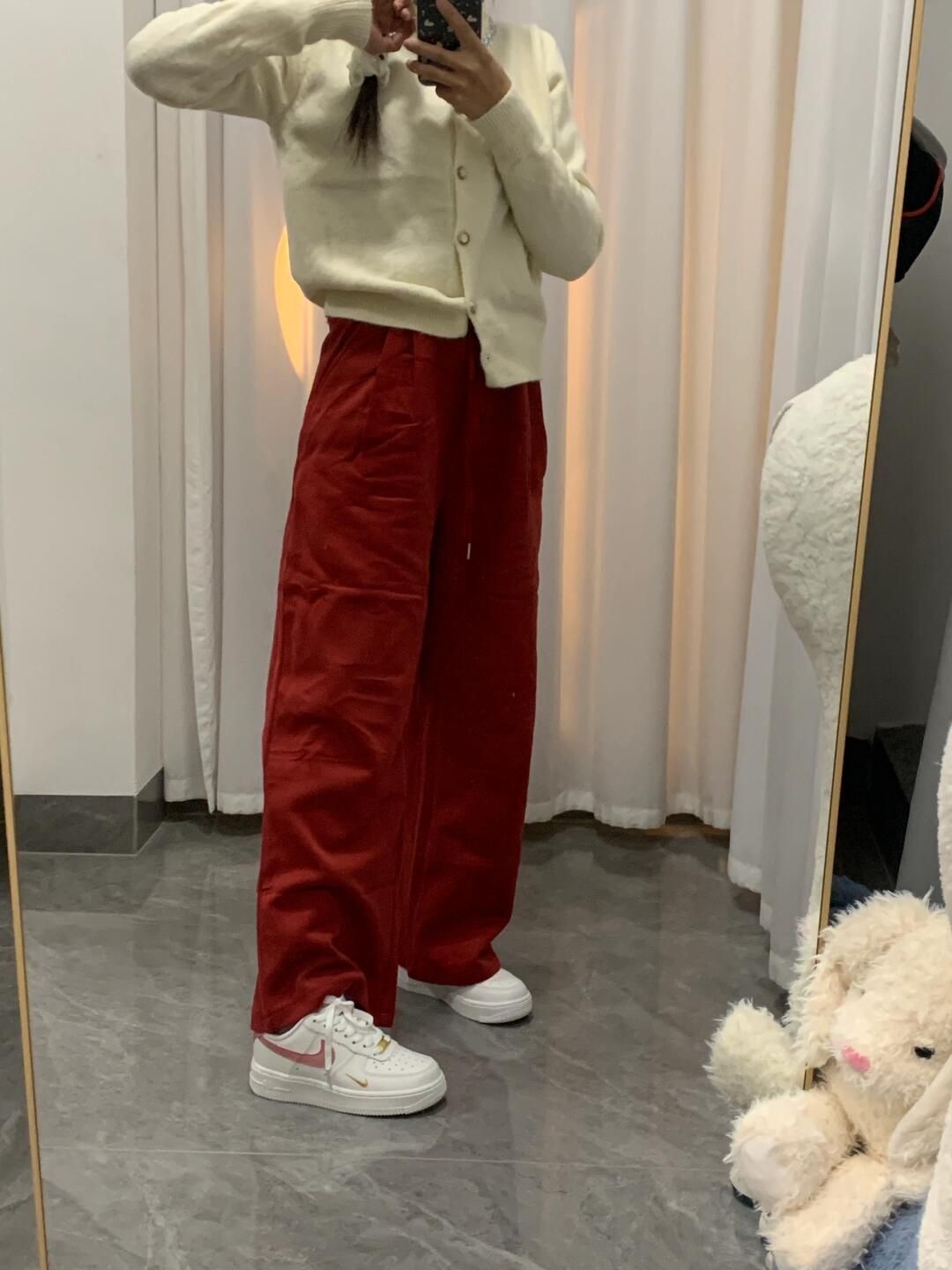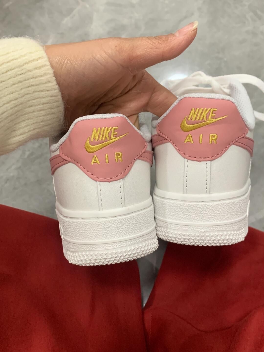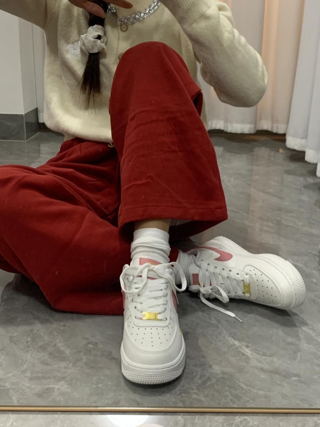 百搭空军这次居然出了白粉色 这个颜色夏天怎么能不爱? 整一个粉粉嫩嫩好可爱 冬天来了 我搭配了红色卫裤 竟然也是意外很喜庆好看 太有节日氛围感了 过年🧨也能喜气洋洋咯