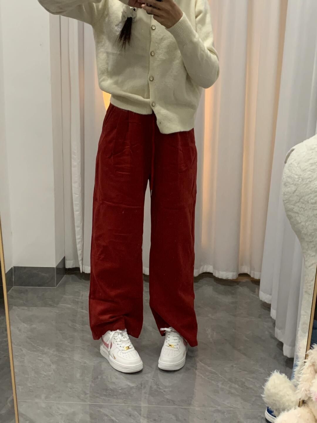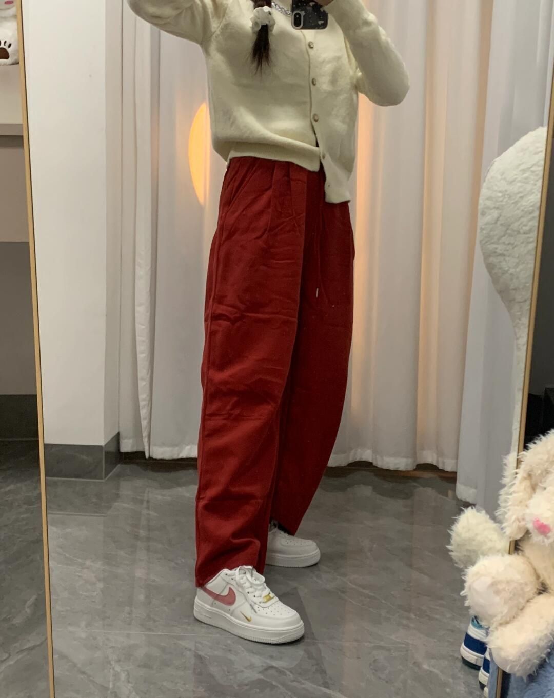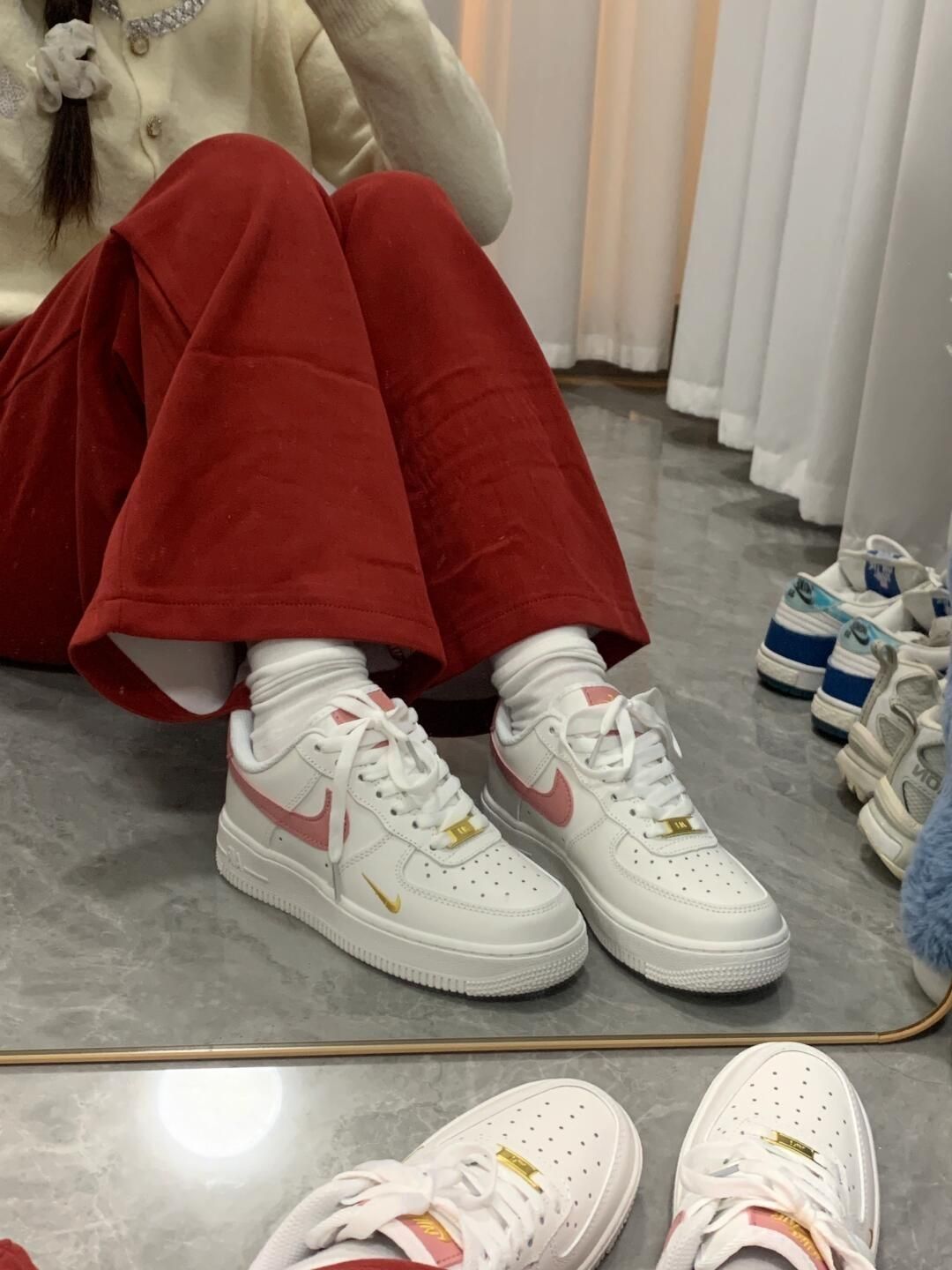 百搭空军这次居然出了白粉色 这个颜色夏天怎么能不爱? 整一个粉粉嫩嫩好可爱 冬天来了 我搭配了红色卫裤 竟然也是意外很喜庆好看 太有节日氛围感了 过年🧨也能喜气洋洋咯
