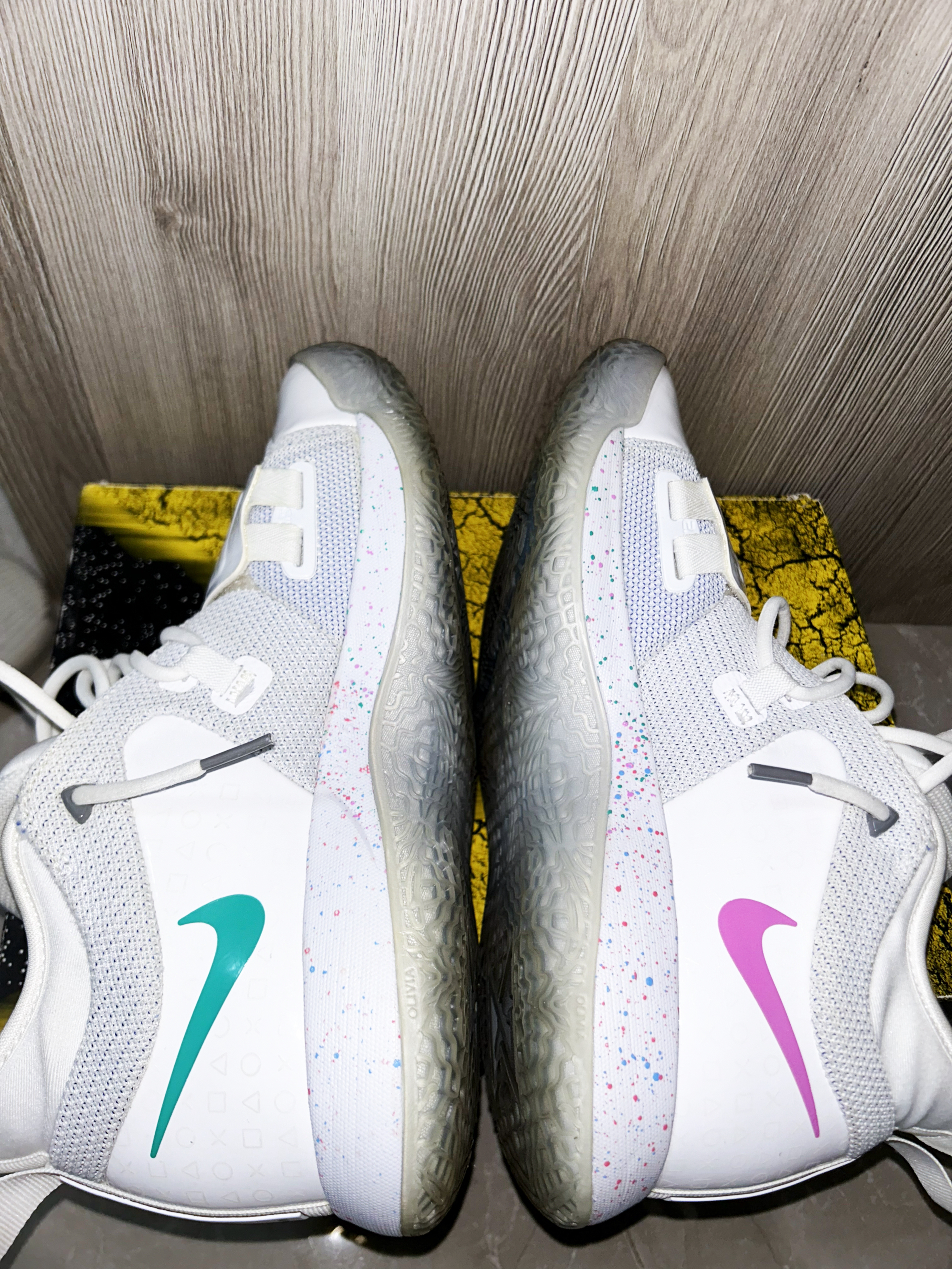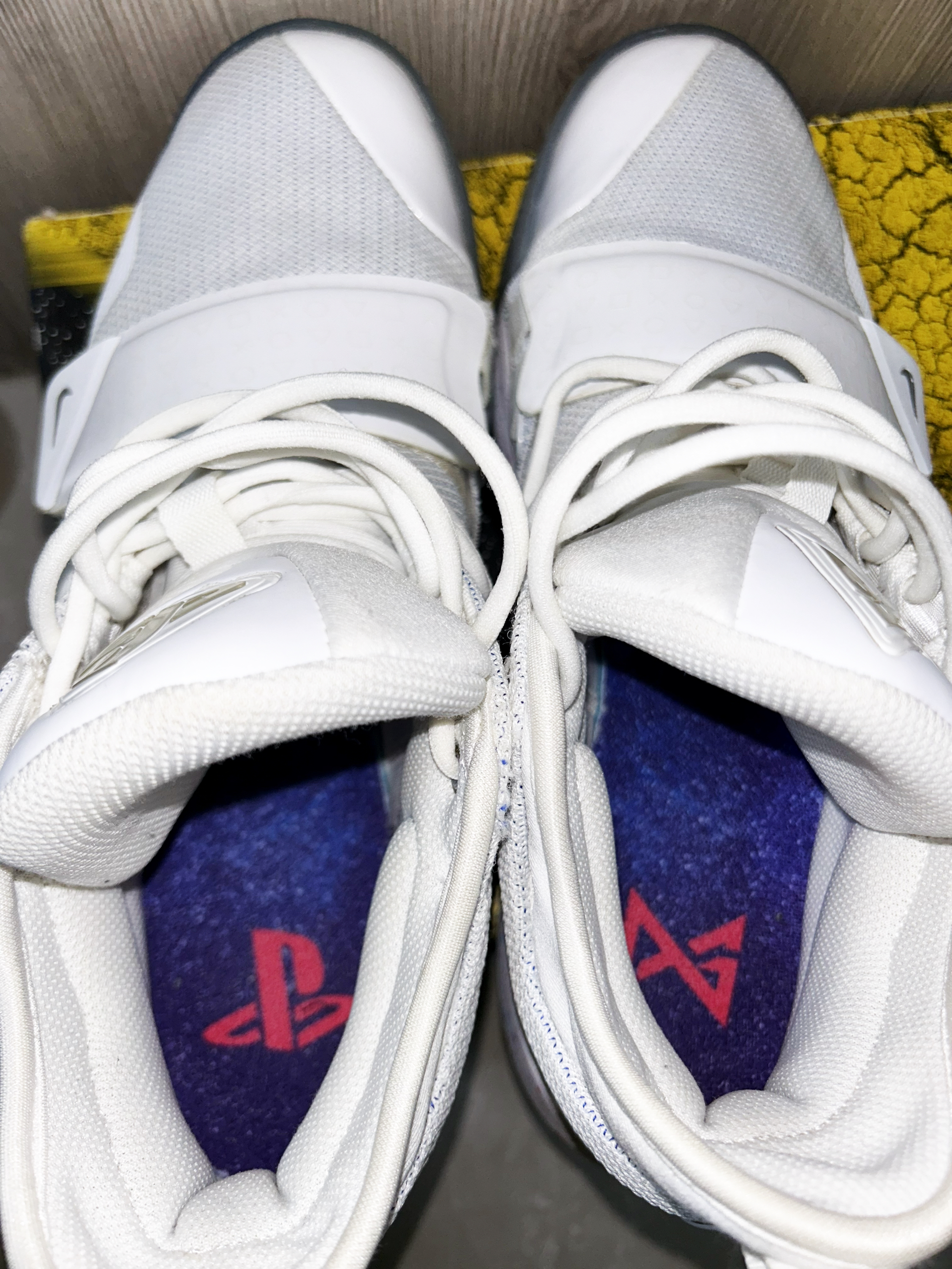 PG2.5的鞋型是我有史以来感觉最帅的鞋子,没有之一,前掌搭载了Zoom扇形气垫,鞋面也增加了魔术贴绑带设计,这双鞋的包裹我可以给到90分以上 这双PG2.5ps联名很有亮点,鞋子中底上有四个不同颜色的swooh代表了ps手柄的四个颜色,鞋子整体为白色,鞋舌上的保罗乔治个人logo设计为了很有趣味的可以开关的氛围灯,鞋垫图案也类似星空,上脚颜值也非常高,类似宇航服的感觉