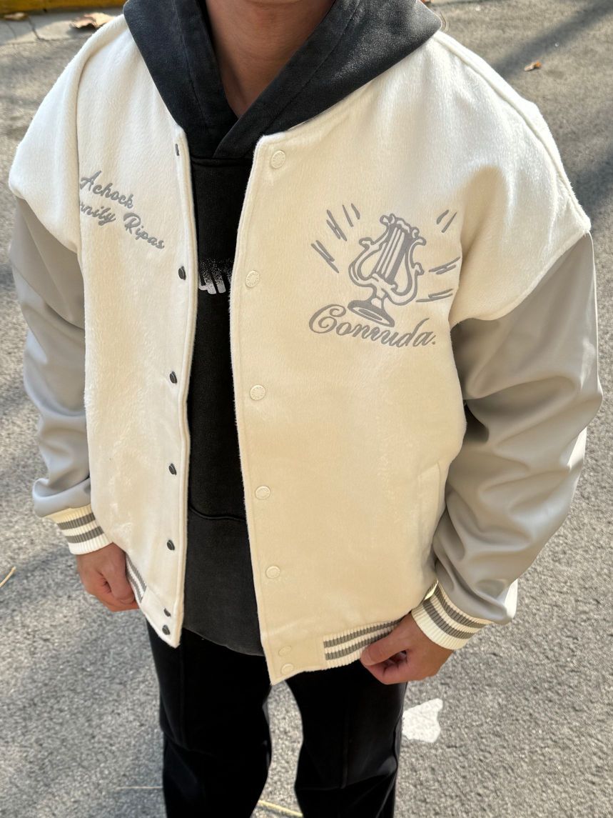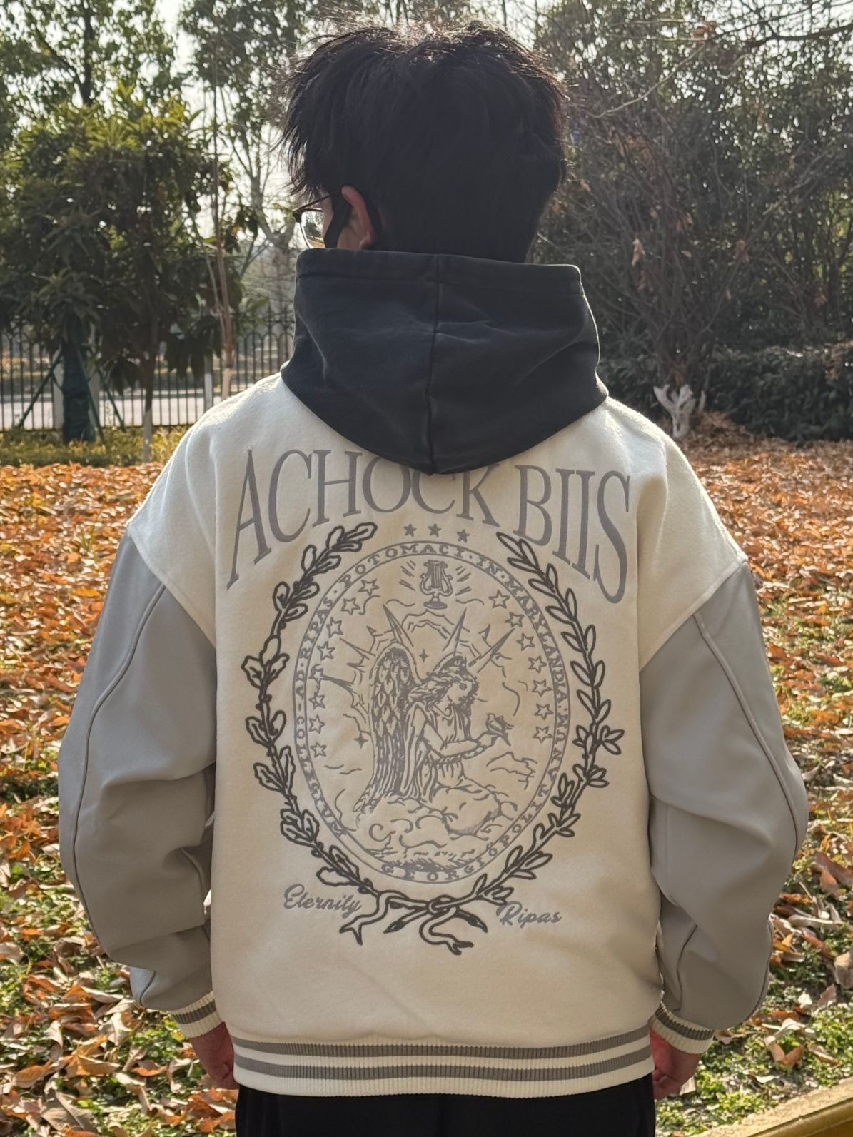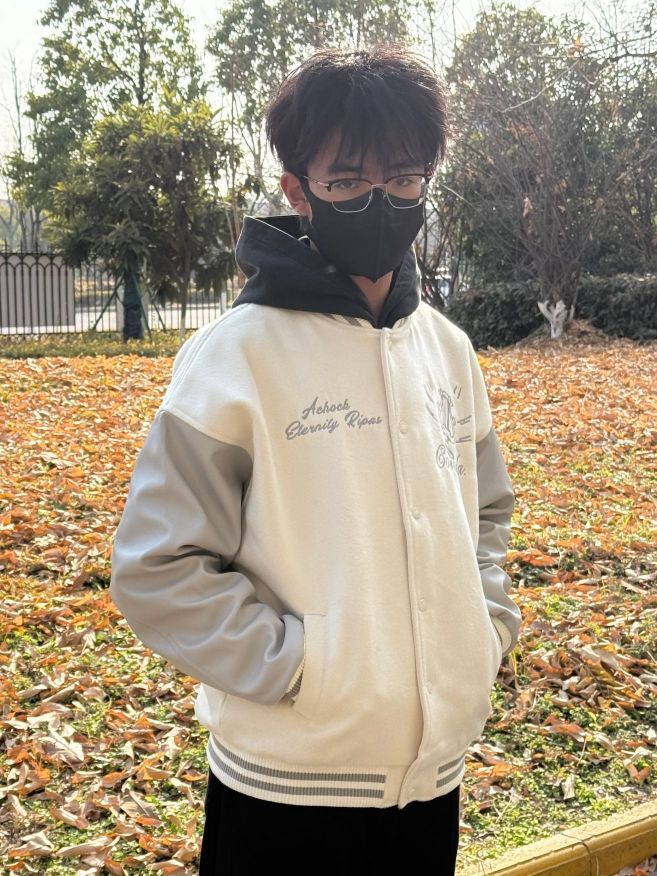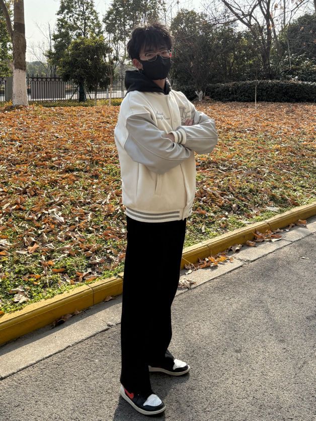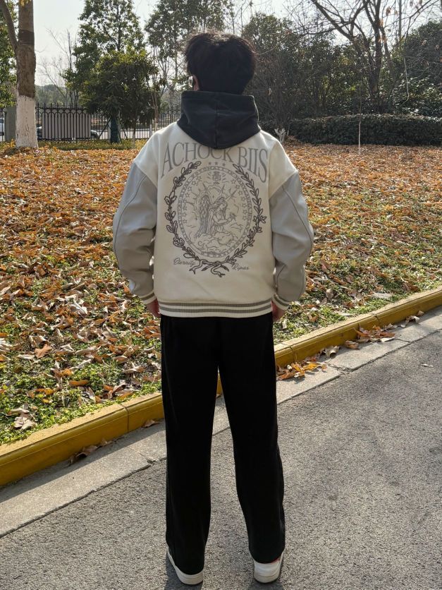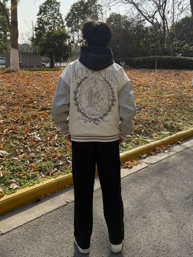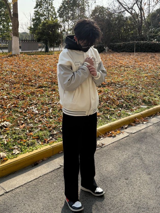 🧍♂️ 穿搭风格:美式街头风 👔 上衣:a chock白色印花棒球服 背后巨大印花彰显街头氛围✔️ 拼接皮质 美感爆棚😍 加绒设计冬天穿也不会冷🔥 👖 下装:黑色休闲直筒裤 修身百搭 街头风必备 👟 鞋子:经典aj1 百搭板鞋 经典永不落幕
