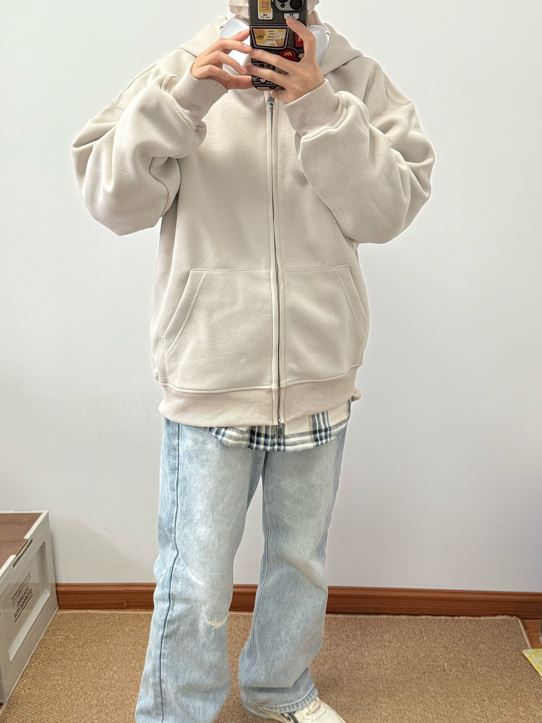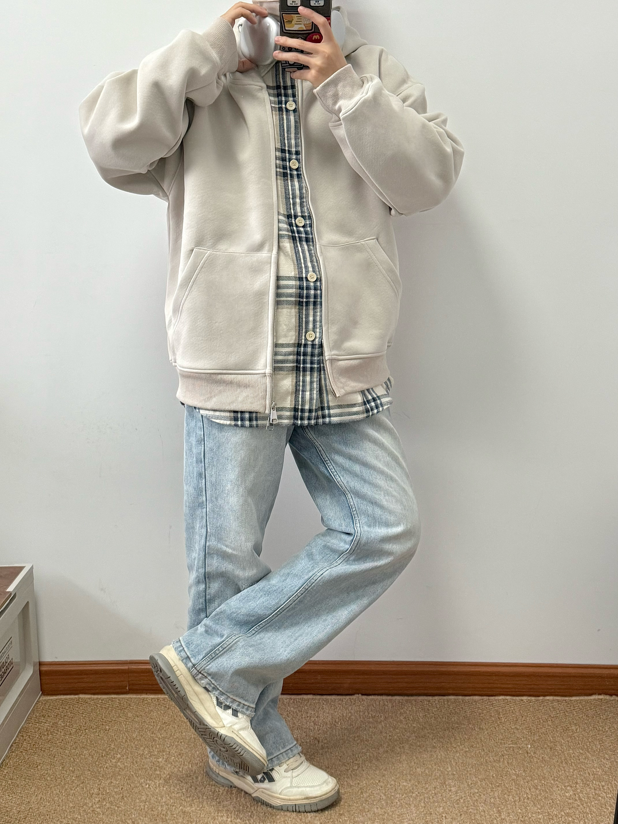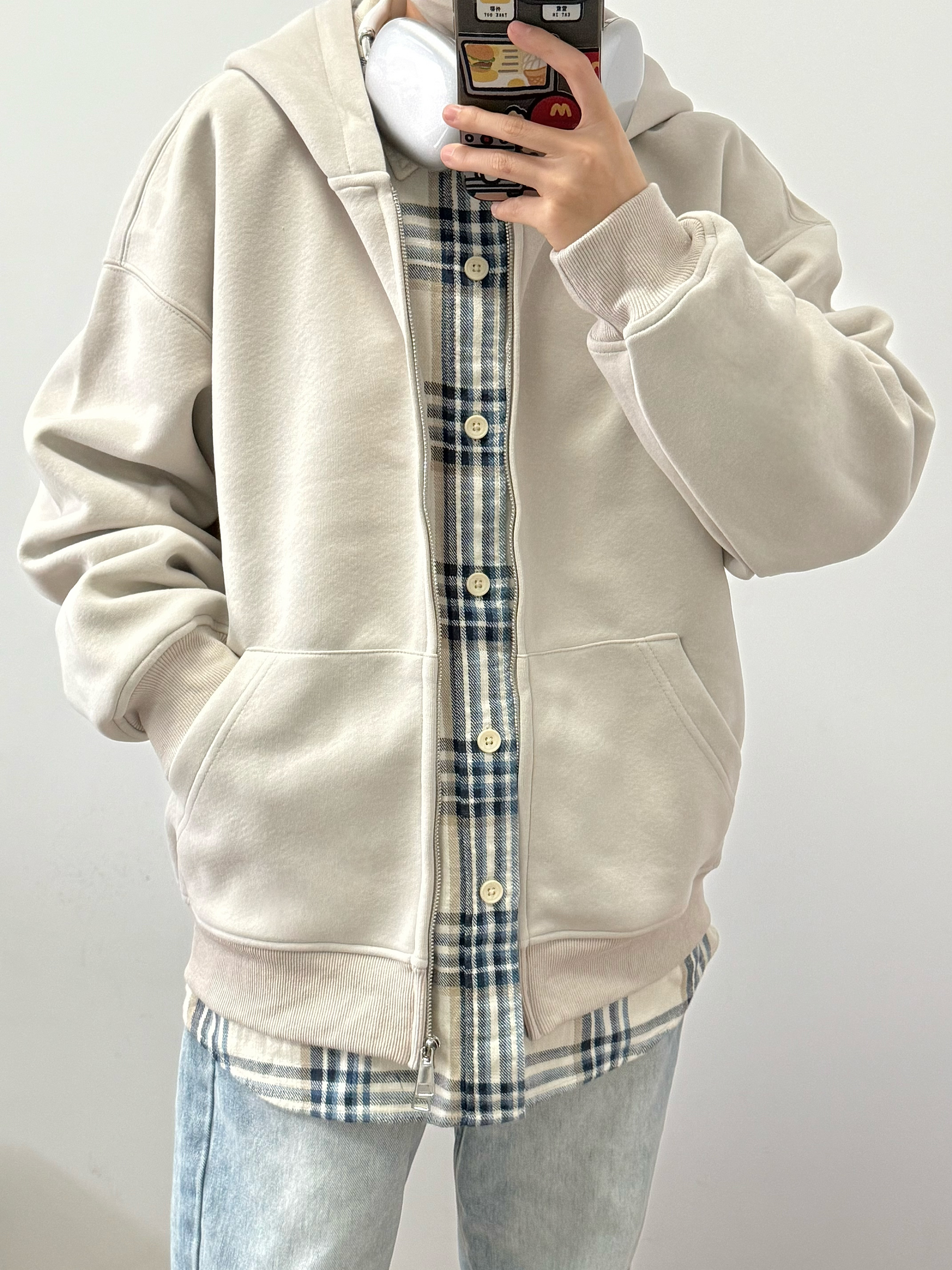 浅杏色外套搭配蓝色牛仔裤 内里加绒加厚 上身很暖和 纯色款很百搭 经典永不过时 内搭格子衬衫 少年感十足 日常通勤必备 纯色也能很有质感 👔:BEETLE TOWN