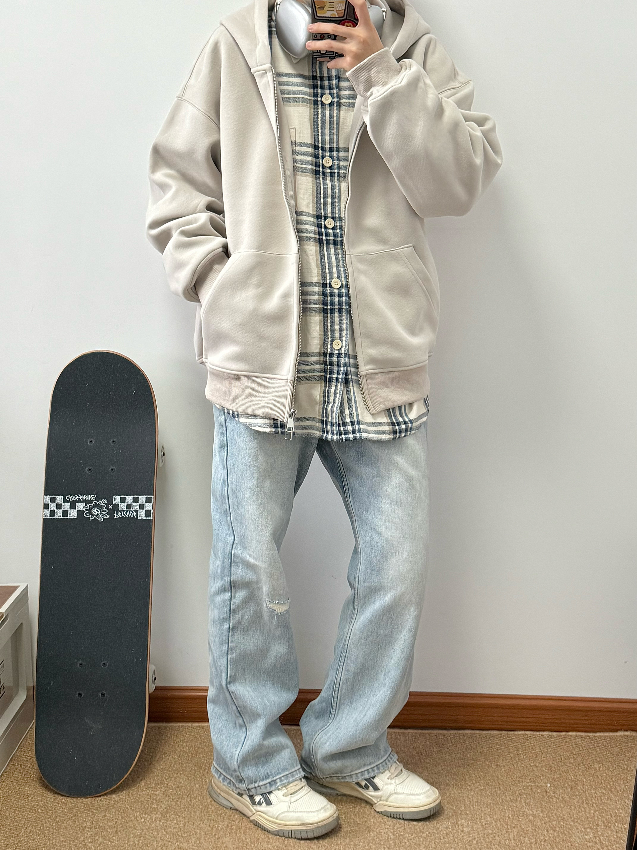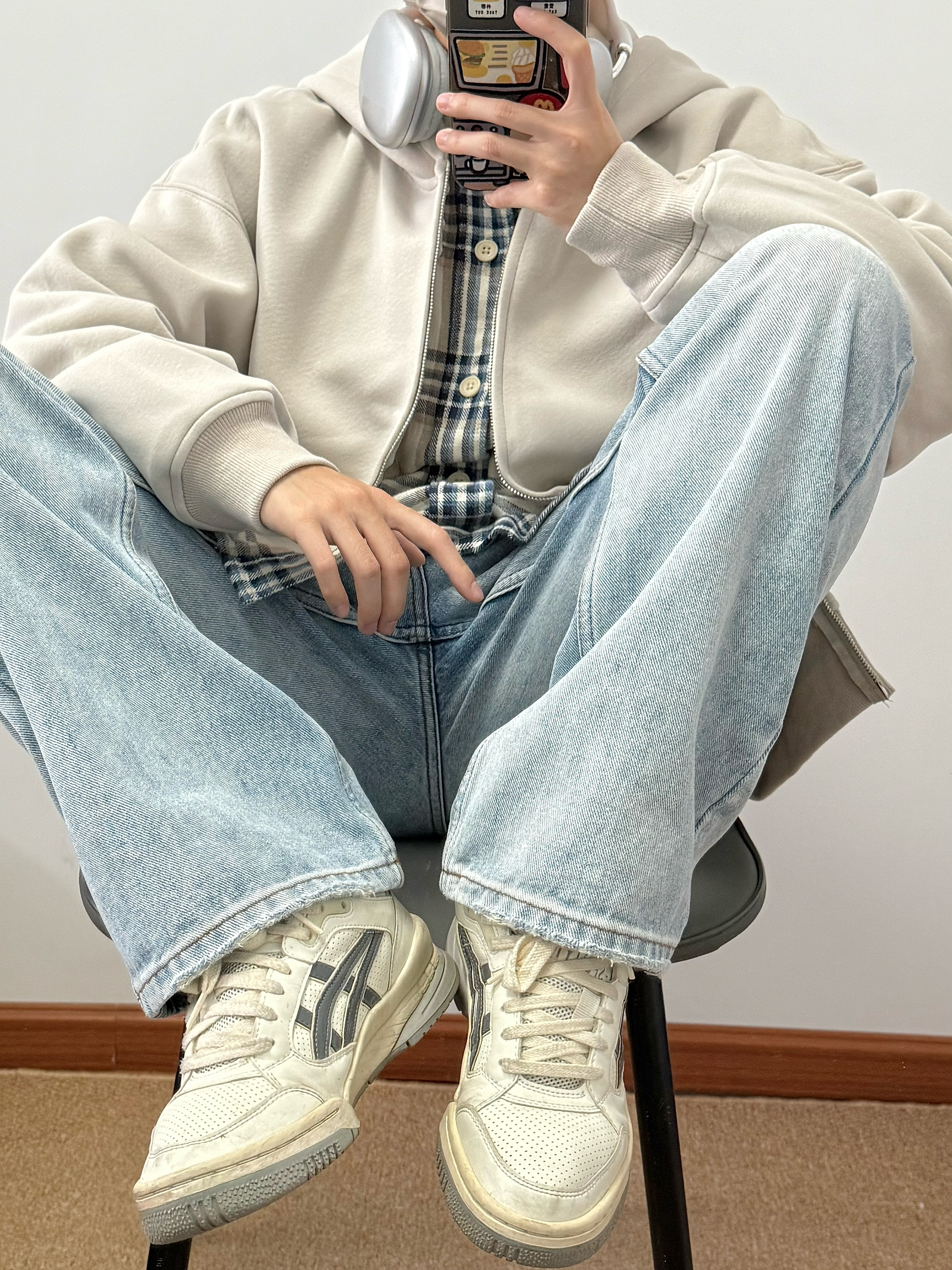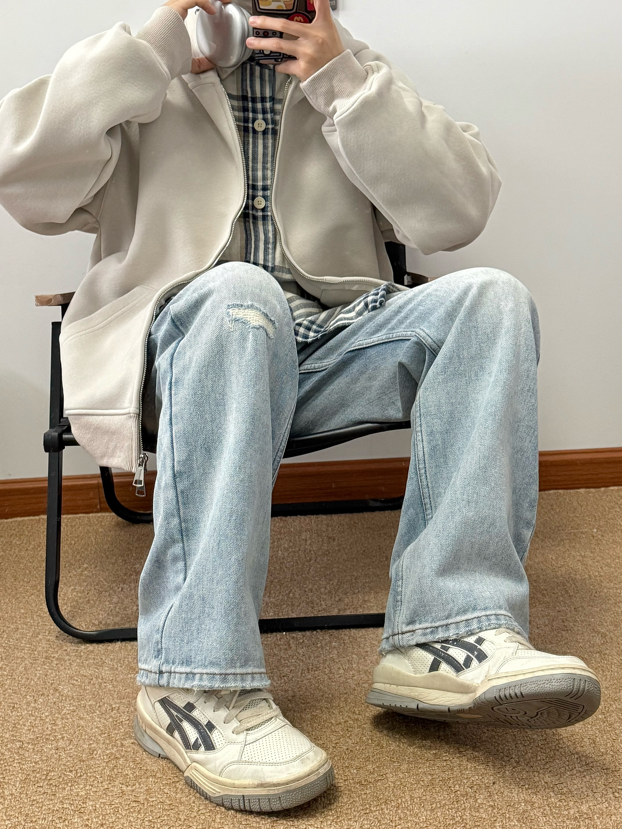 浅杏色外套搭配蓝色牛仔裤 内里加绒加厚 上身很暖和 纯色款很百搭 经典永不过时 内搭格子衬衫 少年感十足 日常通勤必备 纯色也能很有质感 👔:BEETLE TOWN