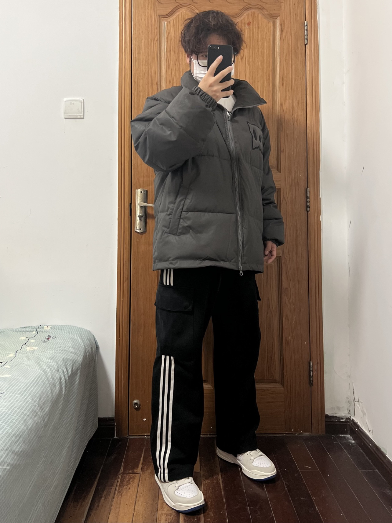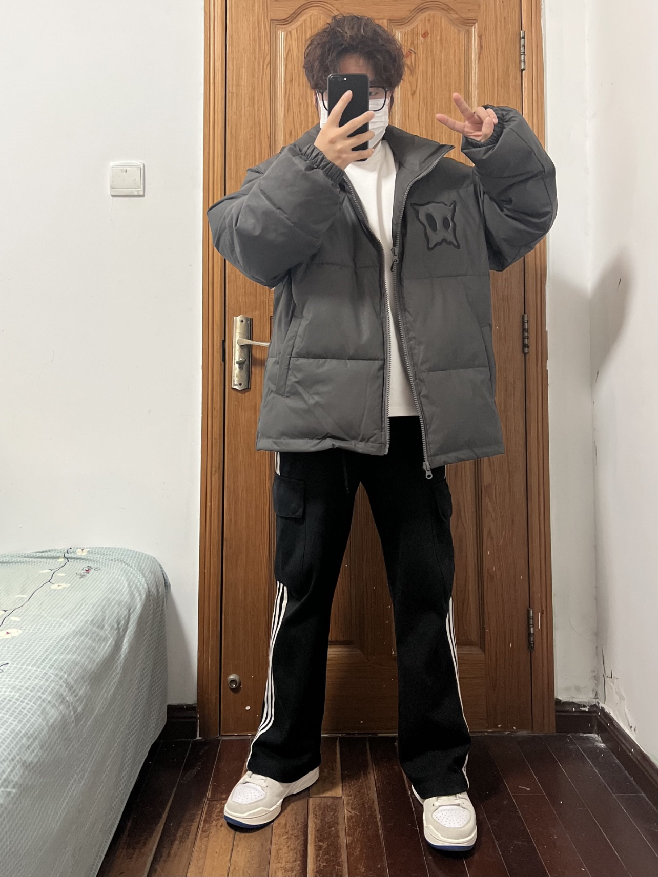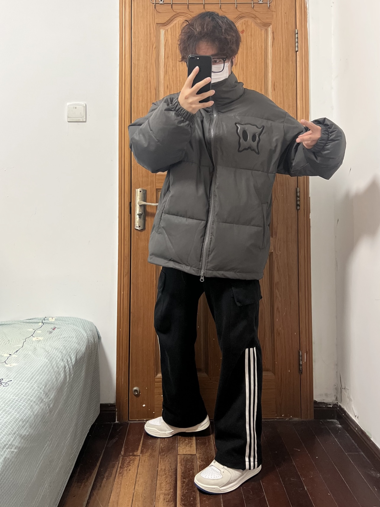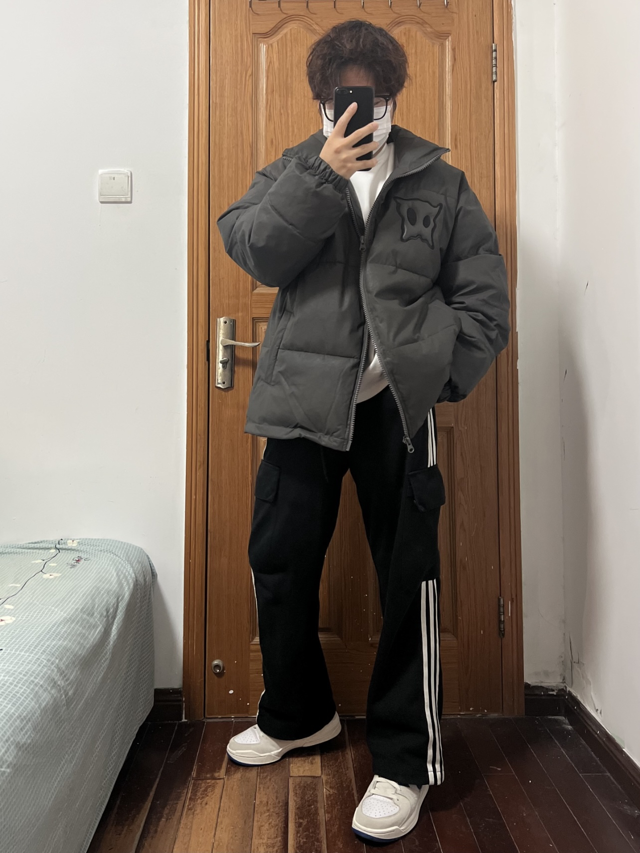 今日份穿搭分享🎉 DANGEROUSPEOPLE 小眼睛深灰棉服 怎么拒绝黑白灰呢❓就是男生最帅的颜色 皮质面料看起来就很有质感了别说穿着啦🉑️ 胸口的立体骷髅💀纸袋人logo超帅万圣节属性 怎么帅DSP不用教它都懂我啊 内搭一件白色长袖T很简单还没学会吗✌️ 裤子就选黑色长裤和白色运动鞋就OK 👔 DANGEROUSPEOPLE 👖 黑色长裤 👟 NIKE 🙋♂️ 170/120斤 L...