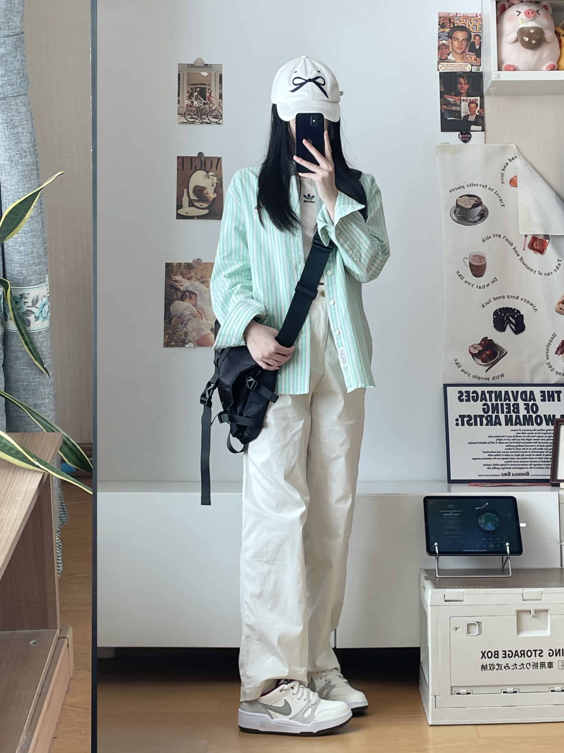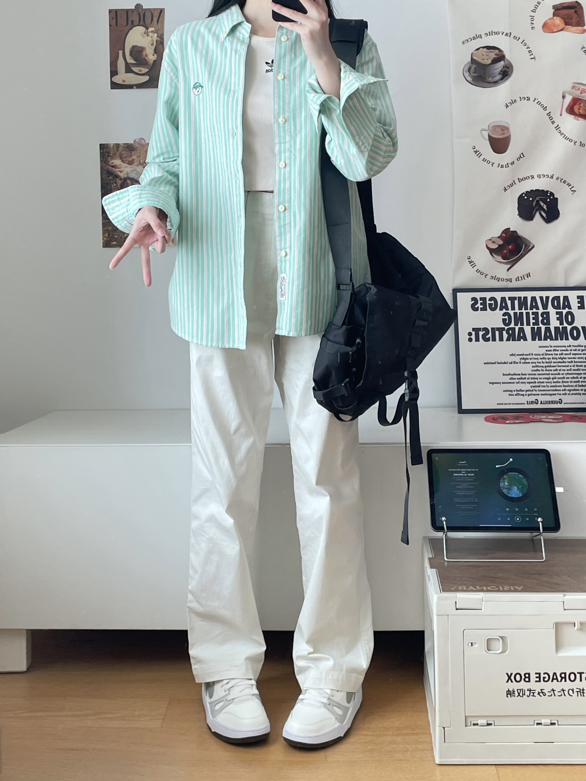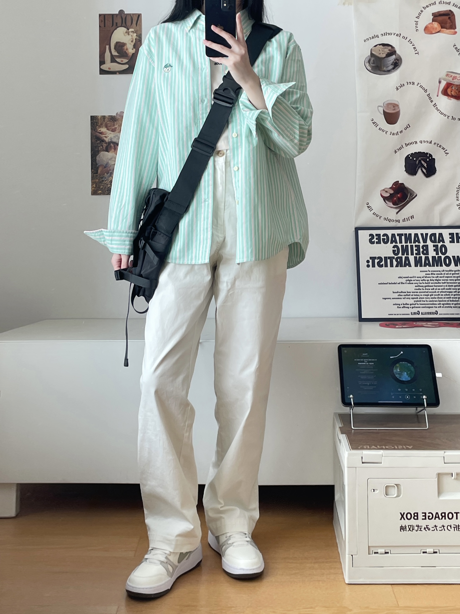 奶绿薄荷系的一天 阳光好好穿点彩色系! 浅绿条纹衬衫+白色休闲裤 配上我的蛇年Force 元气生命力的一套~