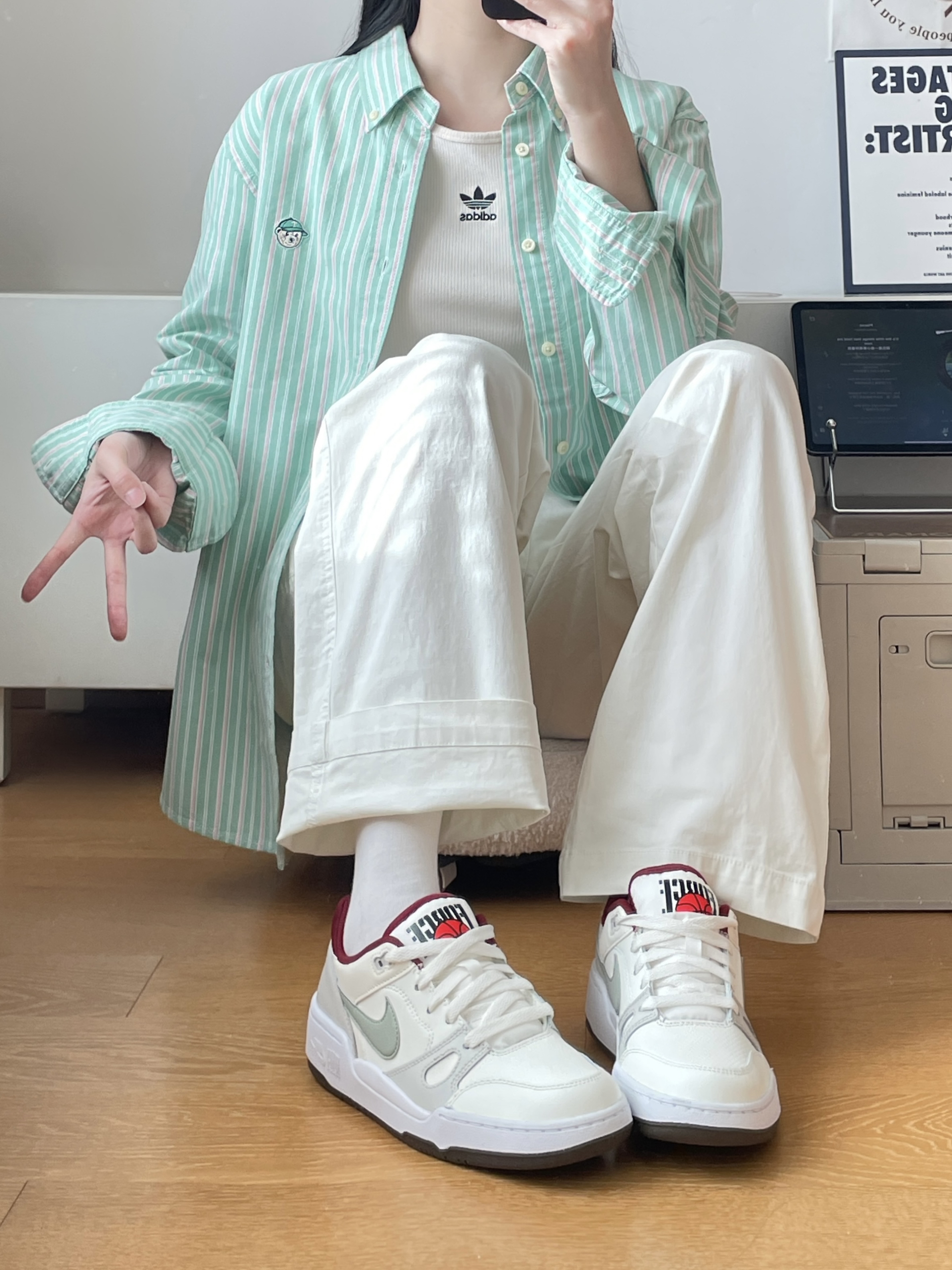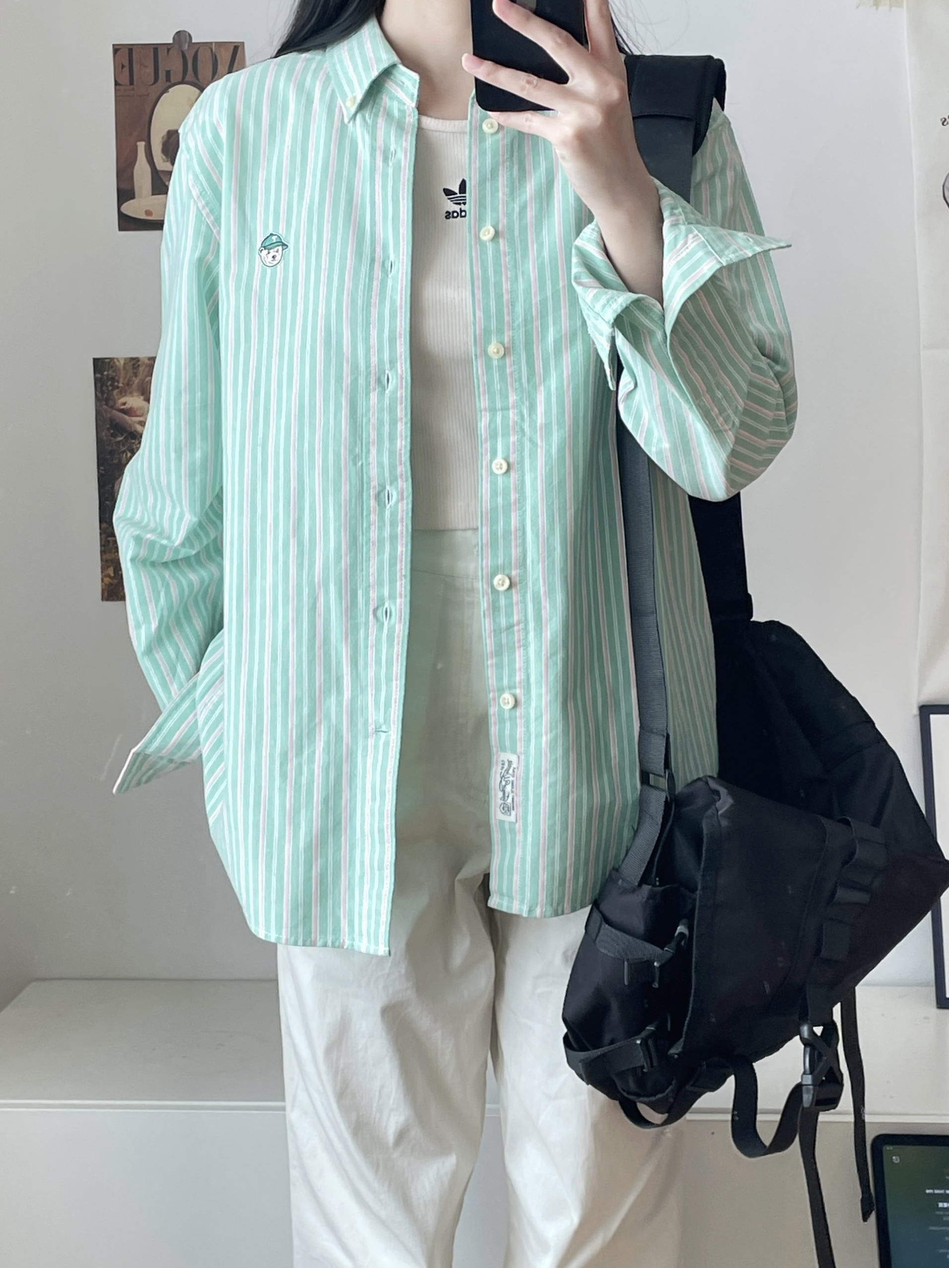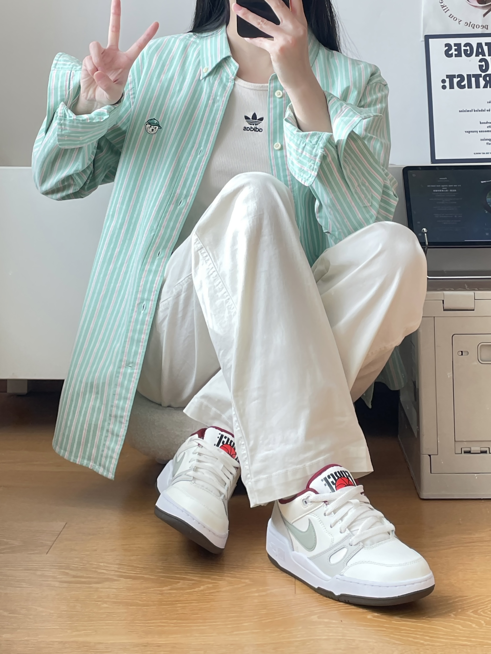 奶绿薄荷系的一天 阳光好好穿点彩色系! 浅绿条纹衬衫+白色休闲裤 配上我的蛇年Force 元气生命力的一套~