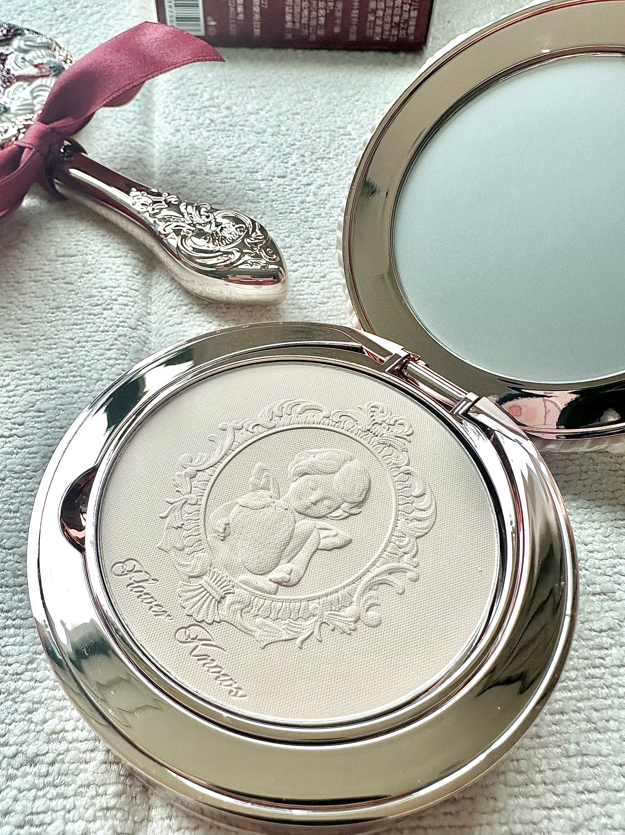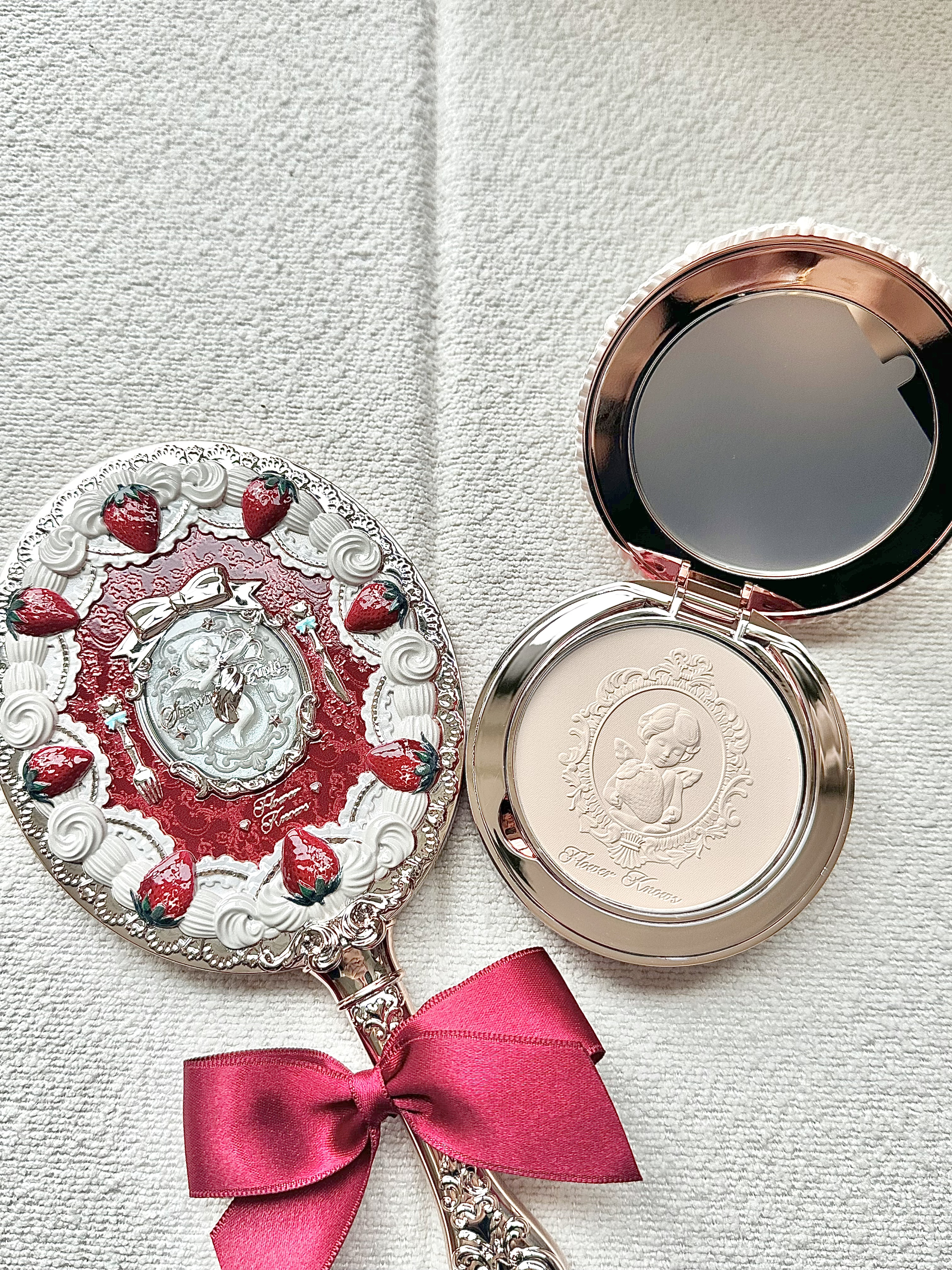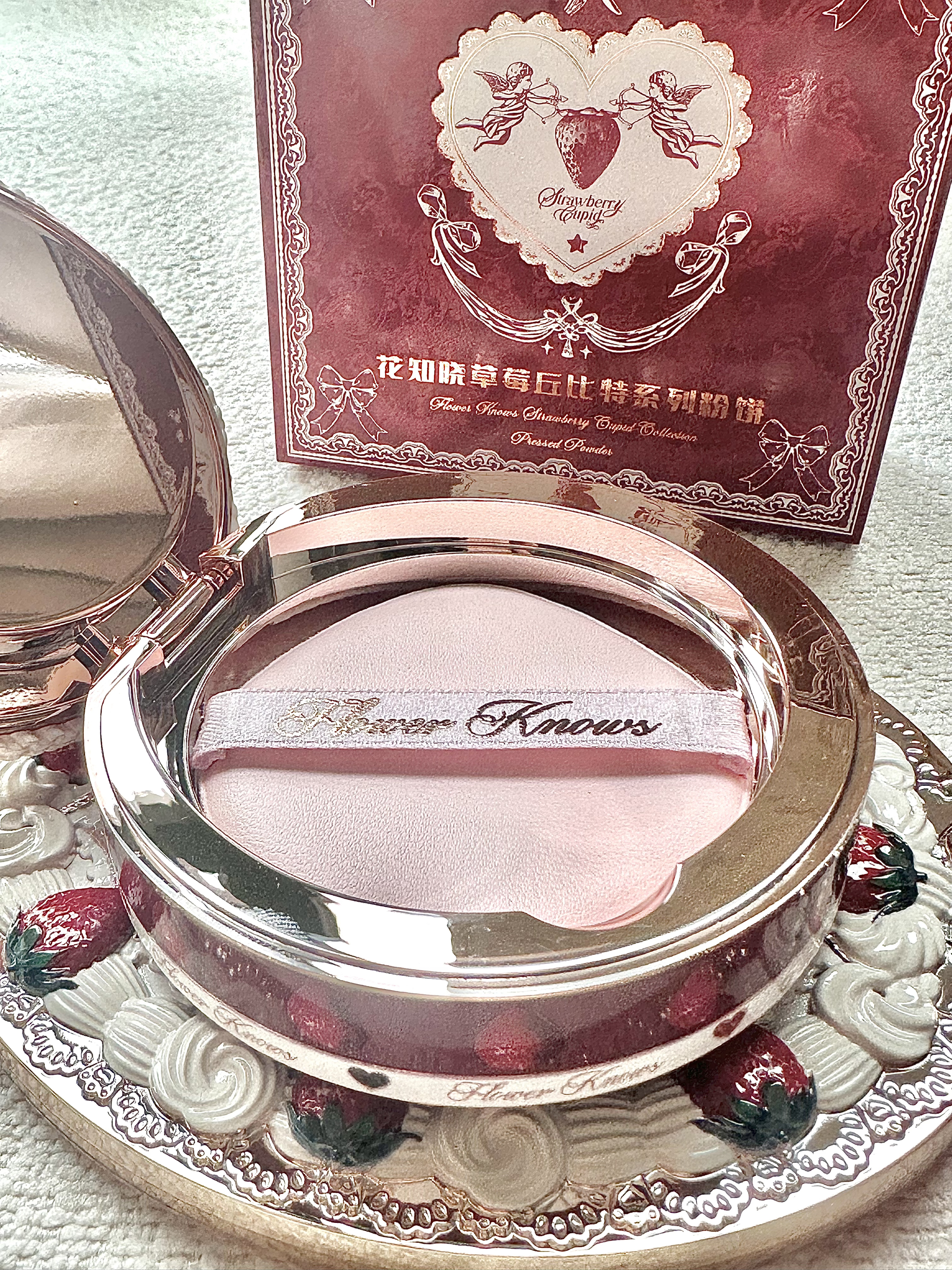 入手新的粉饼!! 02象牙白 盒子做得真美 是红丝绒蛋糕🍰的感觉 配色做得跟配套的镜子都一样 粉饼内里连浮雕都是抱着草莓的丘比特 还会有内置粉扑~