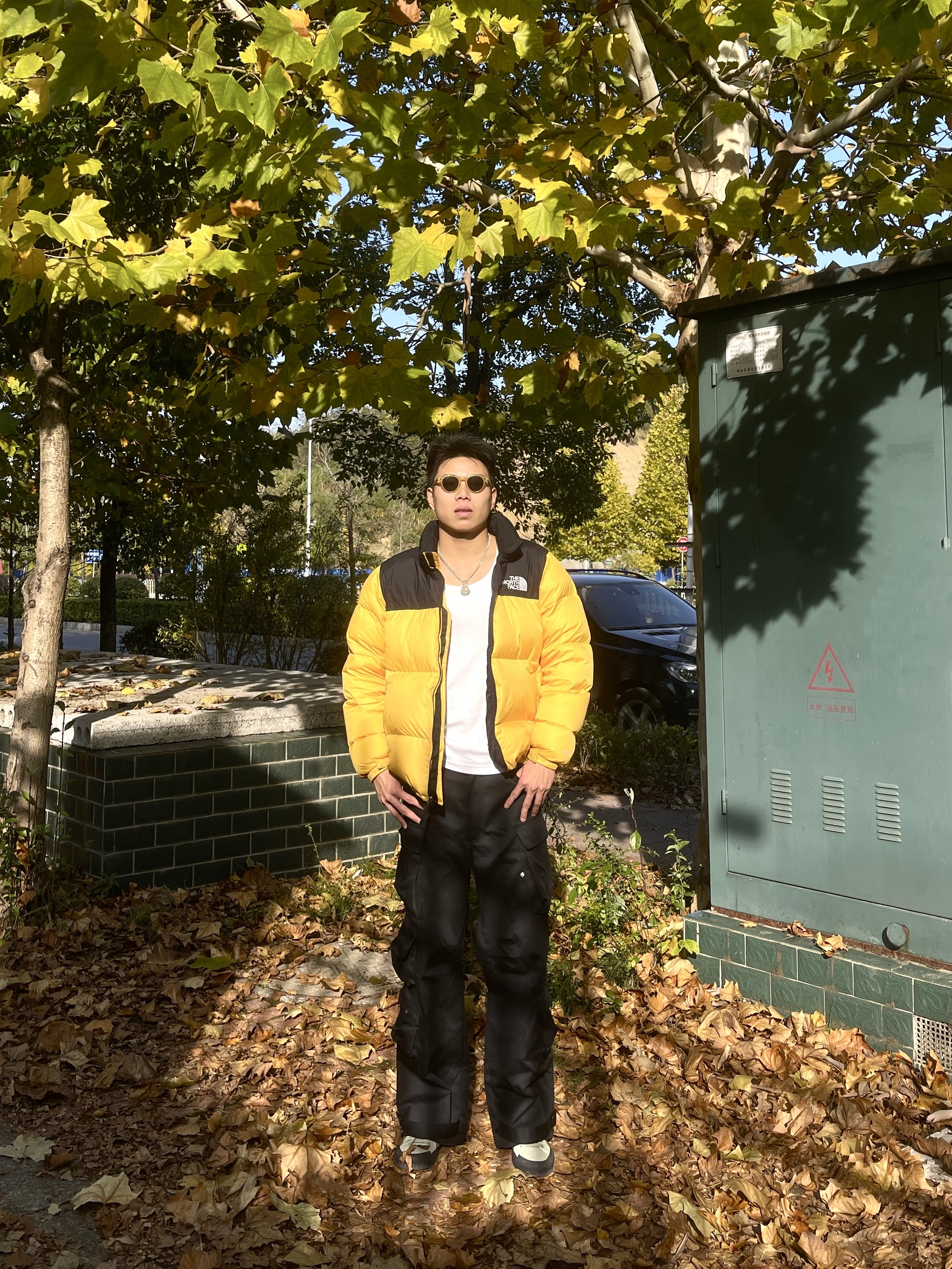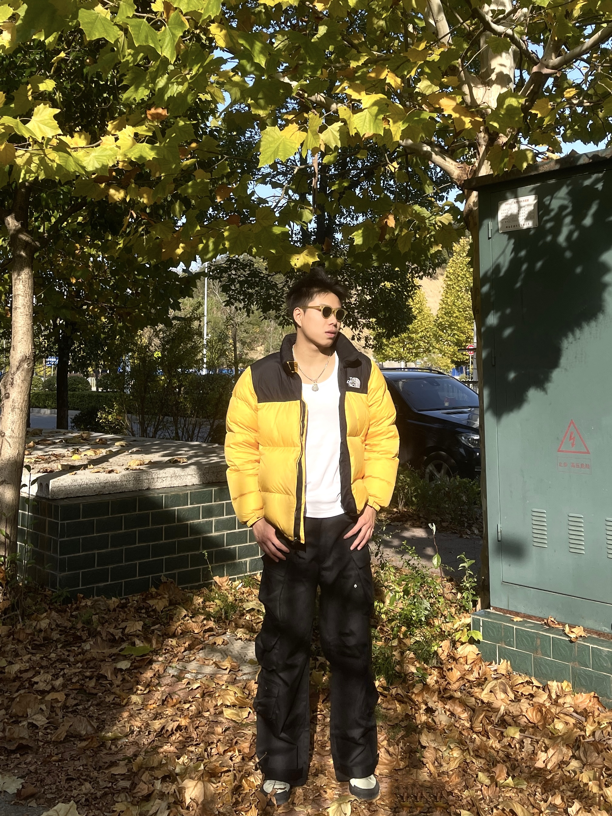 穿搭思路: • 上衣:亮色羽绒服(如黄色,黑黄拼接款),内搭白色简约T恤,形成鲜明色彩对比。 • 下装:黑色工装裤(宽松版型,多口袋设计),百搭且具潮流感。 • 鞋子:休闲运动鞋(黑白配色,与整体搭配协调)。 • 配饰:墨镜(增添时尚感与个性)。 整体风格休闲时尚,亮色羽绒服在秋冬季节亮眼吸睛,适合户外出行或日常休闲场景。