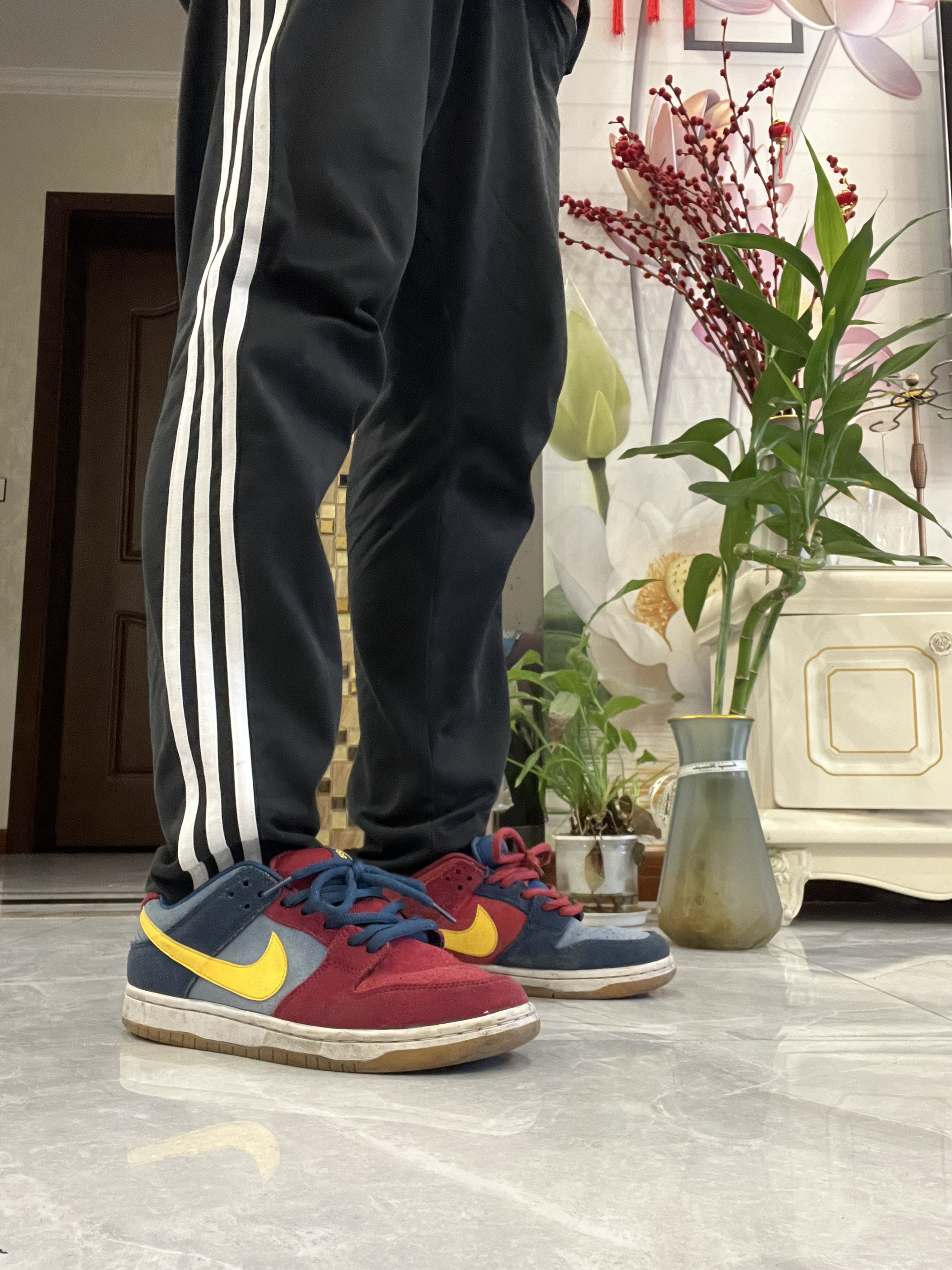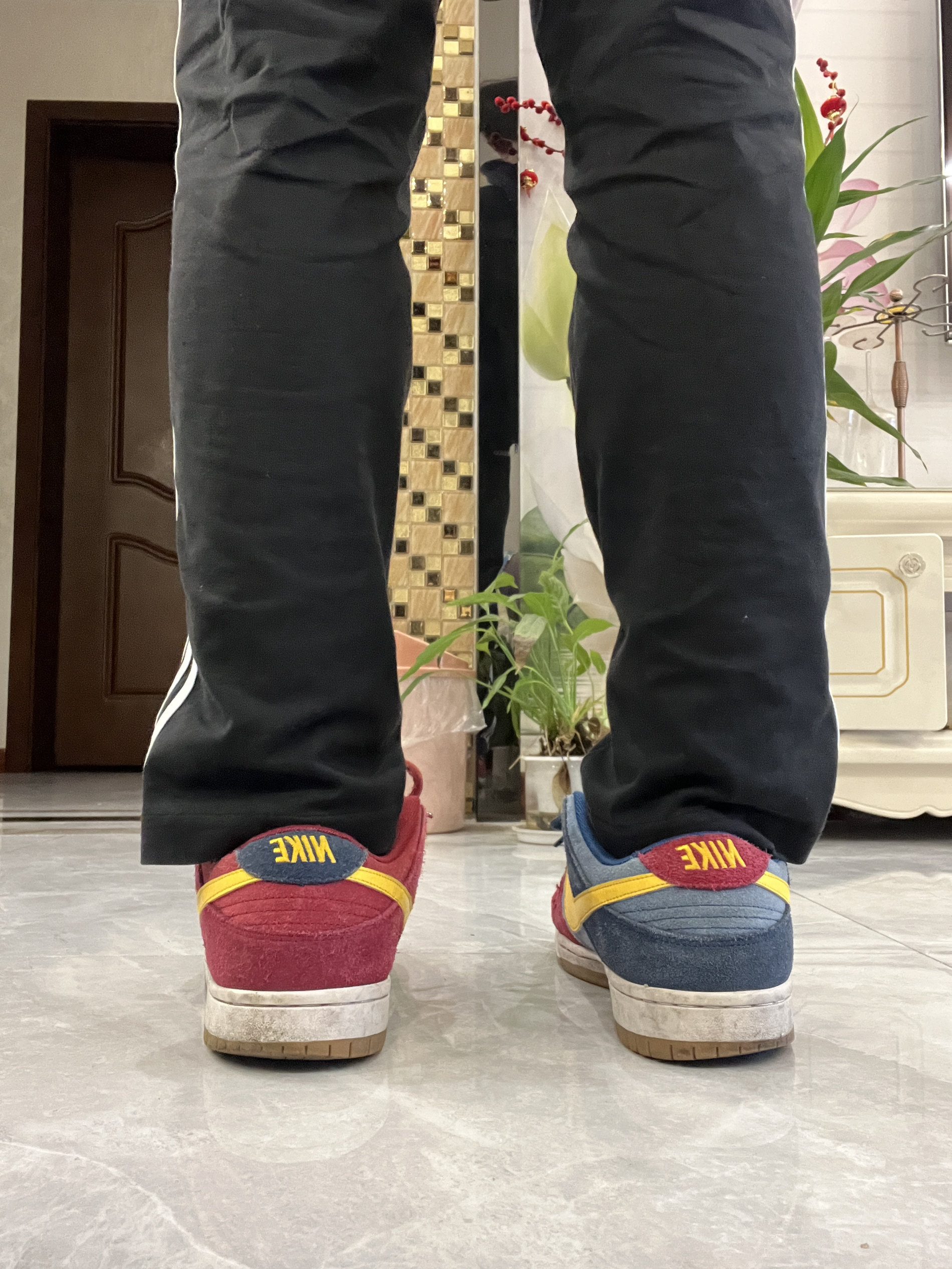这款鞋子是正常码,大家按照自己的脚选择就可以啦 •鞋舌很厚(穿dunk sb 不就图一个鞋舌吗 •红蓝配色 我认为日常穿是非常吸引眼球的。 •后跟内收且有海绵填充物 还另外附赠了一幅鞋带◎ 可以给鞋子多种风格搭配 •搭配裤子黑色运动裤或者牛仔裤都是没问题的我的裤子是阿迪达斯的运动裤 •整双鞋子都是采用抛革麂皮 手感和质感都是拿捏 dunk巴塞罗那是以巴塞罗那队灵感的 喜欢巴塞罗那的可以冲一冲 因...