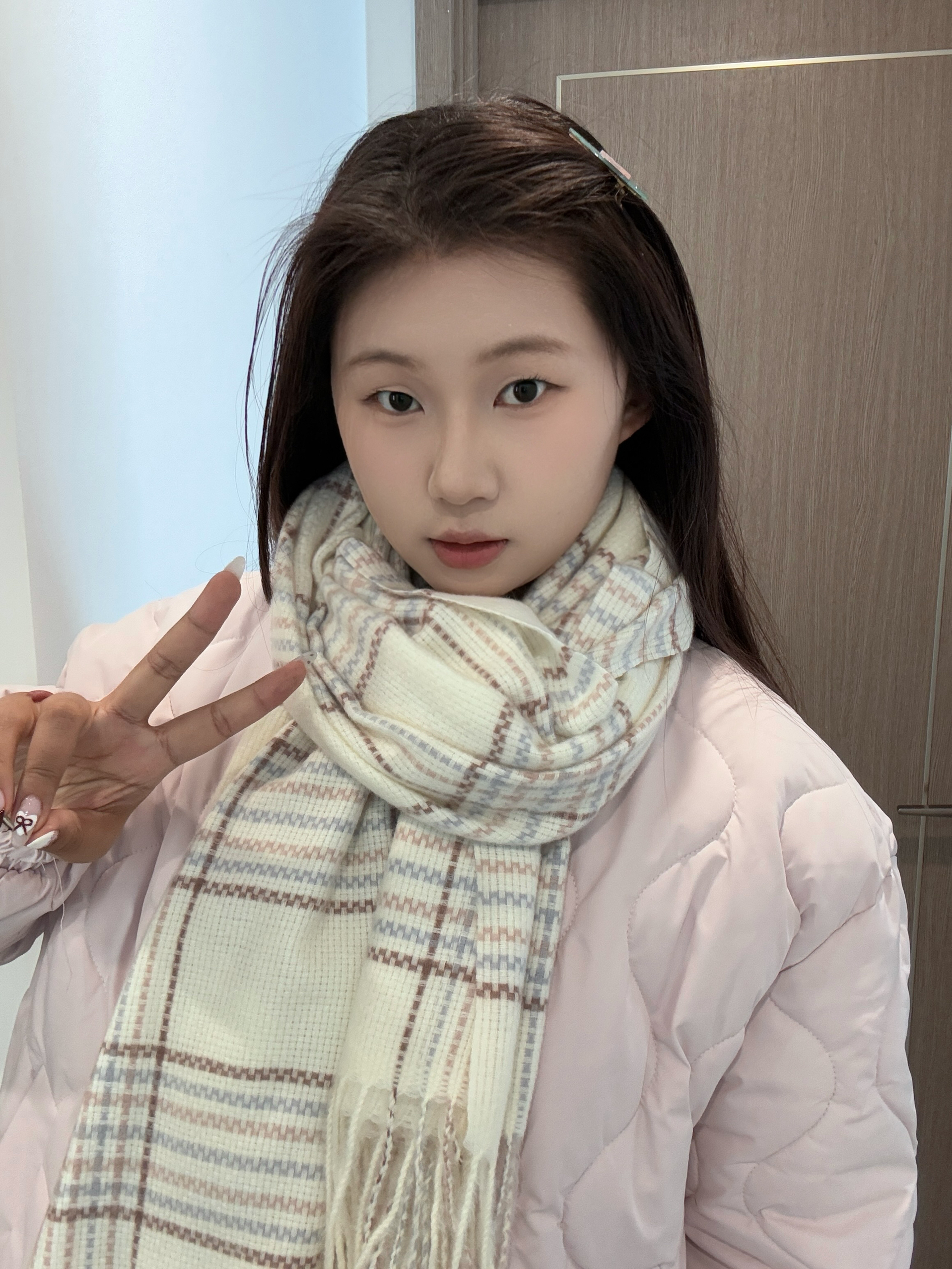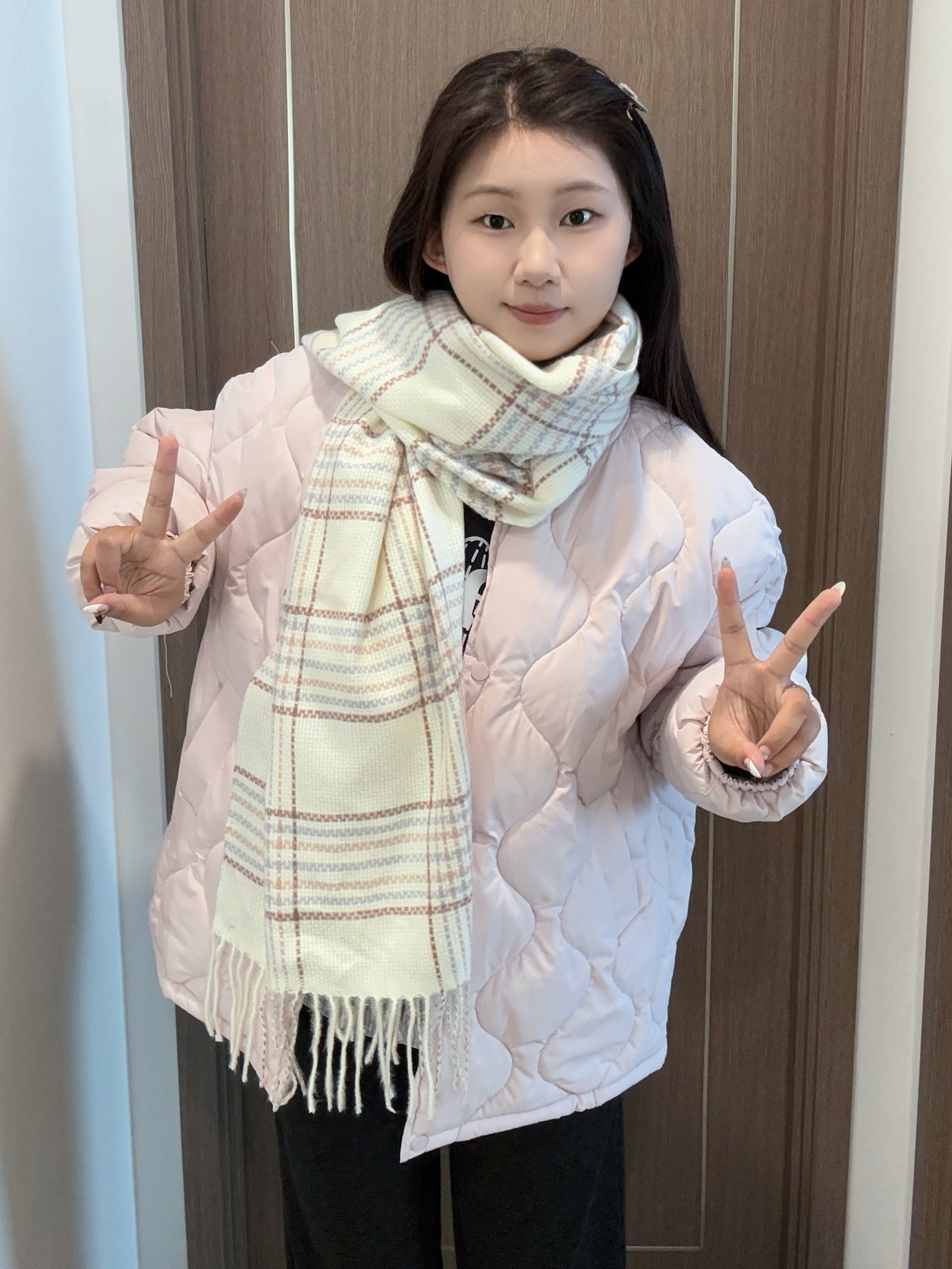 身高|体重:173/55 🧍♂️ 穿搭风格:简单韩系 👔 上衣:粉色棉衣 👖 下装:黑色运动裤 👟 鞋子:Nike运动鞋 🎒配饰:clect流苏围巾 冬天少不了的围巾真的要买简单的款式好搭配哦 任意一件外套都好搭呢