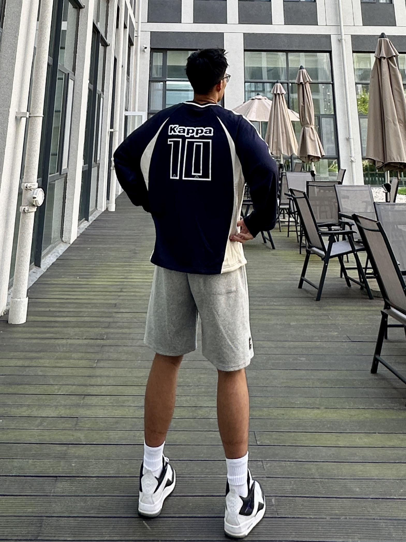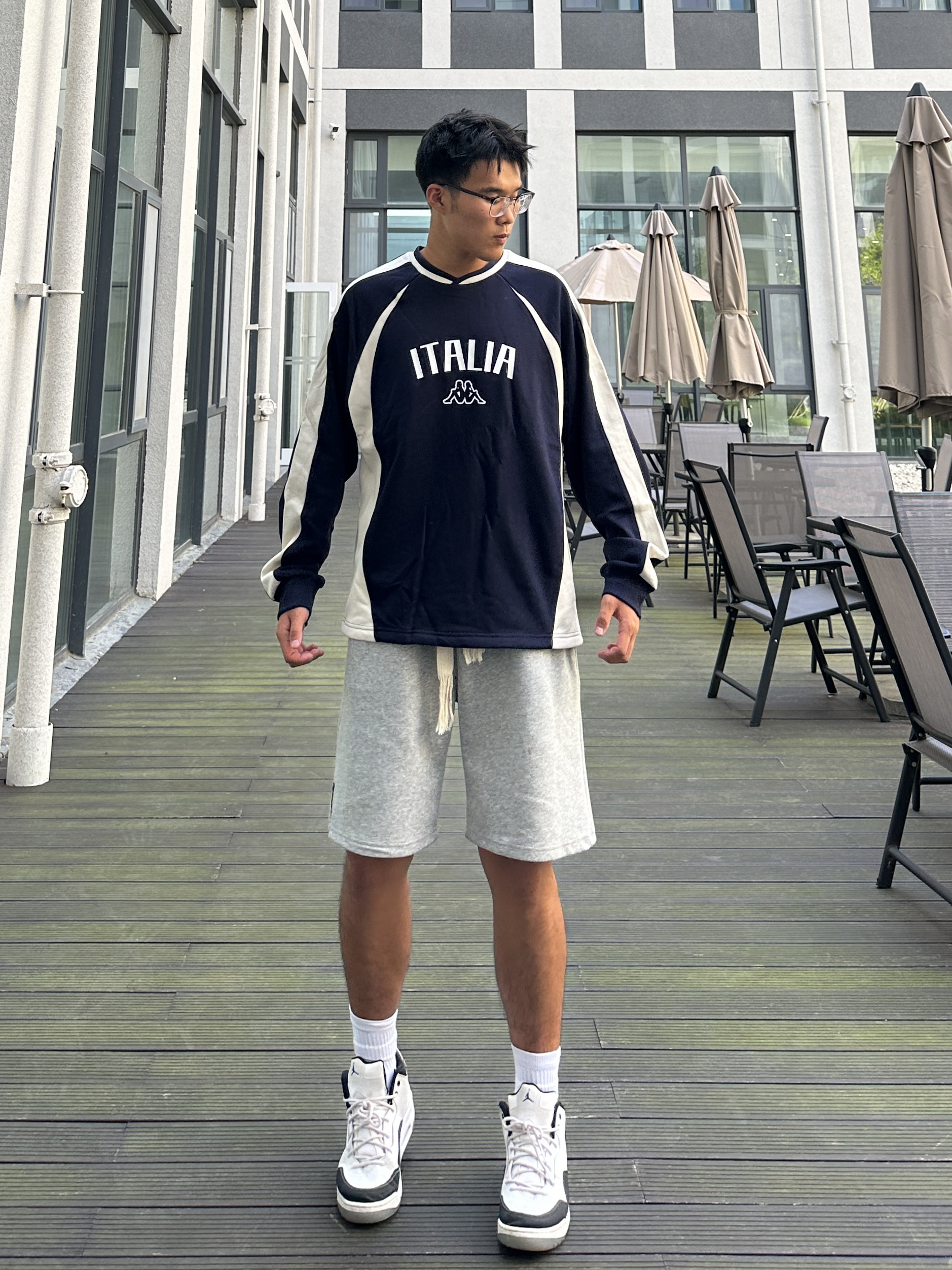 男大学生真的什么好看的衣服都能找到! 轻松解决入秋的第一件复古卫衣 复古字母卫衣搭配宽松短裤过渡穿搭丝滑入秋🍂 🅿️白蓝色的拼色设计融合了复古字母图案 宽松的版型搭配上插件的设计很显肩宽🎒 纯色的过膝短裤修饰腿部搭起来炒鸡蟀📸 鞋子上脚的是一双小康扣自然色系就很养眼 👔: Kappa 1916系列复古卫衣 👖:纯色不过膝短裤 👟:Jordan小康扣