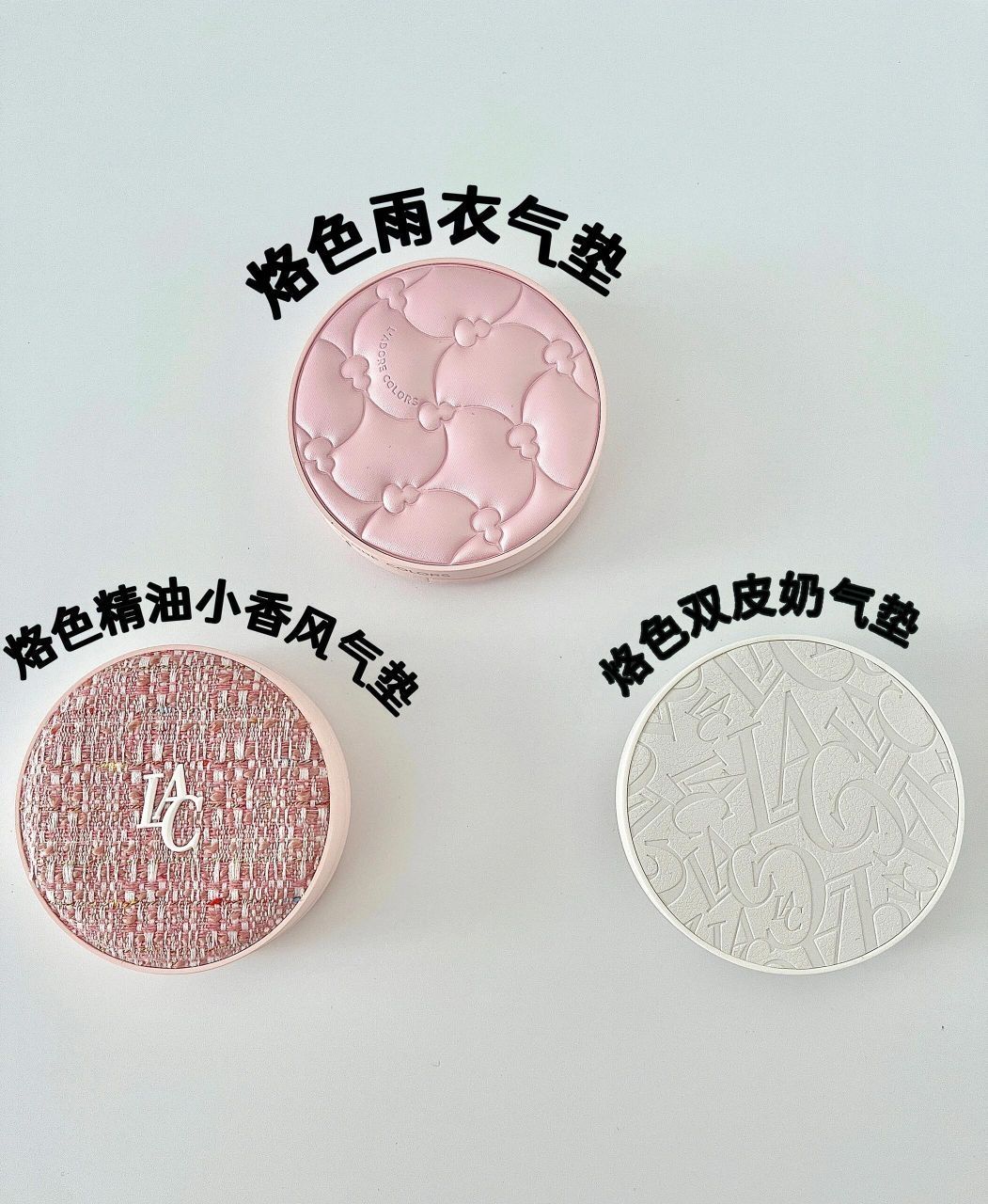 烙色精油小香风气垫 适合肤质:沙漠大干皮、混干皮 山茶花精油润养上妆即养肤8D玻尿酸精华:水润度没得说沙漠大干皮也不担心卡粉爆皮,这三款里面遮瑕效果最好 色号:01象牙白 烙色雨衣气垫 (葫芦娃联名款) 适合肤质:全肤质、大油皮友好,成膜以后防水防汗不脱妆,混油皮油皮春夏闭眼入,流汗不花妆 色号:02号色 烙色双皮奶气垫 适合肤质:混干皮 皮肤暗沉黄皮可以闭眼入这款轻松提亮肤色遮黄气 很适合早八打...
