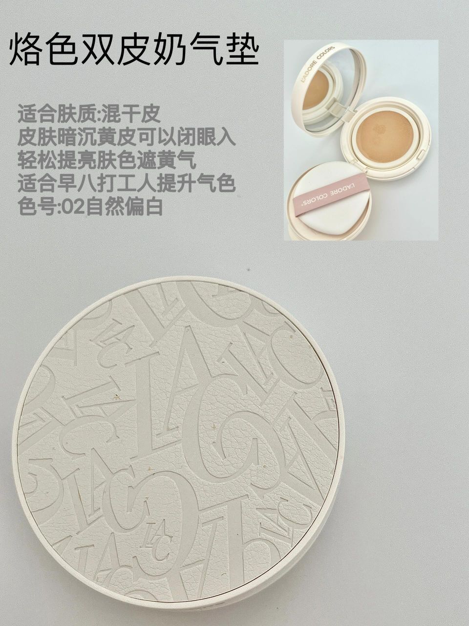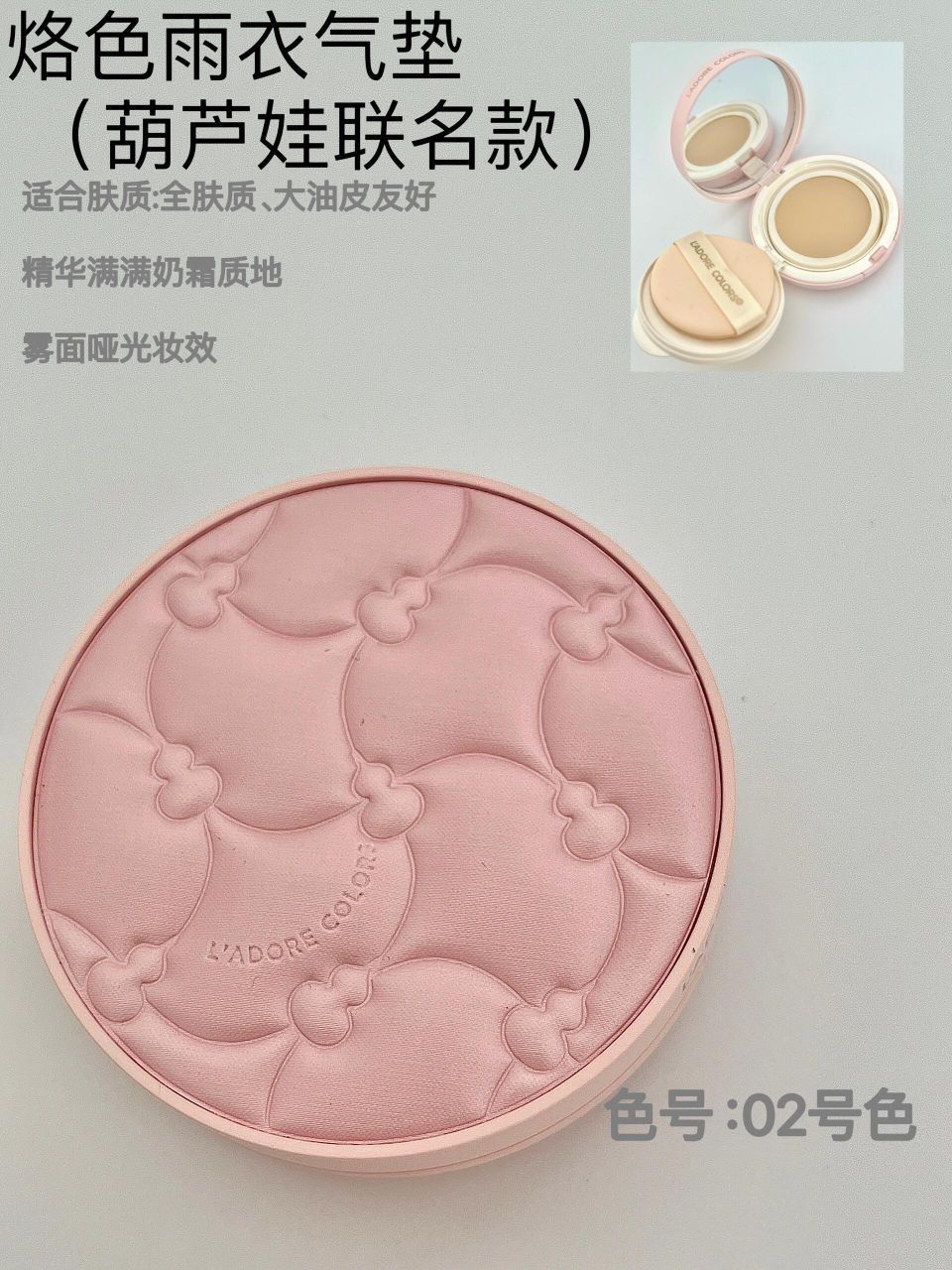 本篇笔记关联了【葫芦娃联名】L'adore colors/烙色 防水控油高遮瑕气垫 外壳*1+芯*1 12g 02自然色 适合自然肤色、L'adore colors/烙色 奶融微光气垫 双皮奶奶油肌 12g 02自然偏白等商品,为用户提供真实的使用体验和购买参考。