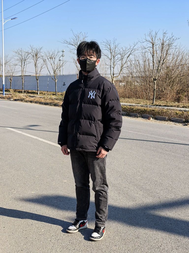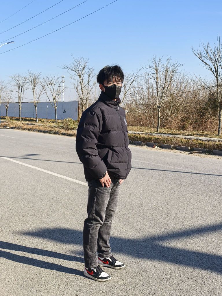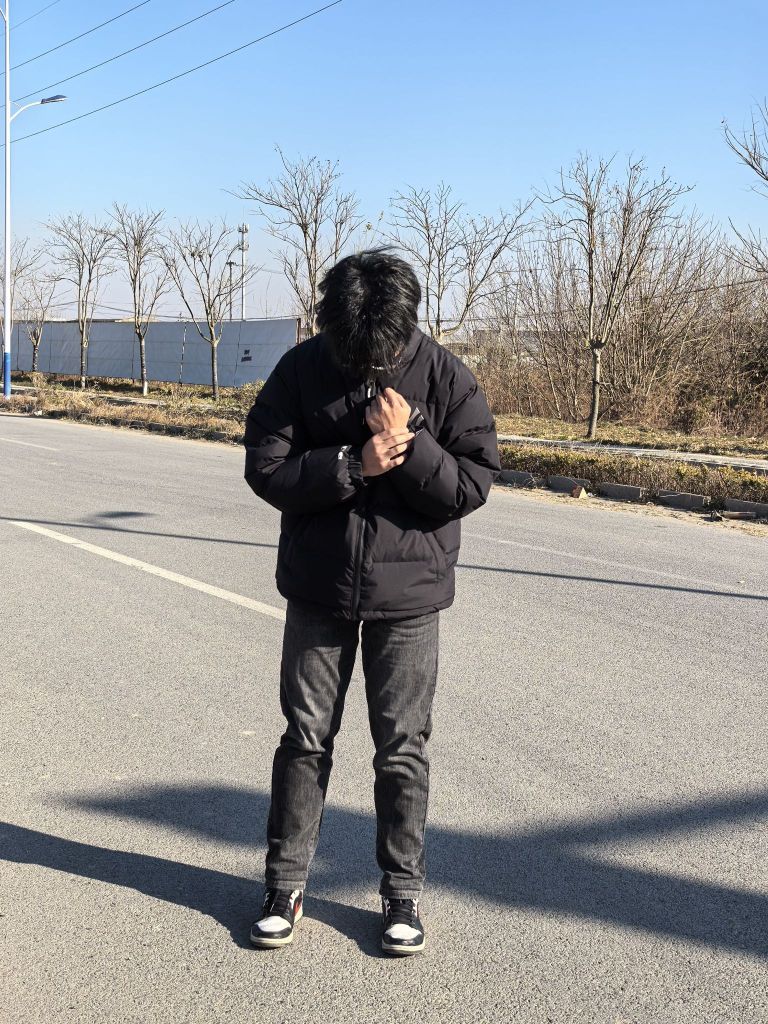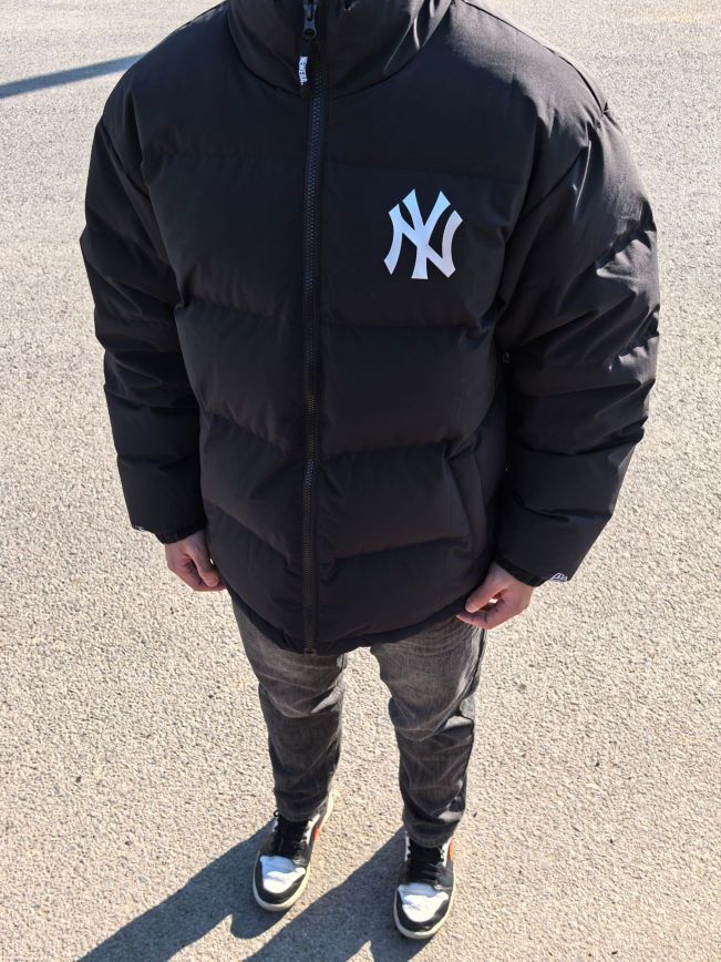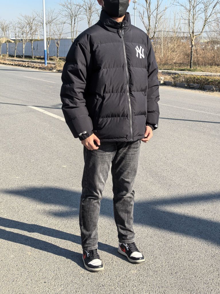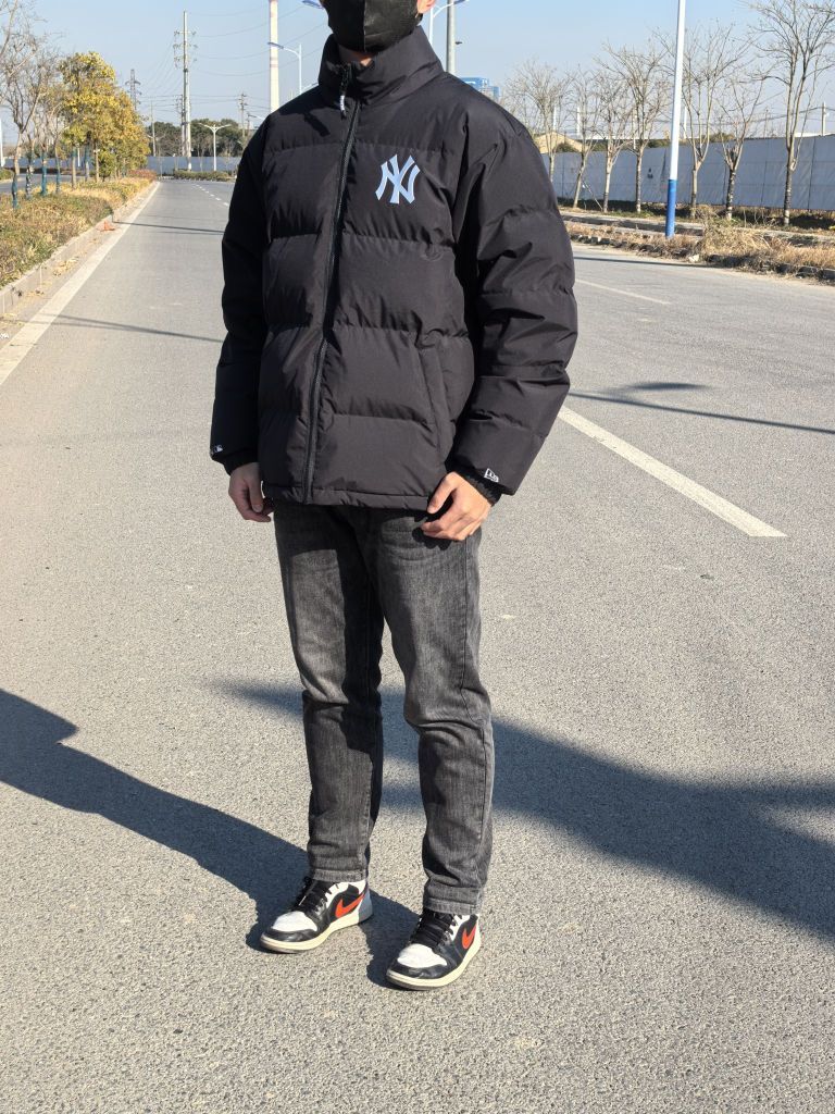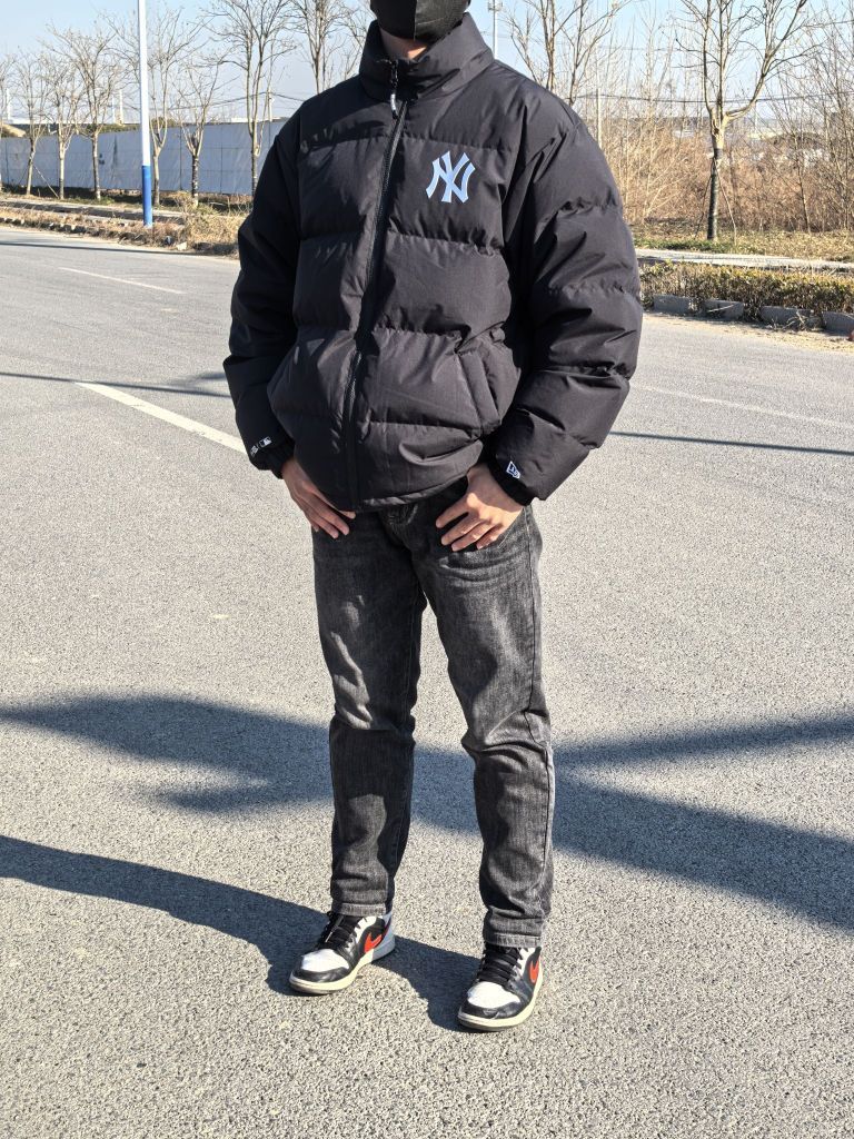 🧍♂️ 穿搭风格:日常生活风 👔 上衣:new era×MLB羽绒服 上身效果宽松立体 高充绒量保暖舒适 👖 下装:黑色牛仔裤 修身百搭 👟 鞋子:aj1黑白熊猫 经典板鞋 百搭舒适