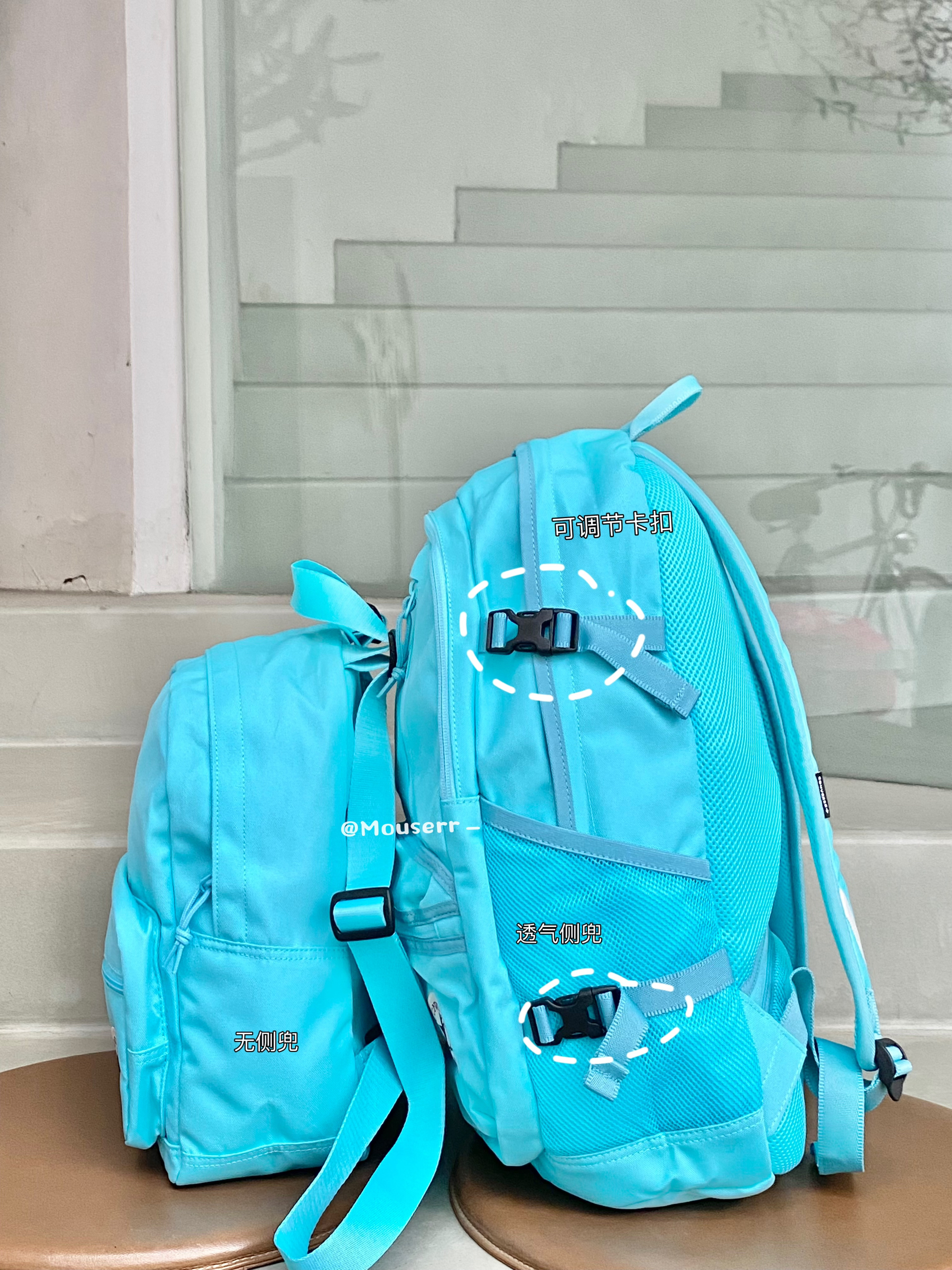 很是清新淡雅的色系~  超吸睛👀超亮眼🤩 出街简直是最亮眼的仔! 🩵迷你款(10020538-A10):规格:21*13*27cm 🩵成人款(10021138-A24):规格:31*15*47cm 有啥不同勒🧐注意注意⚠️ 1️⃣容量不同 2️⃣正面收纳空间不同:迷你款一个收纳空间,成人款两个收纳空间。 3️⃣副袋空间不同:只有成人款有 4️⃣主袋隔层不同:成人款是加厚海绵隔层,迷你款是普通隔层...