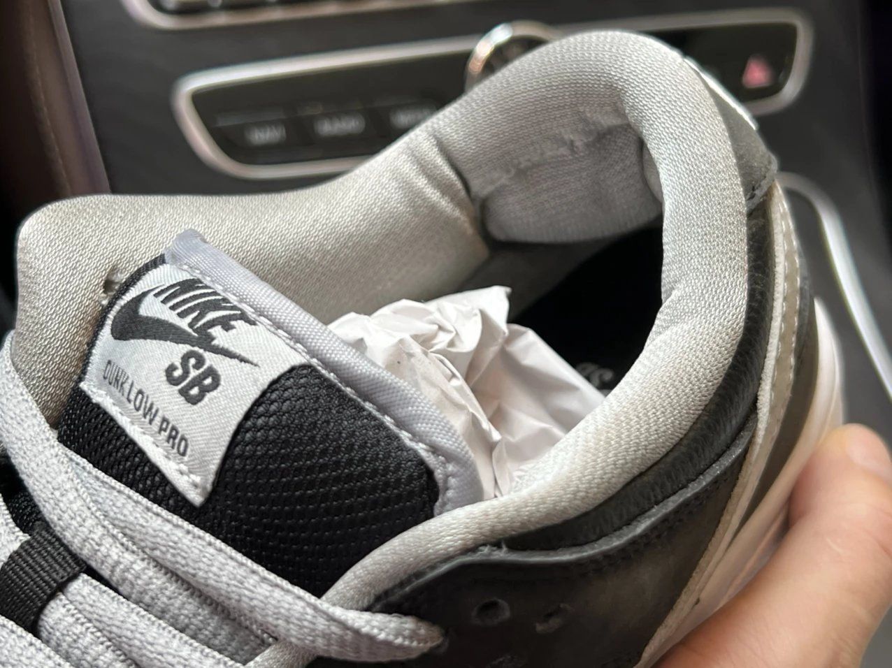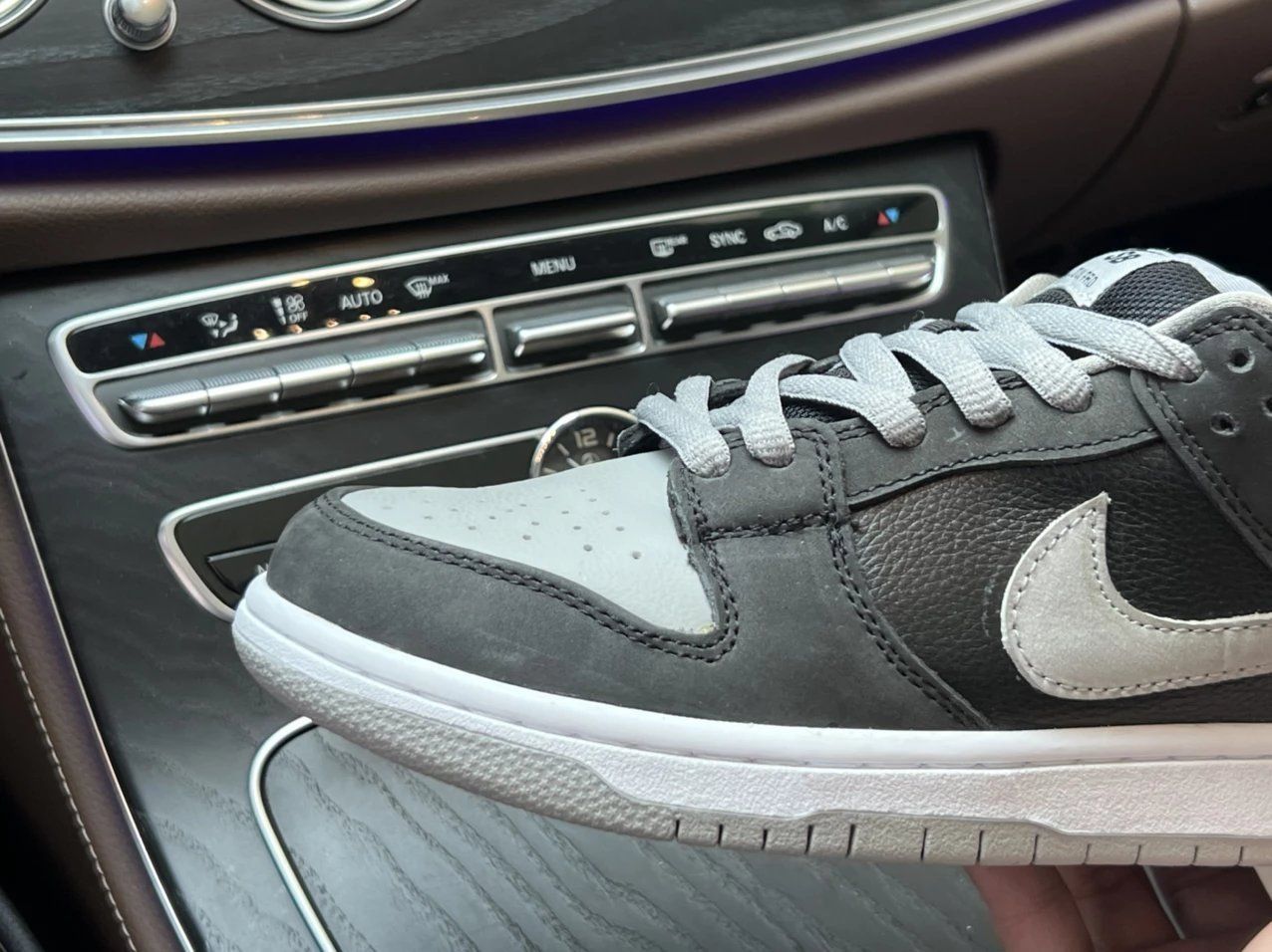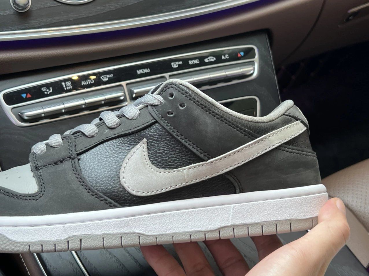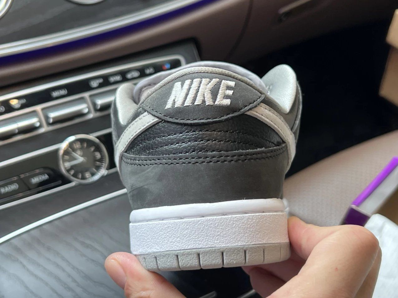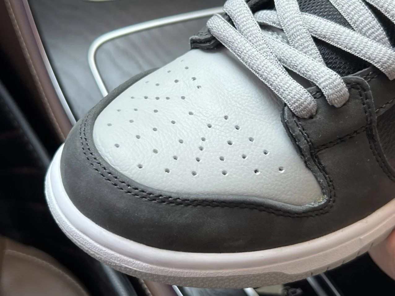 DUNK SB影子 第一眼就爱了呀,让我想到之前买的AJ1影子,黑灰俩色的组合看起来十分稳重,相对低调一点的颜色搭配起来也是比较得手的。 亮面牛皮革与磨砂牛巴革组合,前脚学灰色部分与侧面荔枝纹路部分为牛皮革材质,但呈现的是一种比较硬比较干的感觉,所以如果有褶皱,也是容易定型的,所以鞋撑,必须备好。 磨砂质感的黑色牛巴戈泛着一丝灰色,为鞋身质感加分,不过打理起来,又是另外一回事了。 推荐入手吗? 好...