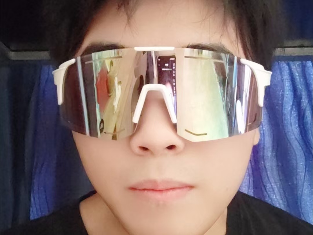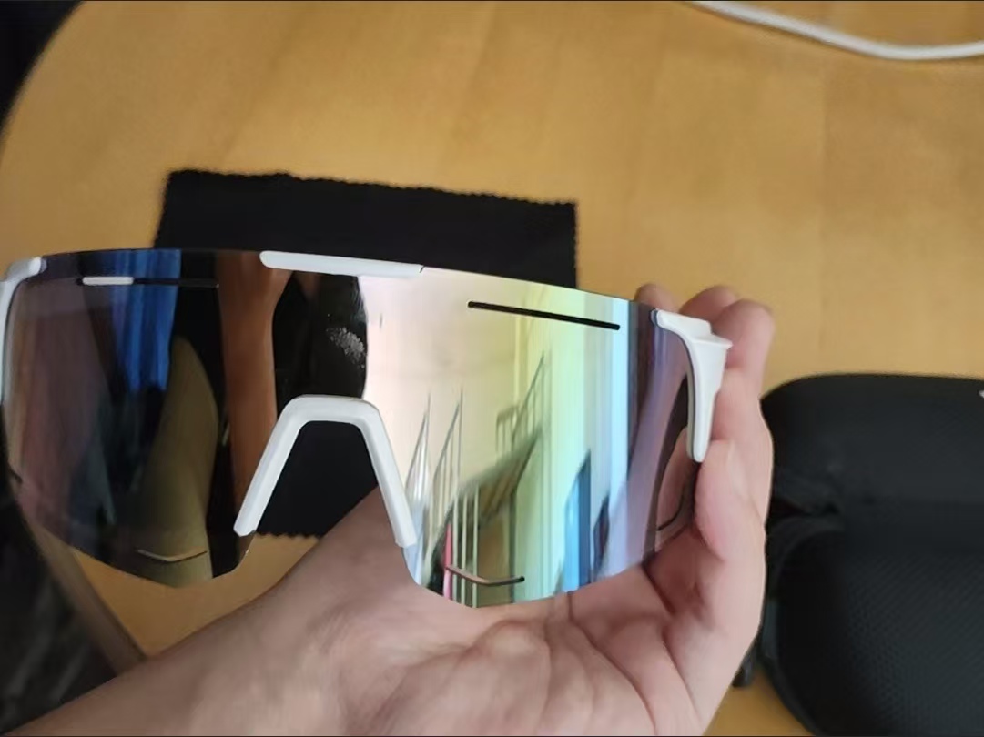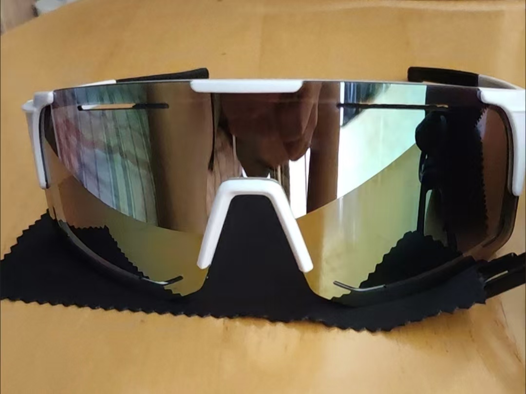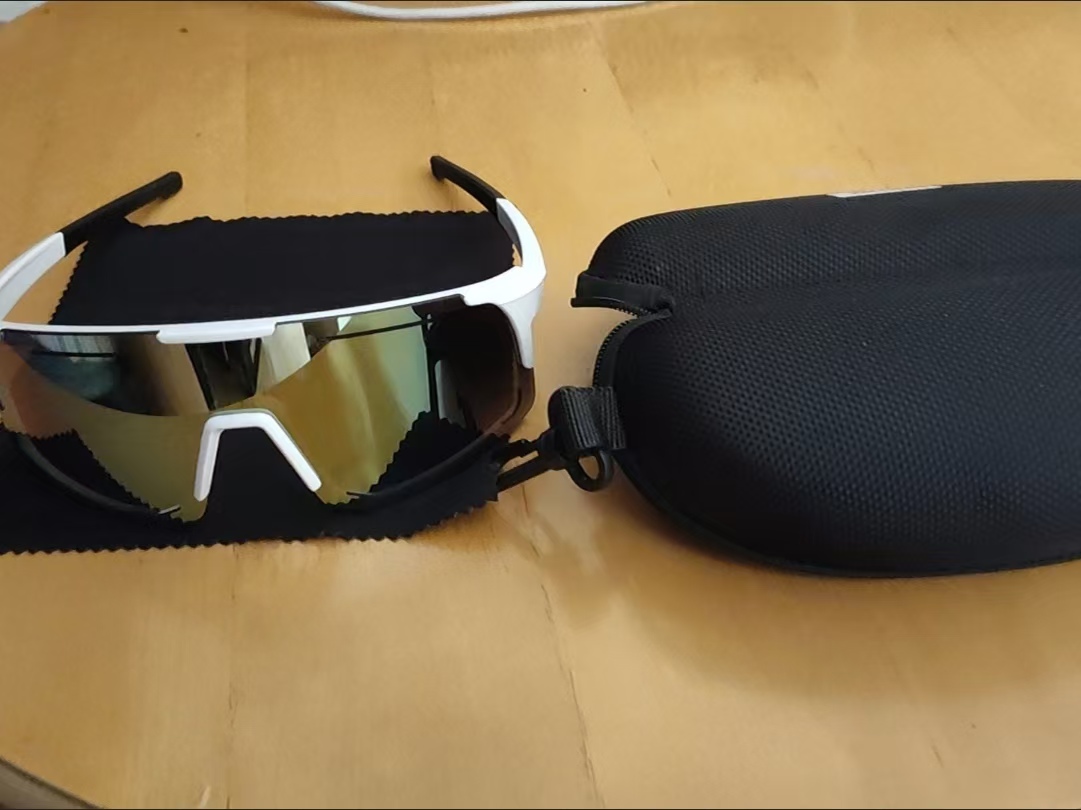 我这一款是比较热卖的白框粉膜。配备了一个眼镜布和一个保护眼镜盒子。这个眼镜的颜值首先是非常帅气的。然后也不会硌鼻子,然后它底下类似于一个软垫,镜片清晰。外面是强光,确实防光效果也比较好。如果是白天骑行的话,非常护目,推荐大家!图源网络侵删