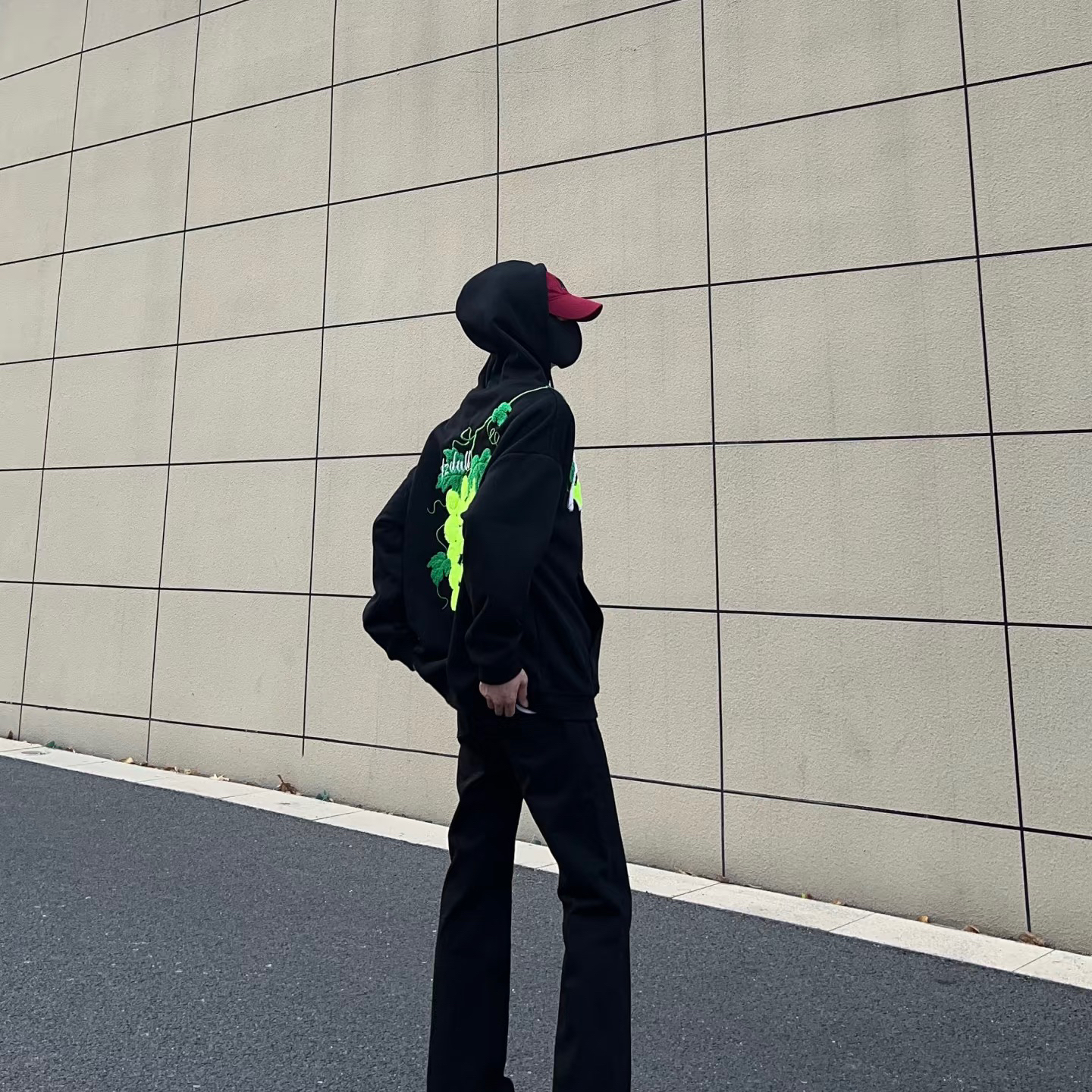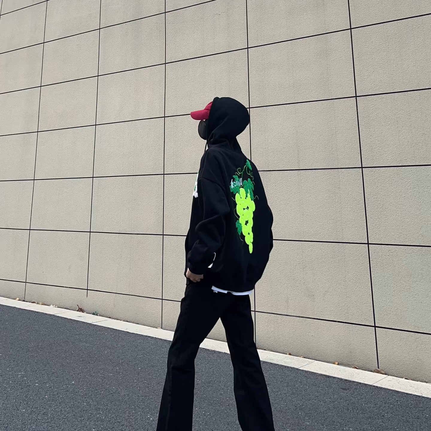 183细狗的秋季氛围感穿搭,今日推荐一款超帅的印花卫衣 真的很有设计感背面的绿葡萄印花太吸睛了!裤子选择一款纯黑弯刀微喇牛仔裤好修饰腿型显高又显瘦! 图片来源于@何天日常分享穿搭
