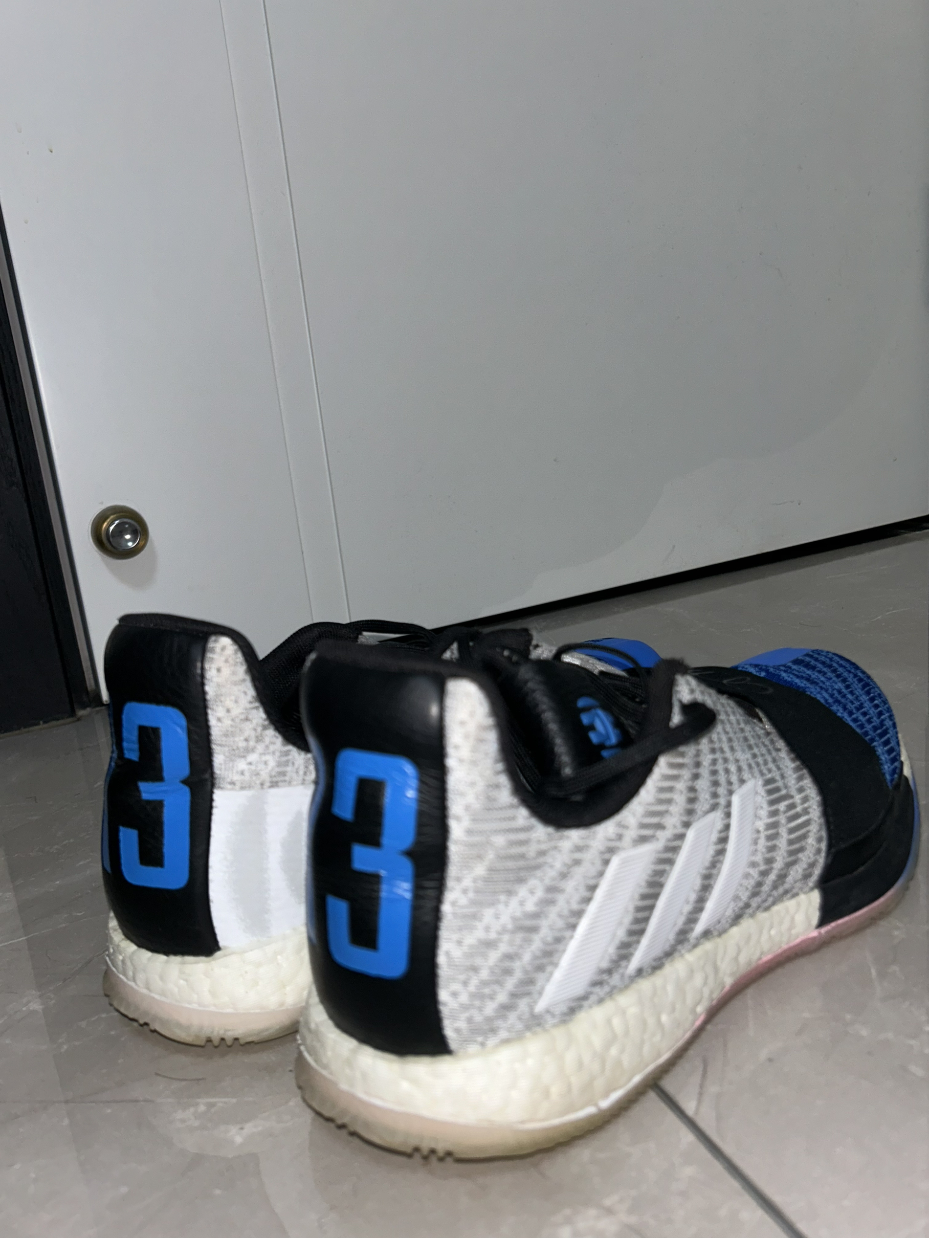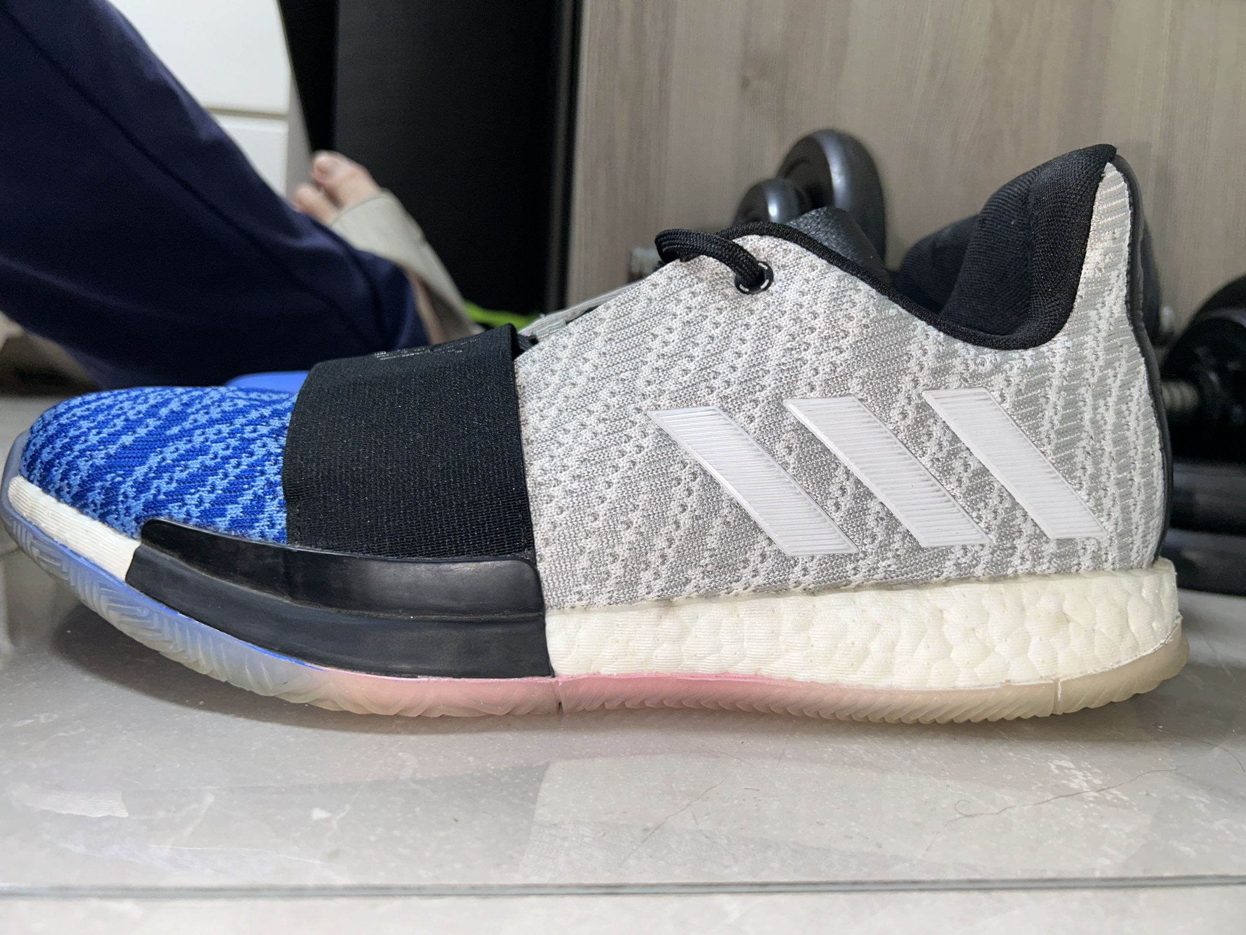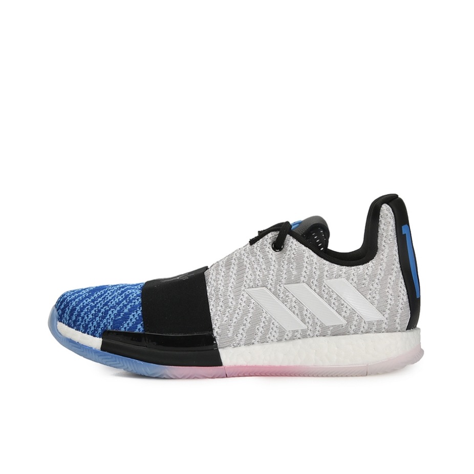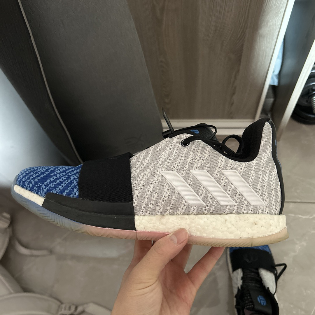 哈登3是我最最喜欢的一双鞋,非常好穿,前掌薄而贴地,搭配全掌boost,过度顺滑!这款产自2018年的鞋放到现在也同样惊人! 这双蓝灰配色很有感觉,蓝色和灰色为主搭配一点粉色和黑色,搭配简约的鞋型,低调而有内涵 我前前后后买了三双,打球的时候我一般带一双哈登3,再带一双其他鞋,新款鞋总会有不合脚的时候,所以哈登3就成为了常备的实战鞋!