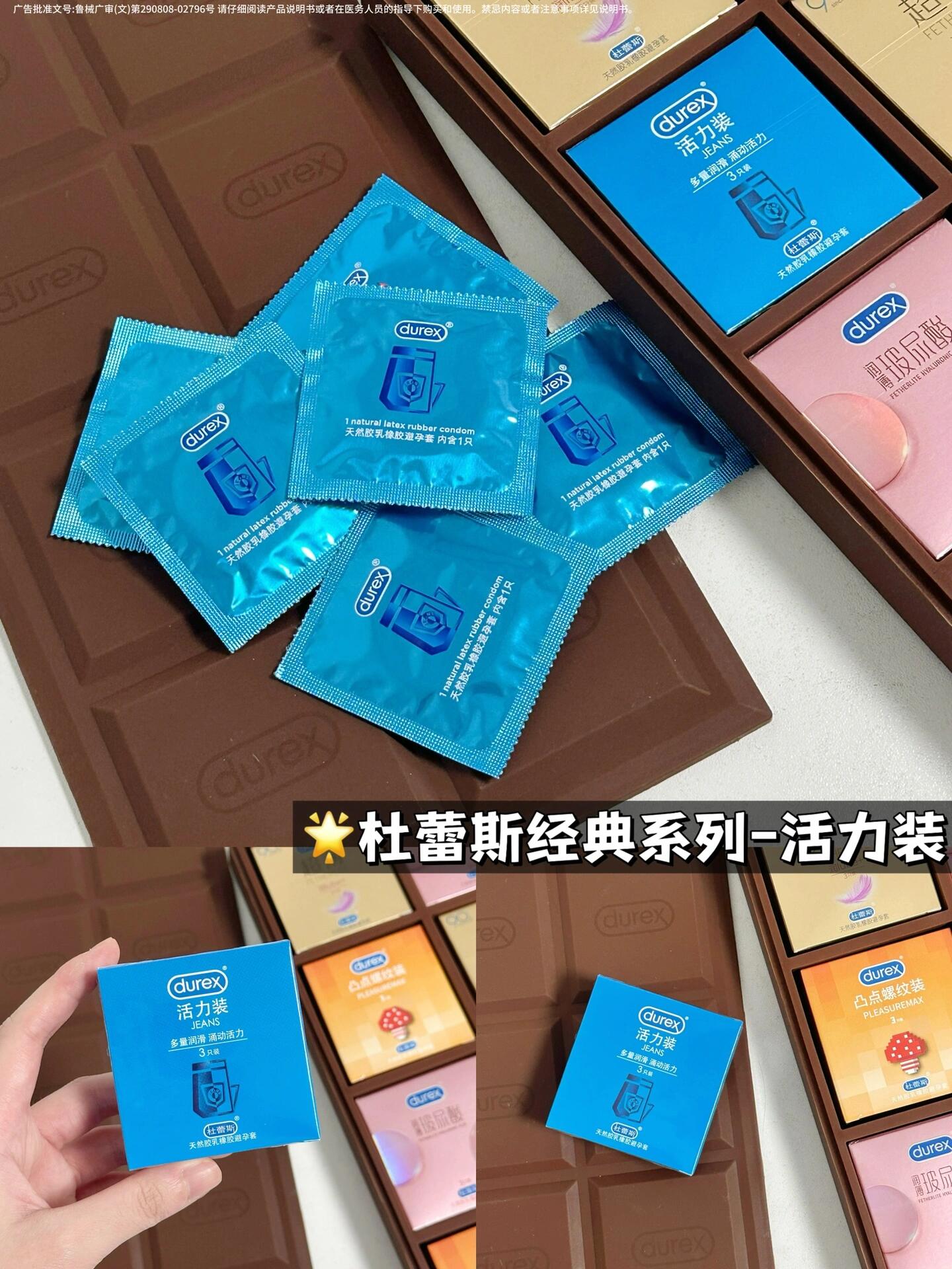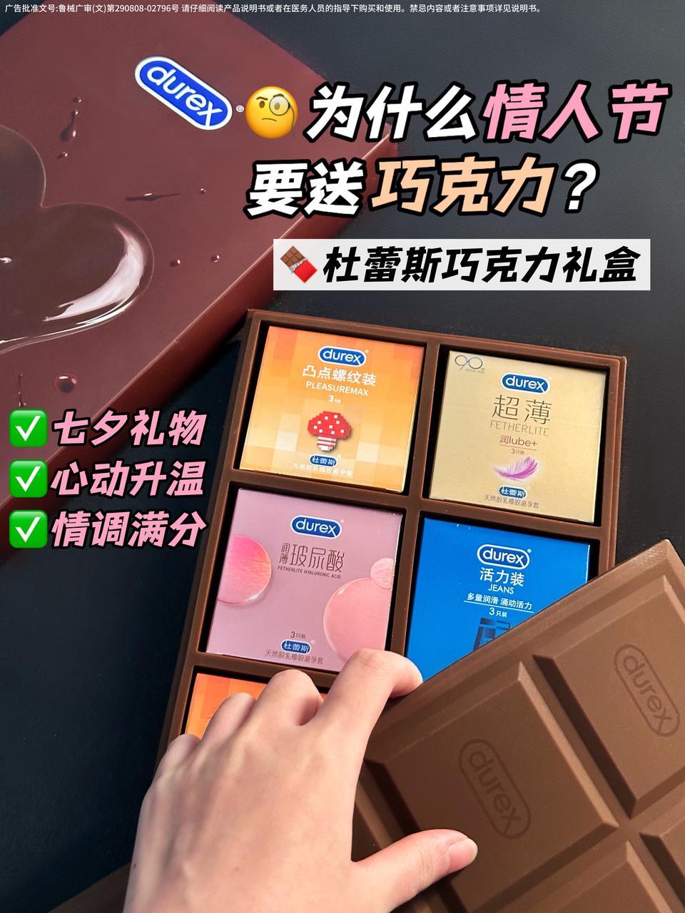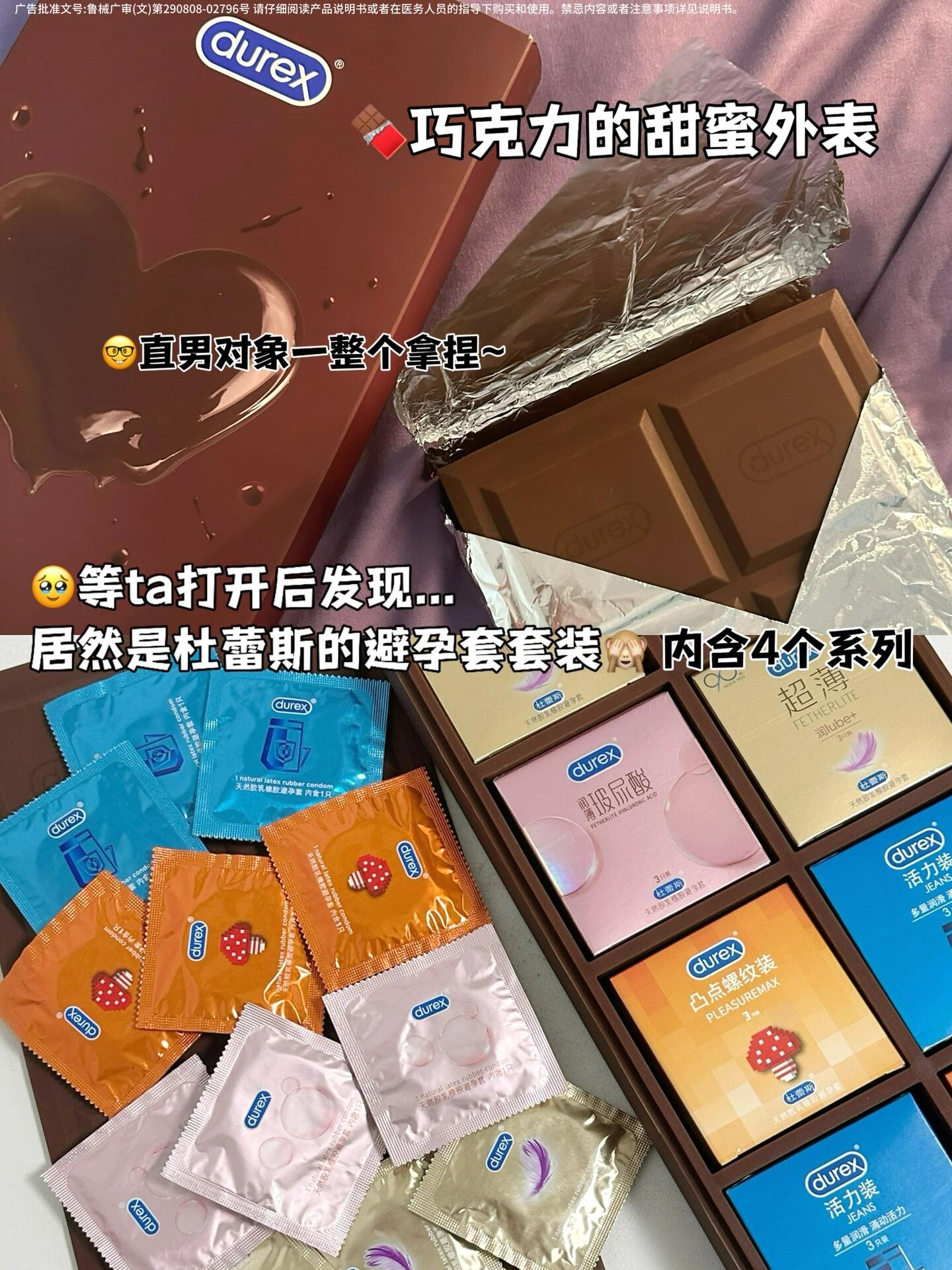 马上要过年了 还没想好给心爱的ta送一份什么样的惊喜吗 不妨来看看杜蕾斯的巧克力礼盒套装🍫 外表看是甜甜的巧克力 打开里面大有玄机😍 -- 盒内包含杜杜家四款经典系列套套👇 ✨杜蕾斯魔法情趣系列-凸点螺纹装 ✨杜蕾斯玻尿酸系列-澎润小水库 ✨杜蕾斯超薄系列-超薄倍滑装 ✨杜蕾斯经典系列-活力装 -- 实用又走心 送到ta心巴上❤ 用完盒子还可以做收纳用 快给ta安排起来! (图源网络侵删)