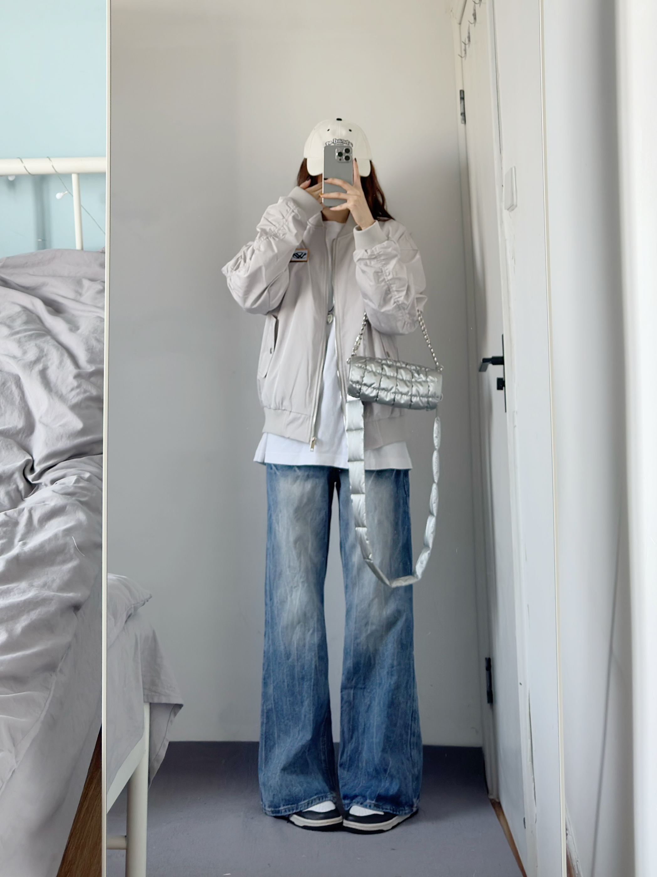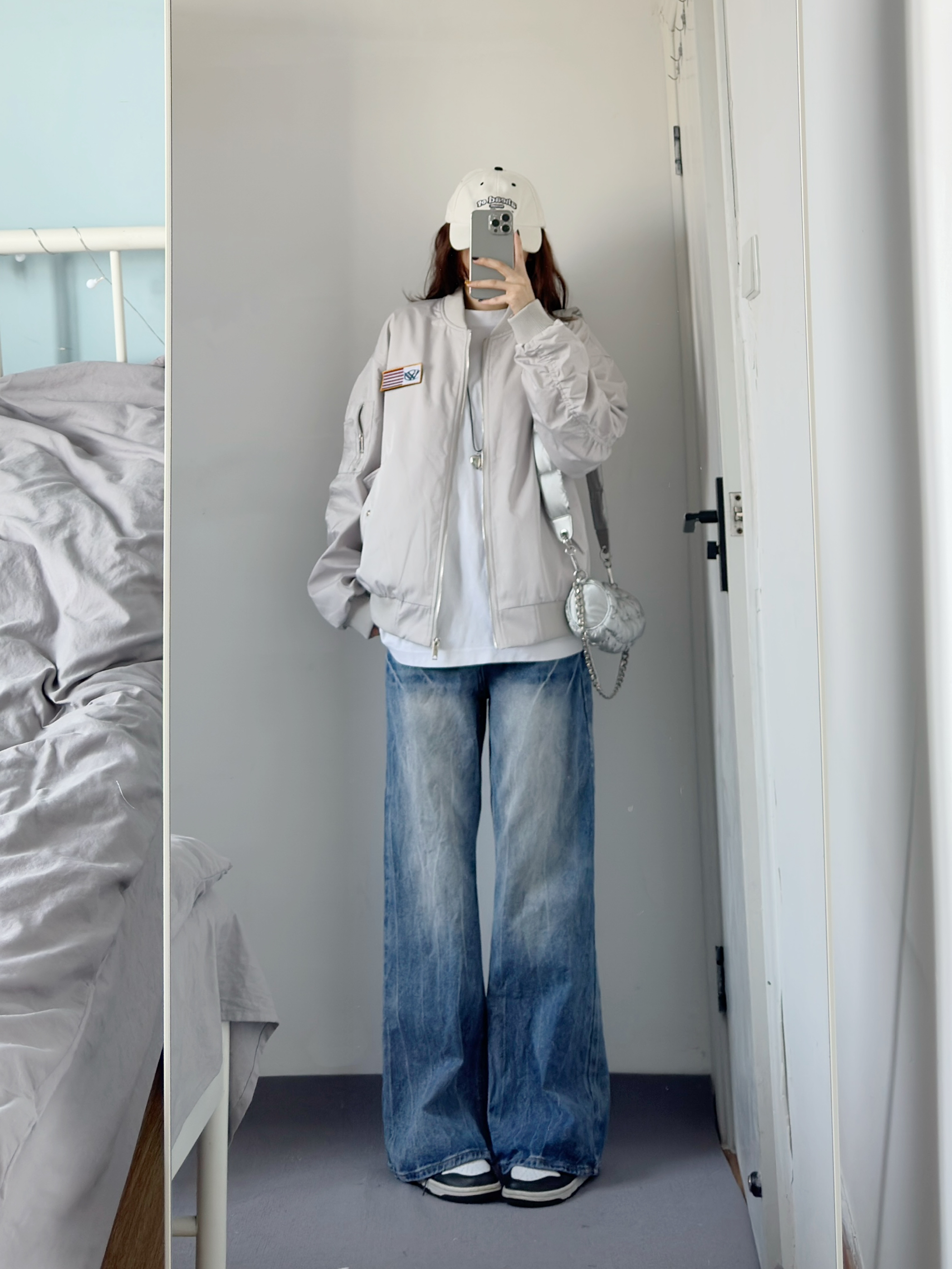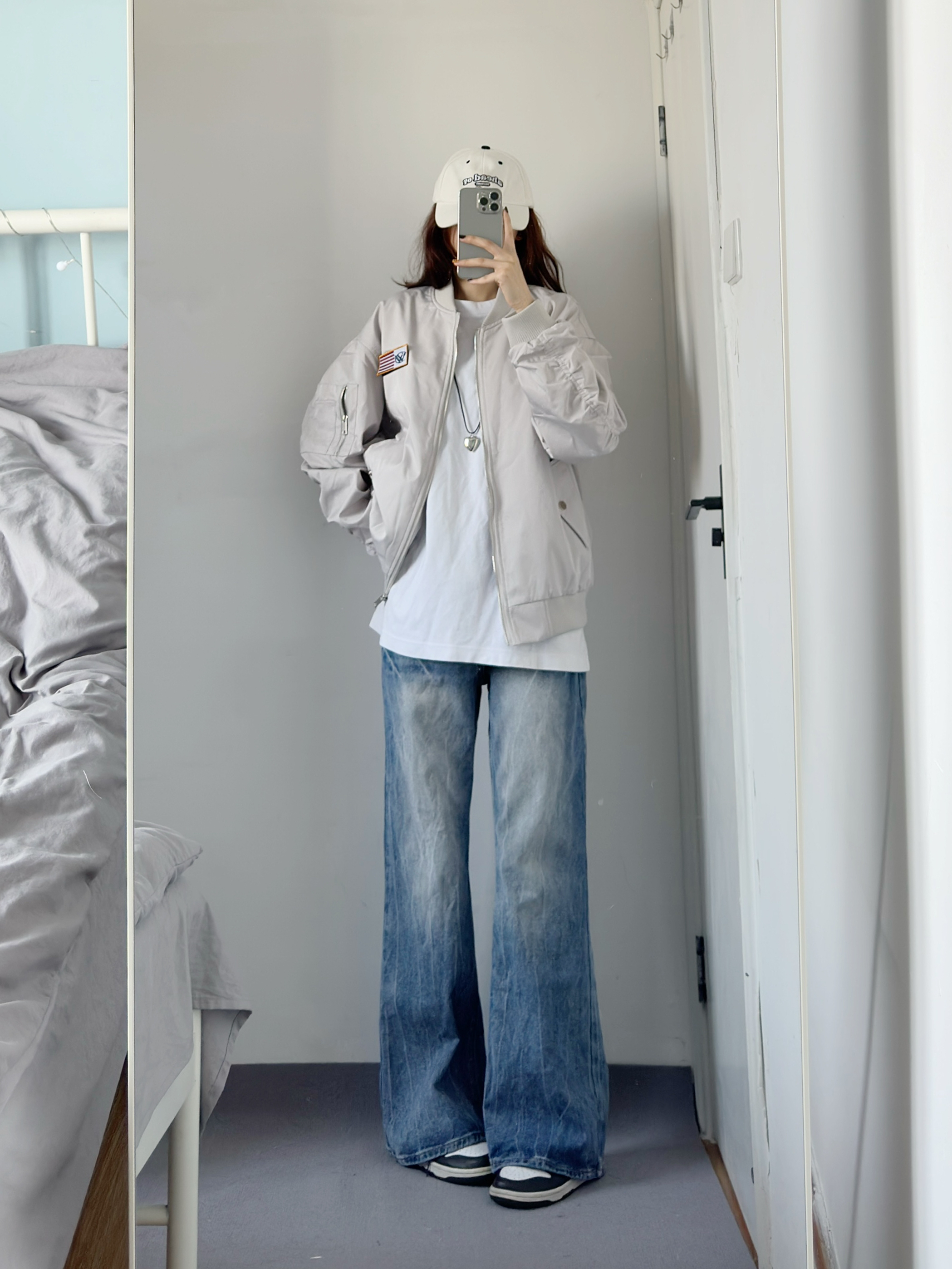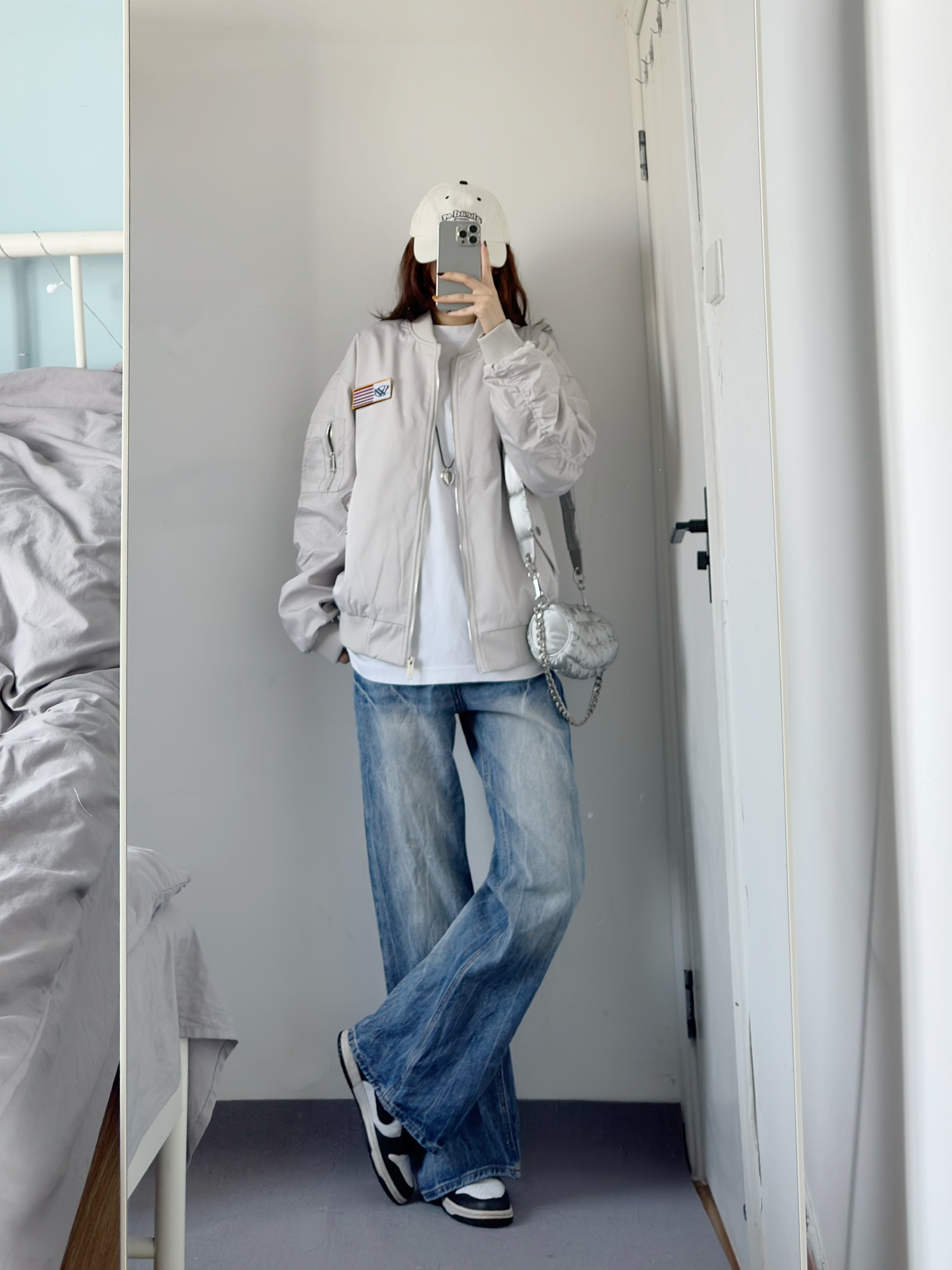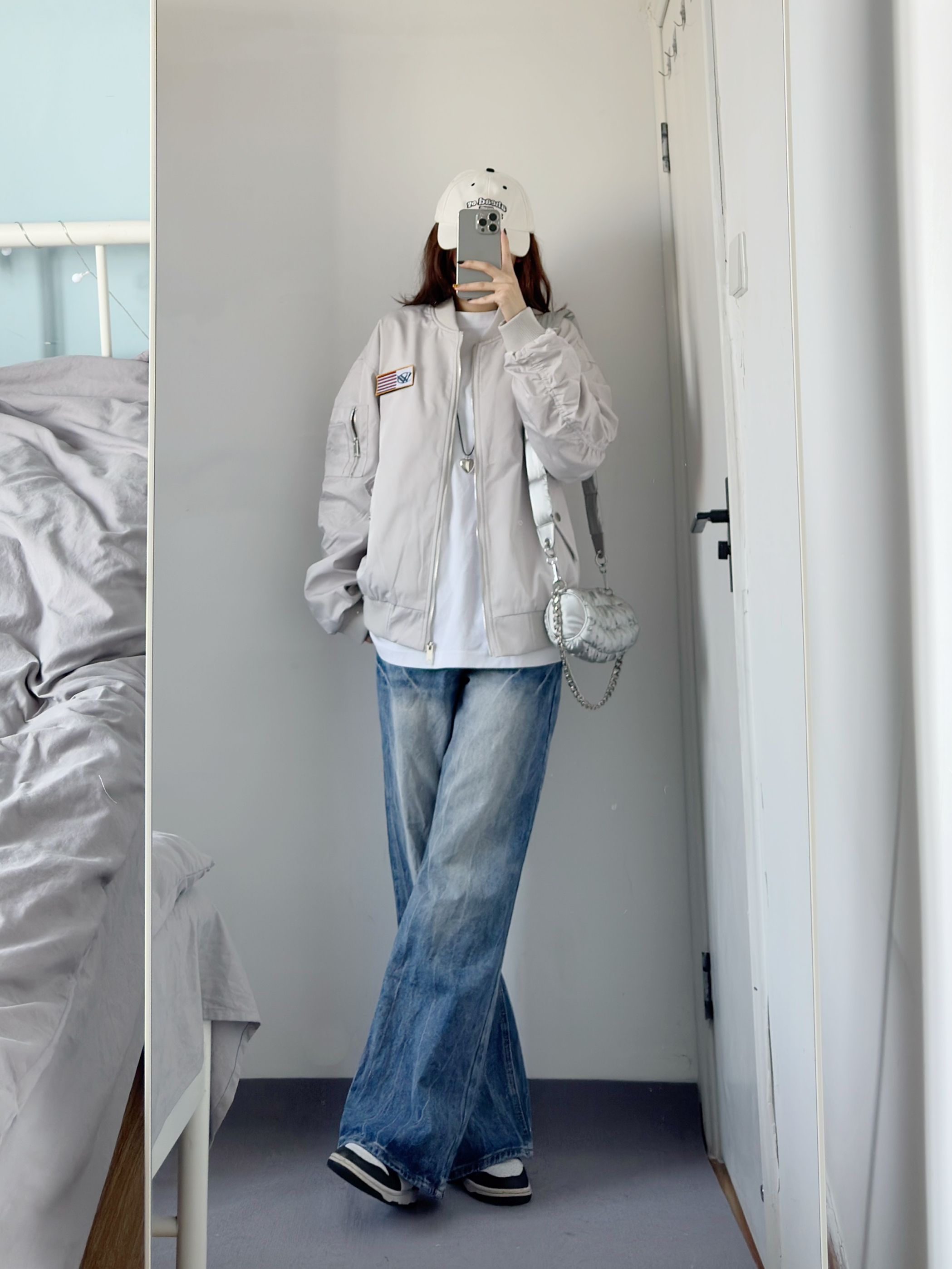 飞行夹克外套也太帅了吧 灰色真的好高级百搭 版型很宽松显瘦 袖子上的褶皱也很有设计感! 搭配牛仔裤一套太帅啦😎