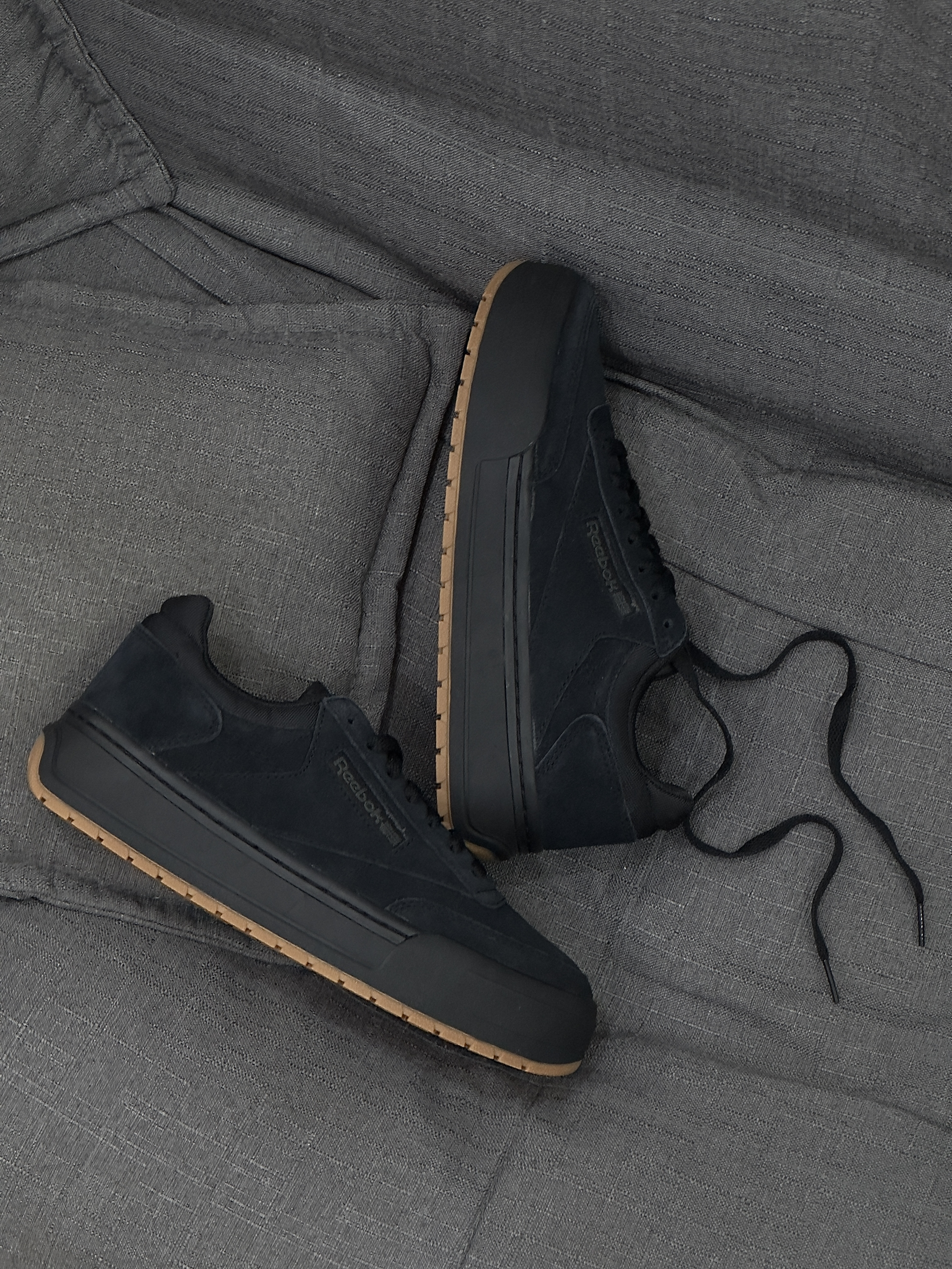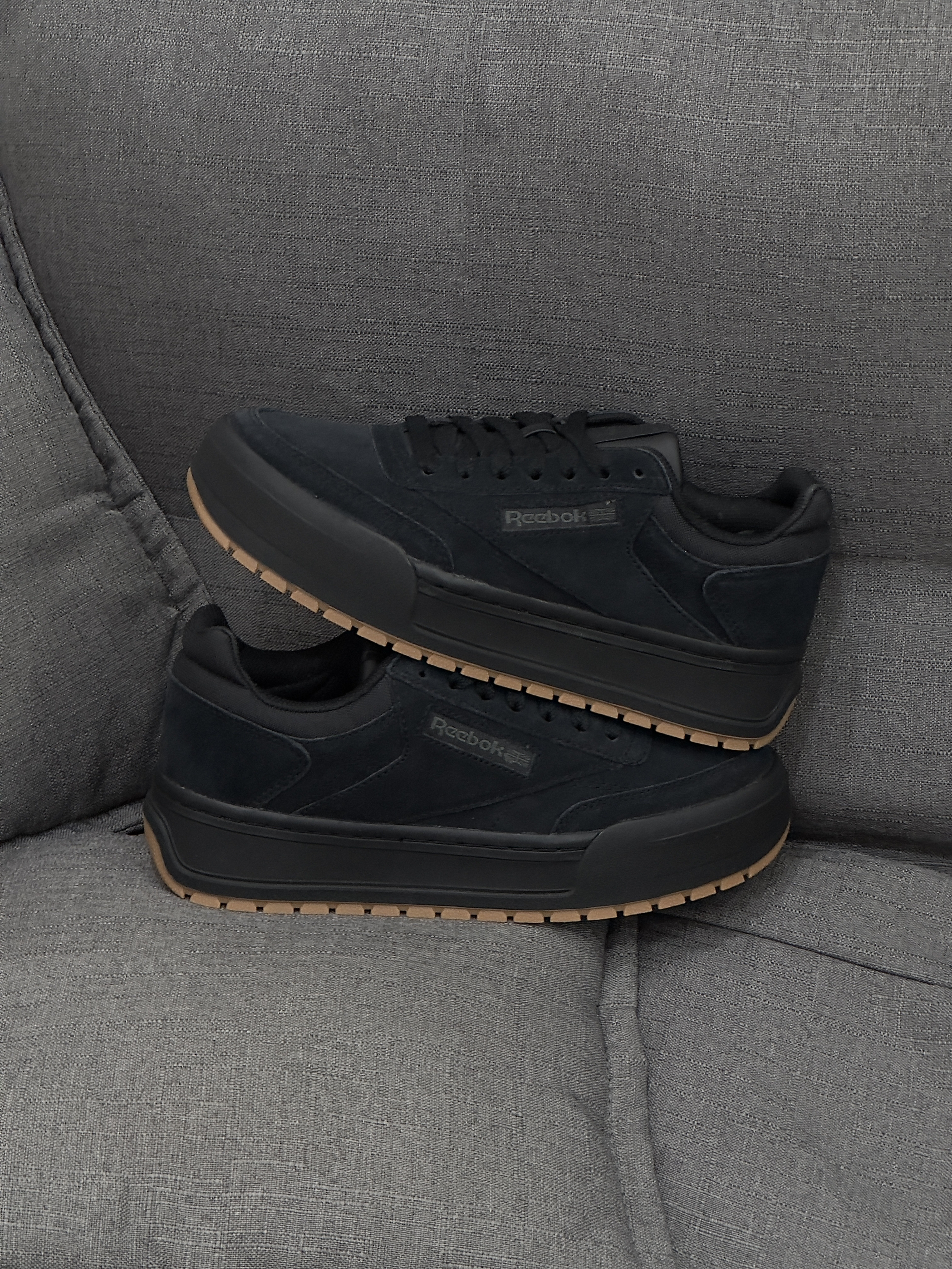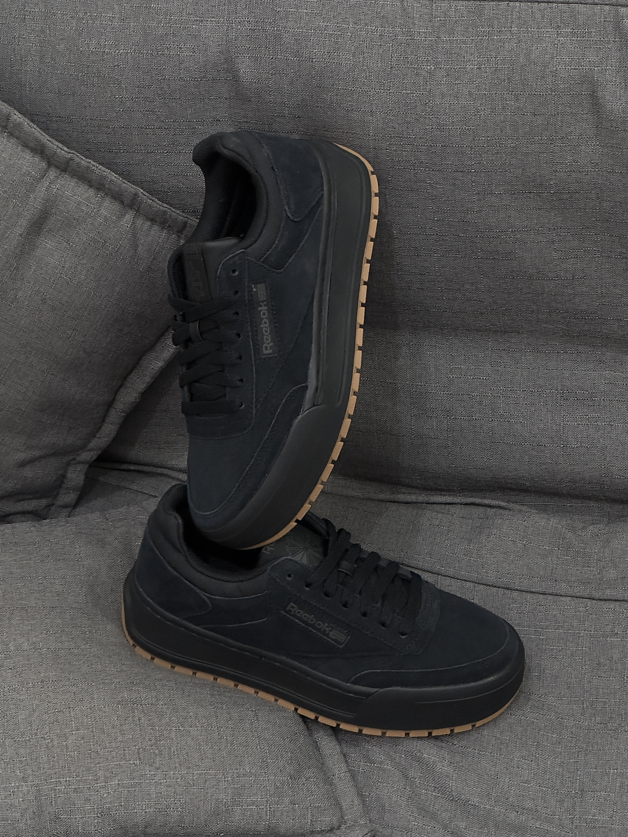 有和我一样喜欢黑色鞋子的嘛❓hello,这里是陈白羊🐑!今天给大家分享一款Reebok的复古板鞋 全黑色🖤的鞋面与咖啡棕胶底的组合, 在翻毛皮材质的衬托下,复古感一下子就上来了 像这样的暗黑系还是男女同款,搭情侣鞋也🉑 而它的中底则是由厚实的EVA发泡☁️构成 脚感柔软舒适 还有着4cm的增高效果 日常拿去搭牛仔裤👖、工装裤都没问题👌 又🆒又帅 很有vibe~