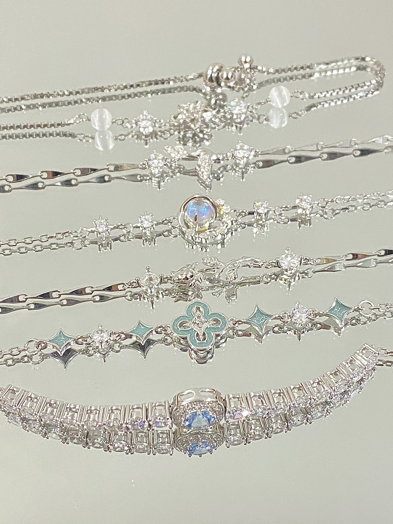 闪闪的东西就真的很招女孩子喜欢啊! 我给自己准备的过年手链好米!好闪! 全是带闪闪皓石的 但!不会很单调的那种 因为中间穿插的小图案都很有氛围感 这样戴在手上既能增加层次感 让它灵动的跟随动作摆动 但又不会千篇一律的 很适合搭一些精致感比较强的衣服! 直接富家千金感拉满