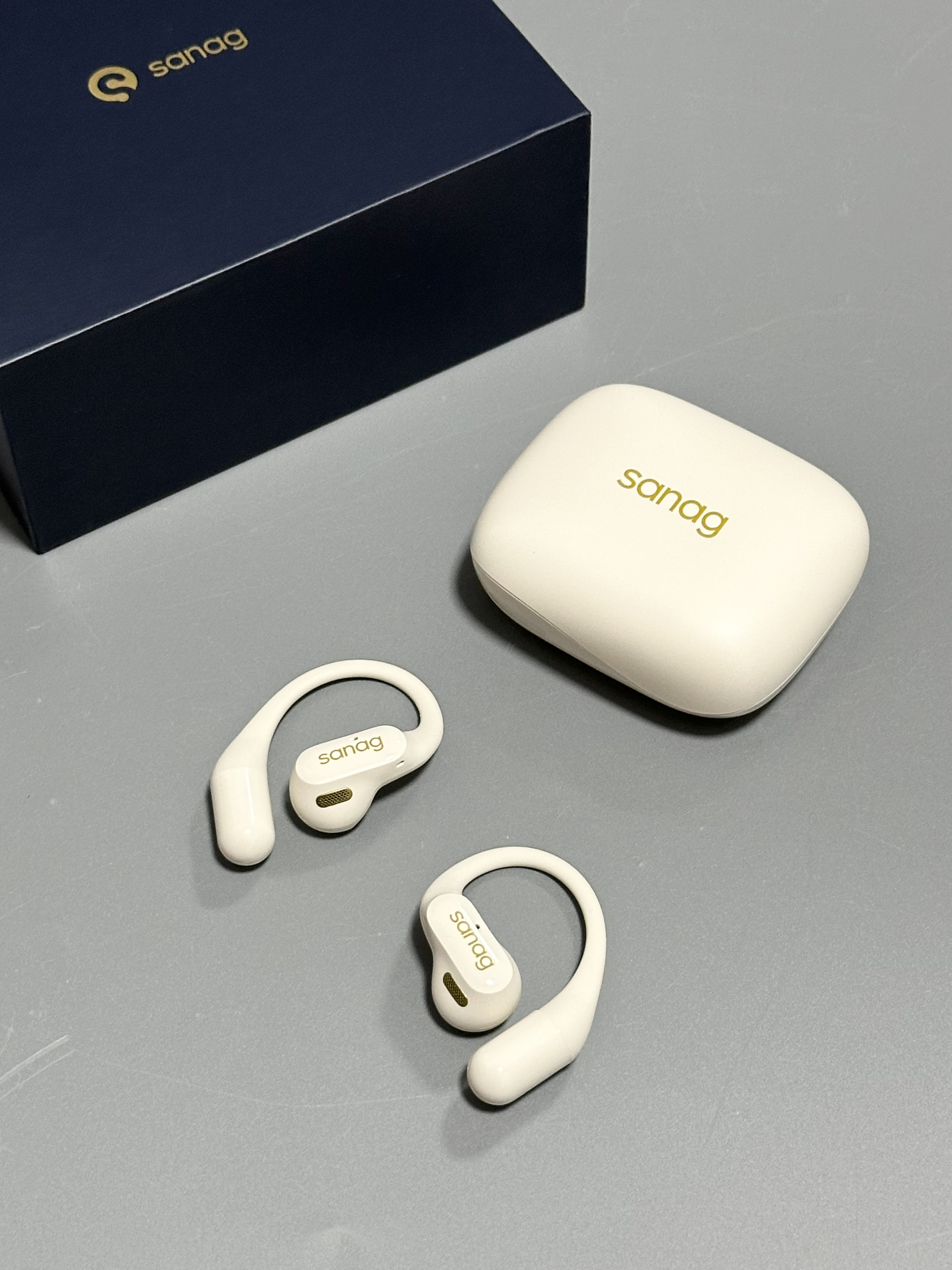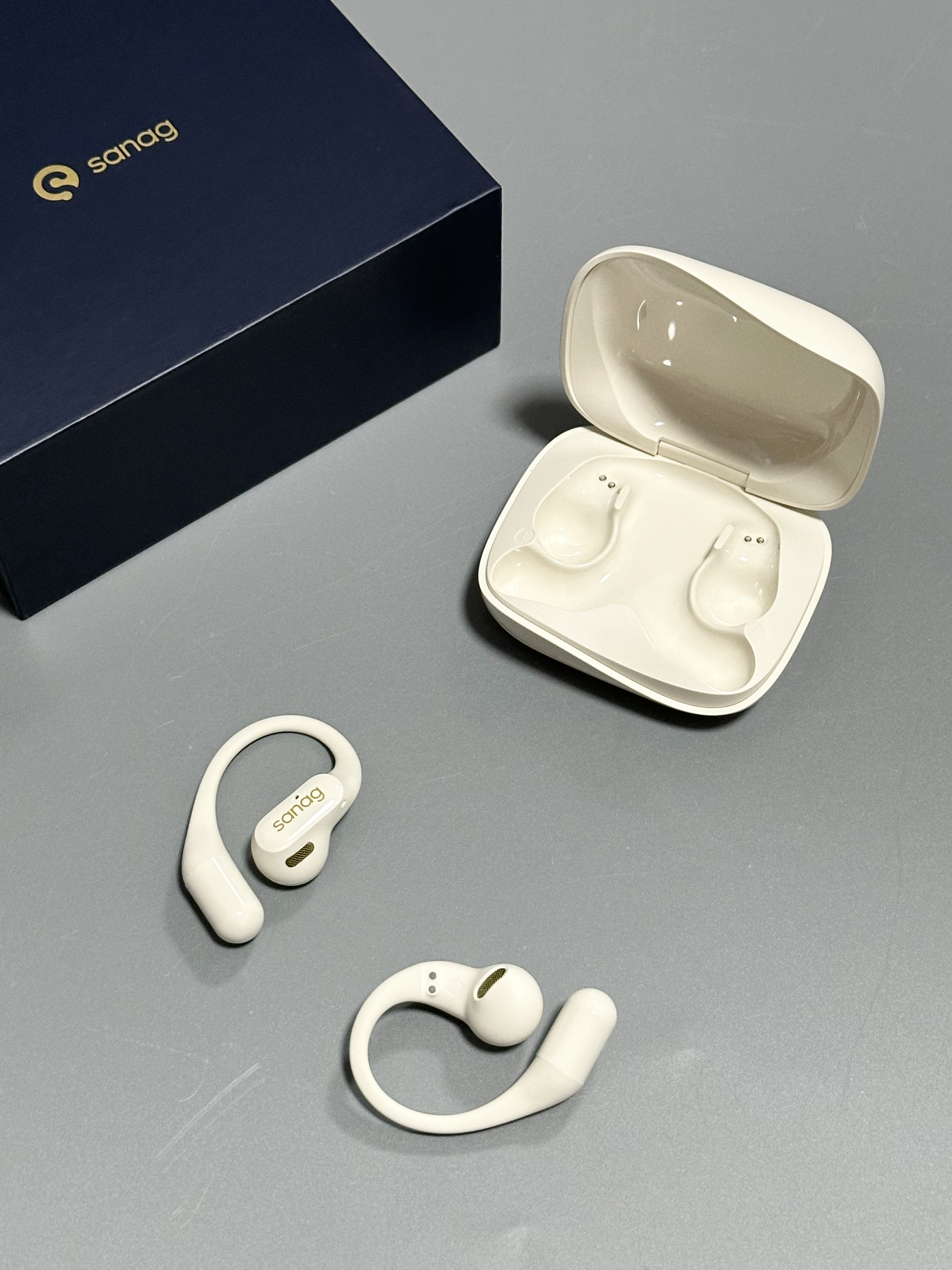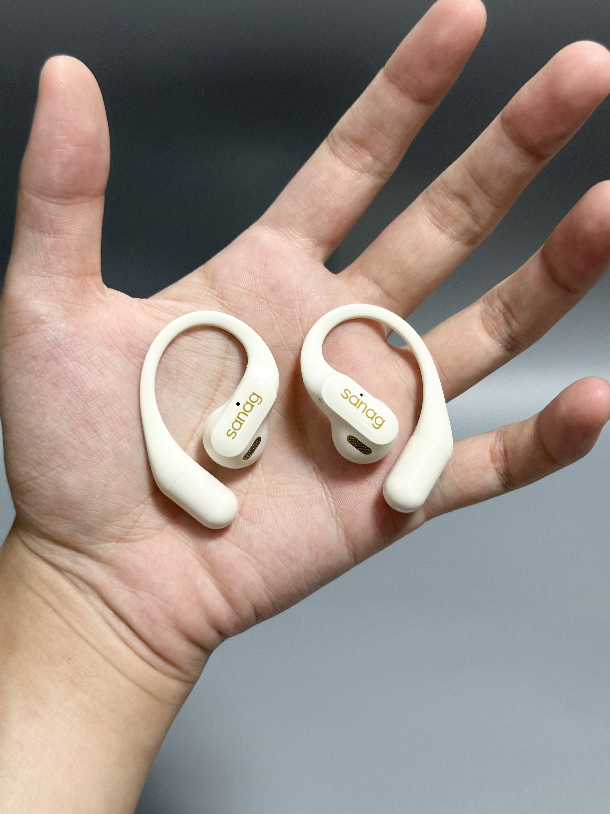 就是Sanag家的这个气骨传导耳机 好喜欢这种奶呼呼的米色~ 蓝牙链接速度挺快的 戴上没有一点延迟 音质也很棒 给我一种身临其境的感觉 我用了一天也还有点 续航也嘎嘎厉害 而且挂耳设计的耳机戴着好舒服~ 戴上它感觉真的巨帅!谁懂!!!