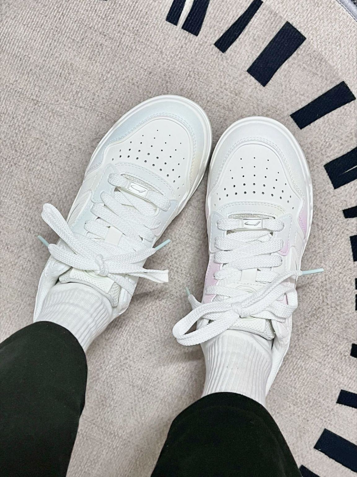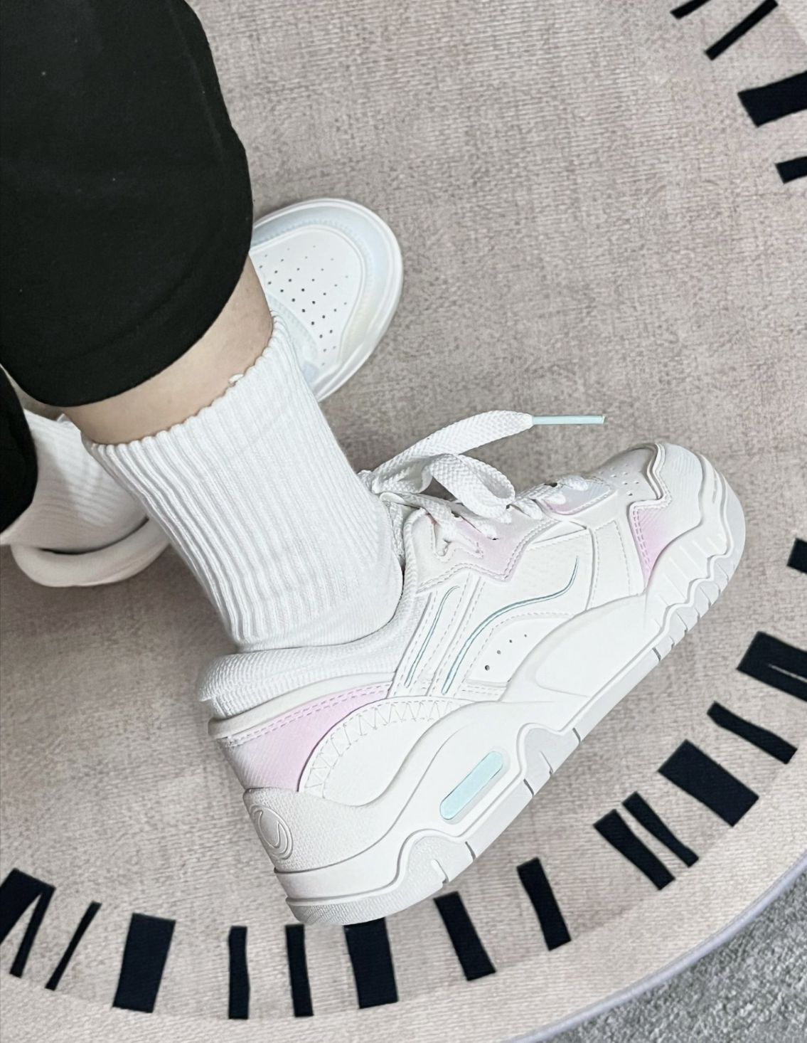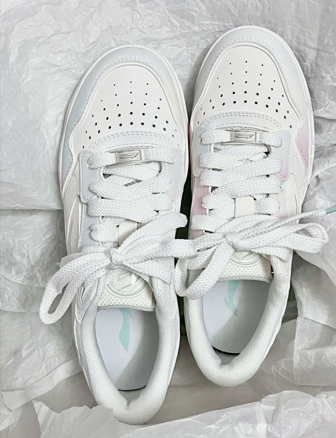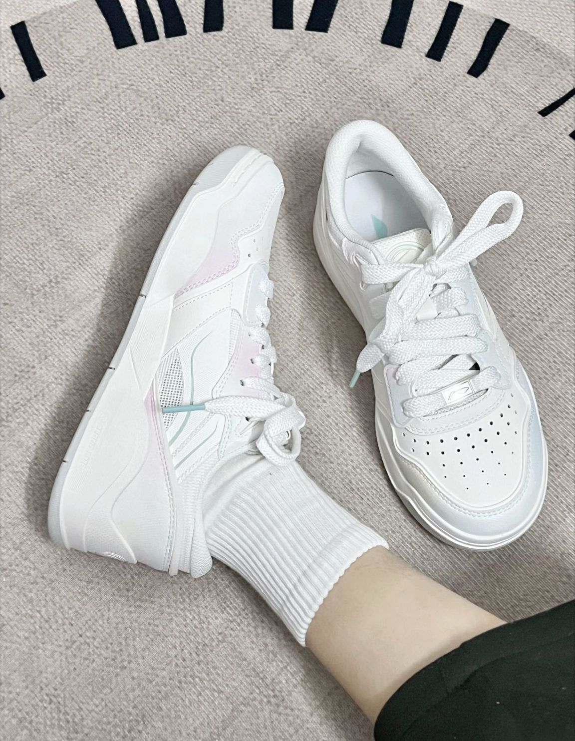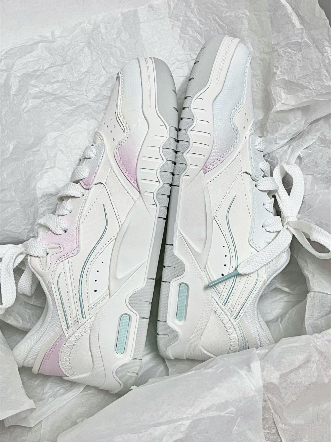 有被李宁月白3.0给美到诶淡粉色+薄荷绿配色有种春天的感觉呢 鞋底可亮眼了,上脚很乖巧 鞋子轻巧,穿着软弹舒适 平时搭配牛仔裤、小裙子都很好看的