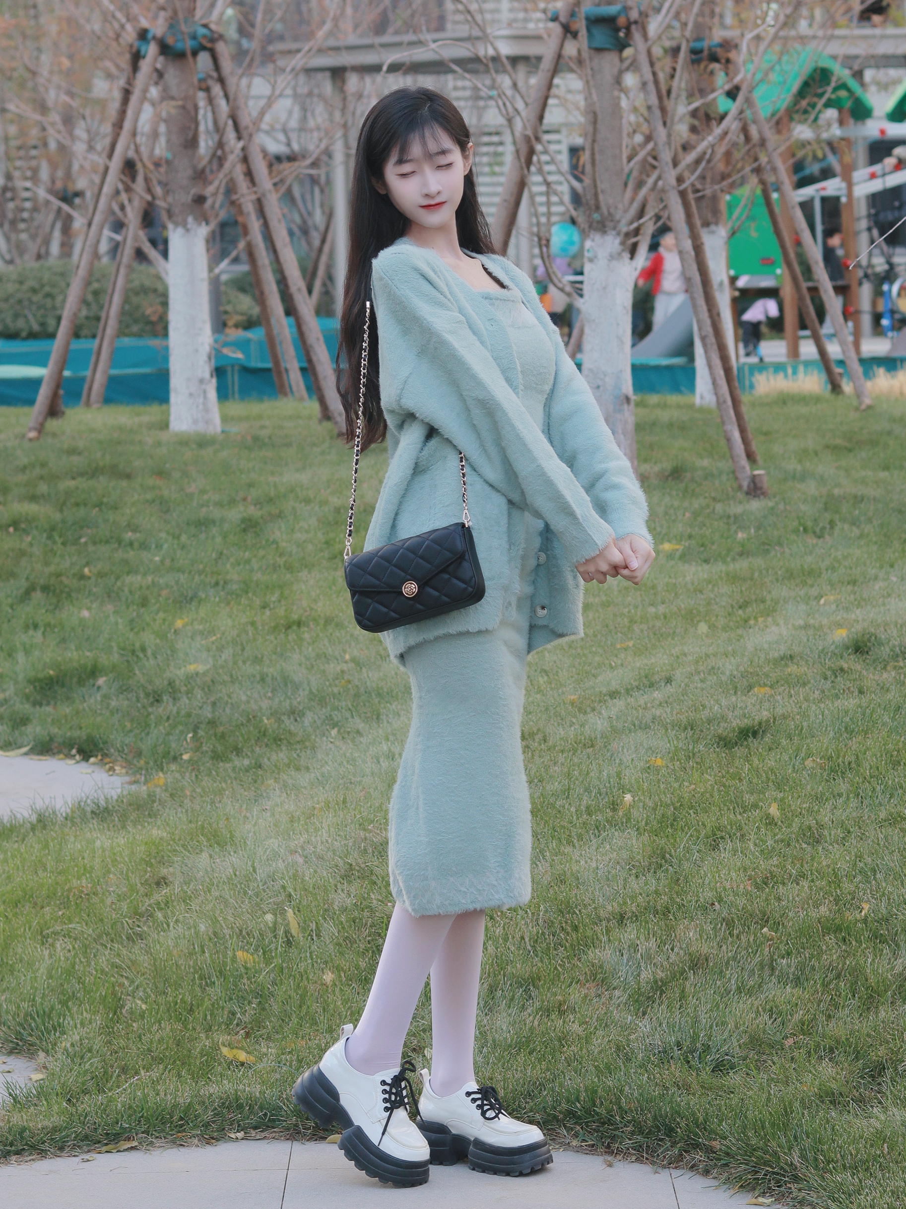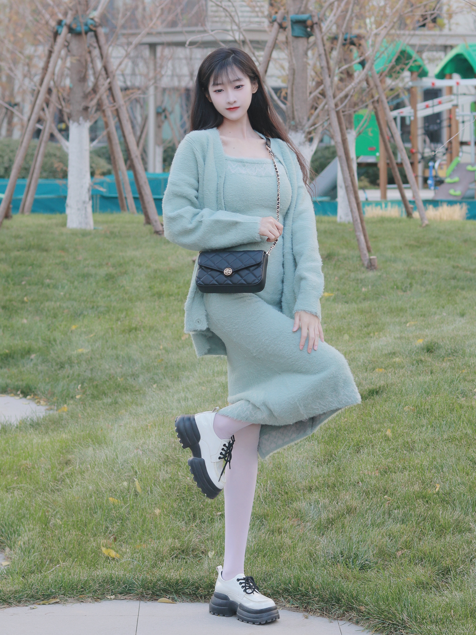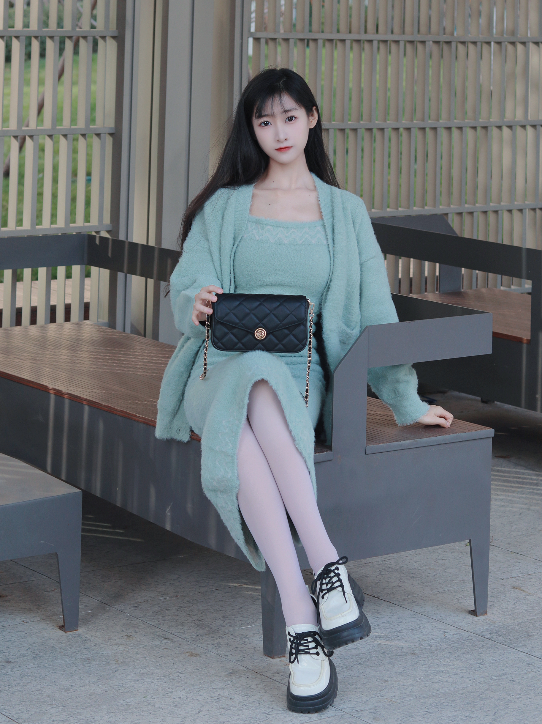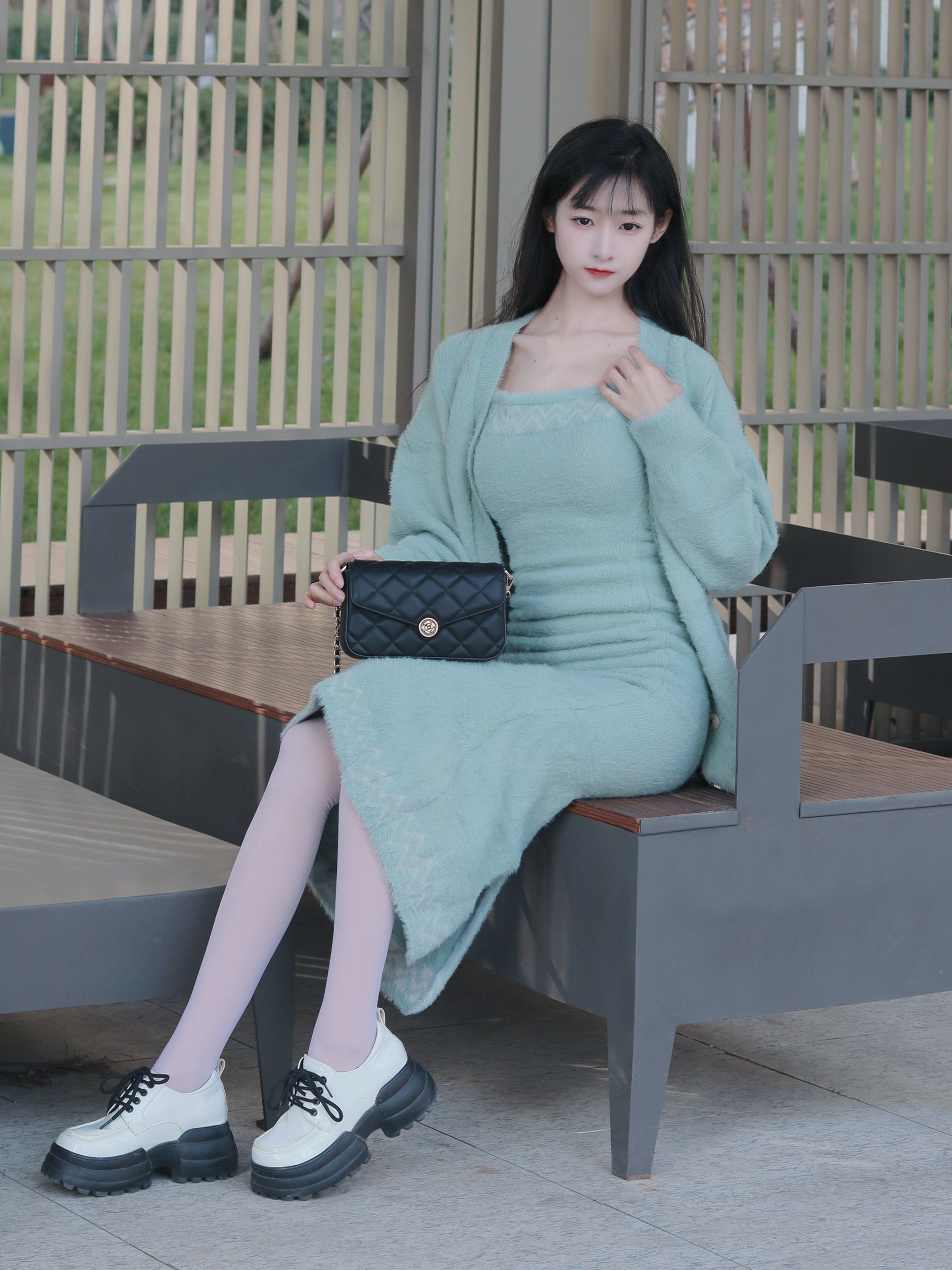 浅绿色套装🧥修身显瘦~ 搭配黑色挎包👜 更显优雅感十足~