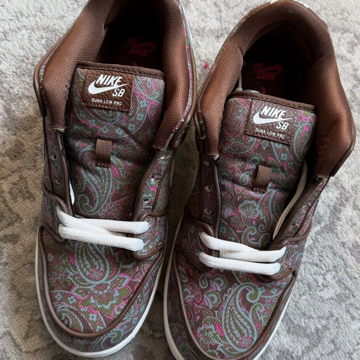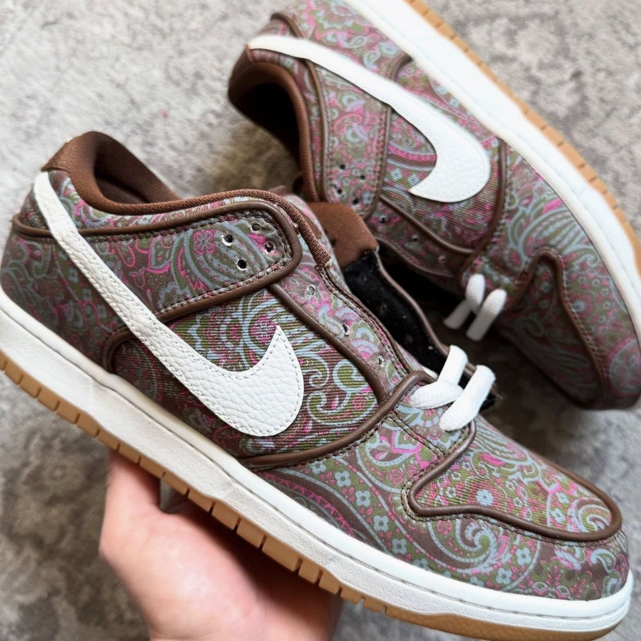 瞅瞅这双Nike SB Dunk Low Pro呀,妥妥的男女通吃款~鞋面布满超美的佩斯利花纹,色彩搭配复古又吸睛,棕色、粉色、蓝绿色交织在一起,好像把浪漫的小花园穿在了脚上呢。 材质也超有质感,不同部位的布料拼接,结实又耐穿。鞋舌上的小标标,带着Nike SB的标志,细节感满满。 穿着它超舒服,鞋型贴合脚丫子,鞋垫软软的,走路久了也不会累。它原本是为滑板运动设计的,所以鞋底的抓地力特别强...
