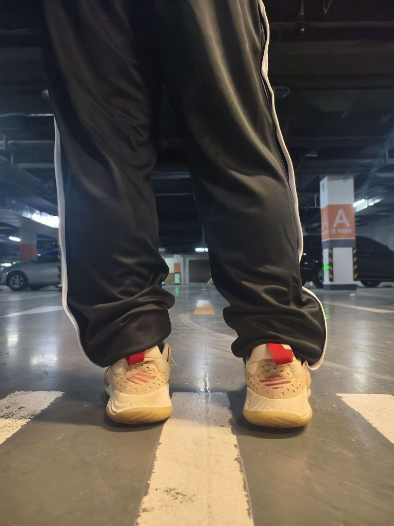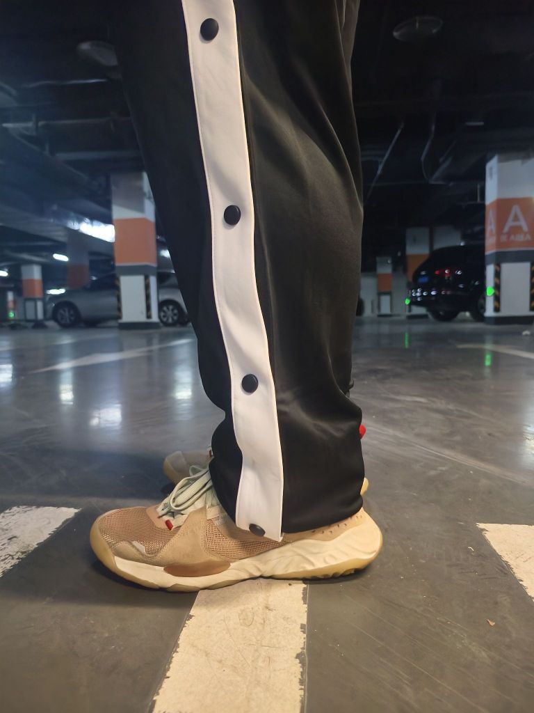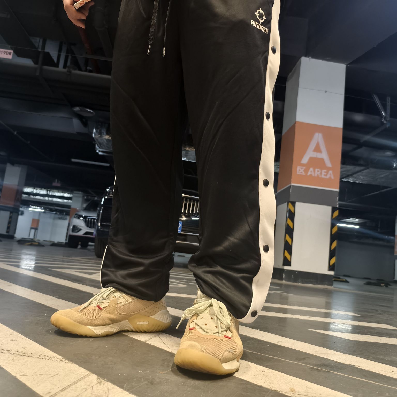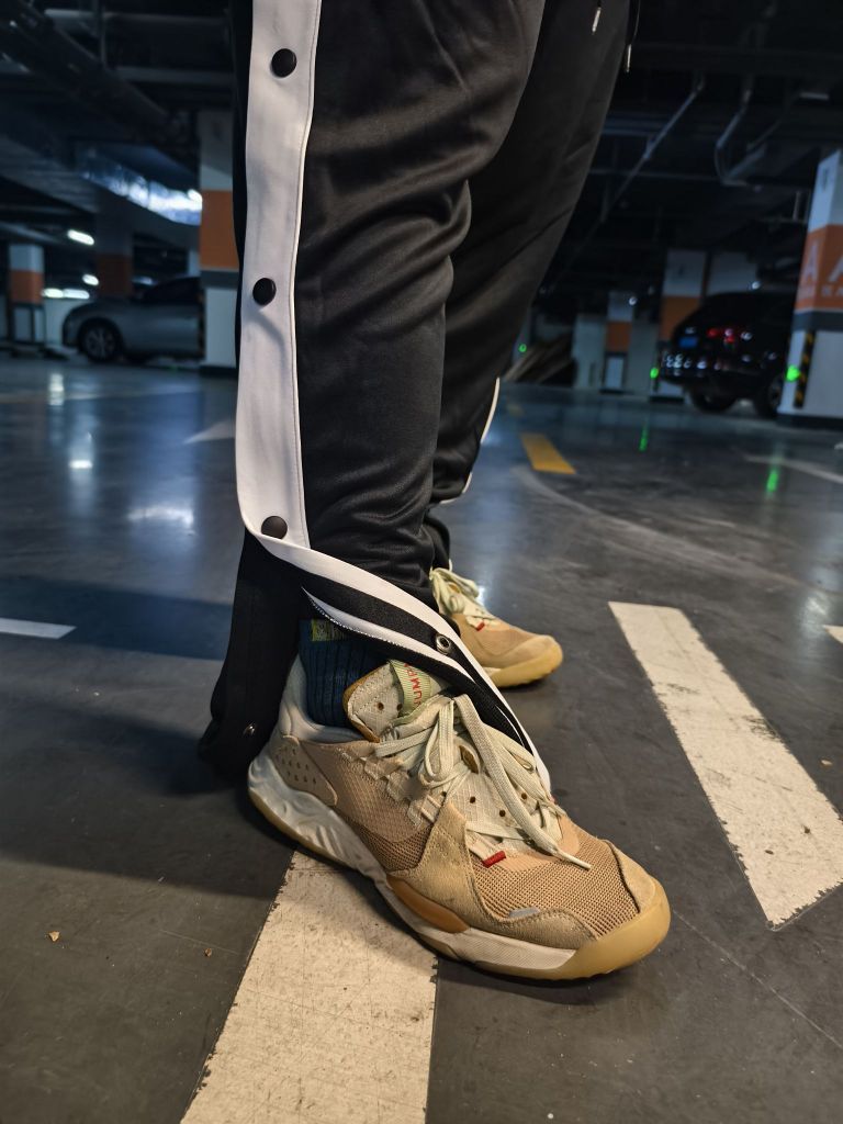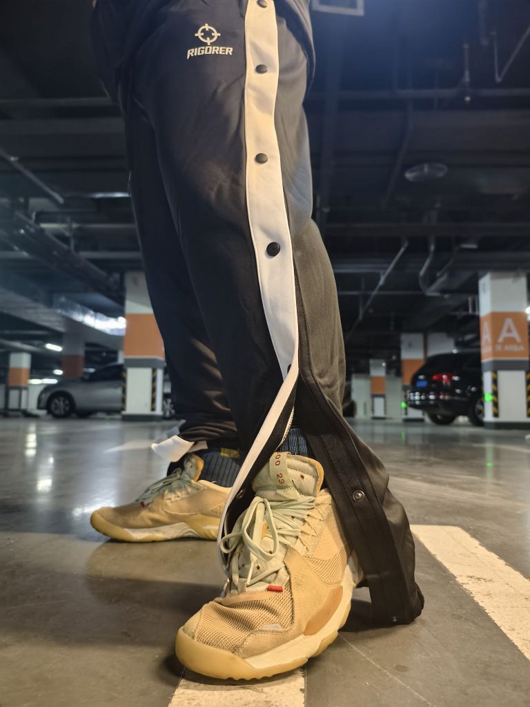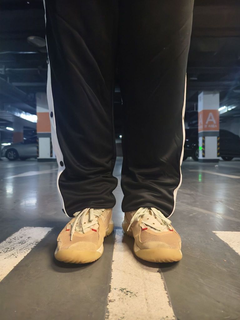 地库老背景了 今晚地库上脚的Jordan Delta,曾经在20年3月由陈冠希率先曝光的鞋款。这个Vachetta Tan配色被戏称之为火星鞋配色,卡其色鞋面+薄荷绿的小清新鞋带还有反光小细节,个人觉得经久耐看,同时也更耐脏。全掌React材质还是那么韧弹,透气的梭织网面,配上麂皮材质,质感满满。上脚就是感觉很轻便,百穿不厌~ 👖准者排扣裤 打球出街穿搭借🉑!一套一扒就完事~