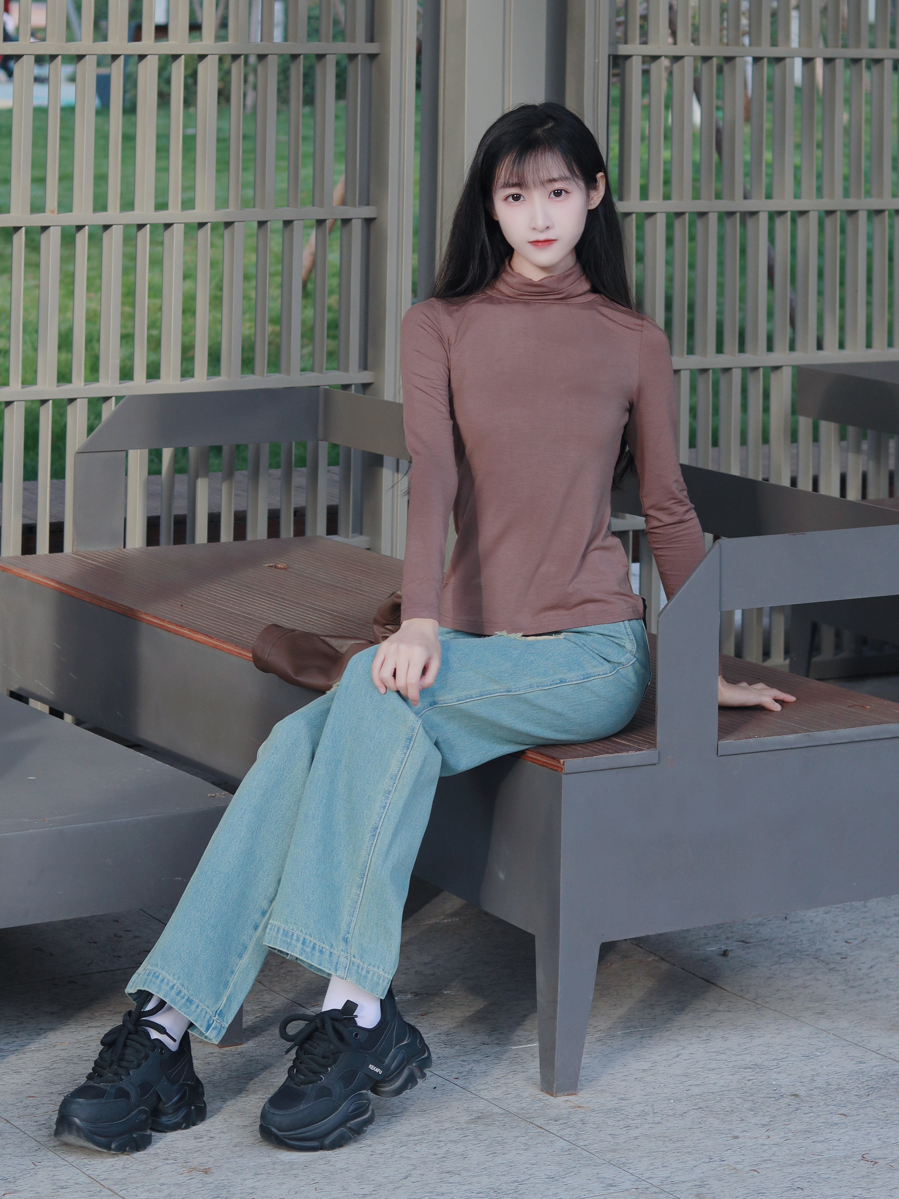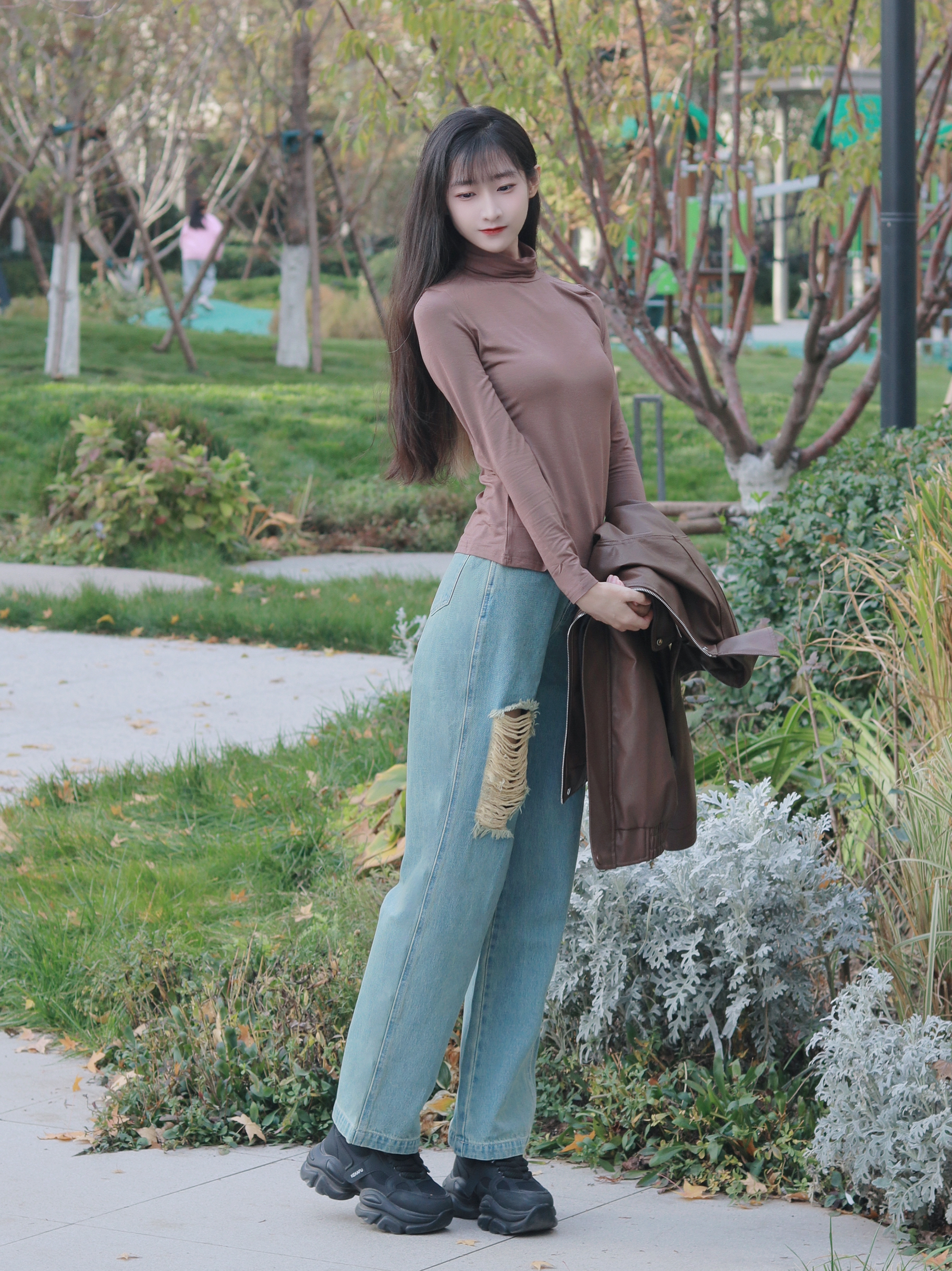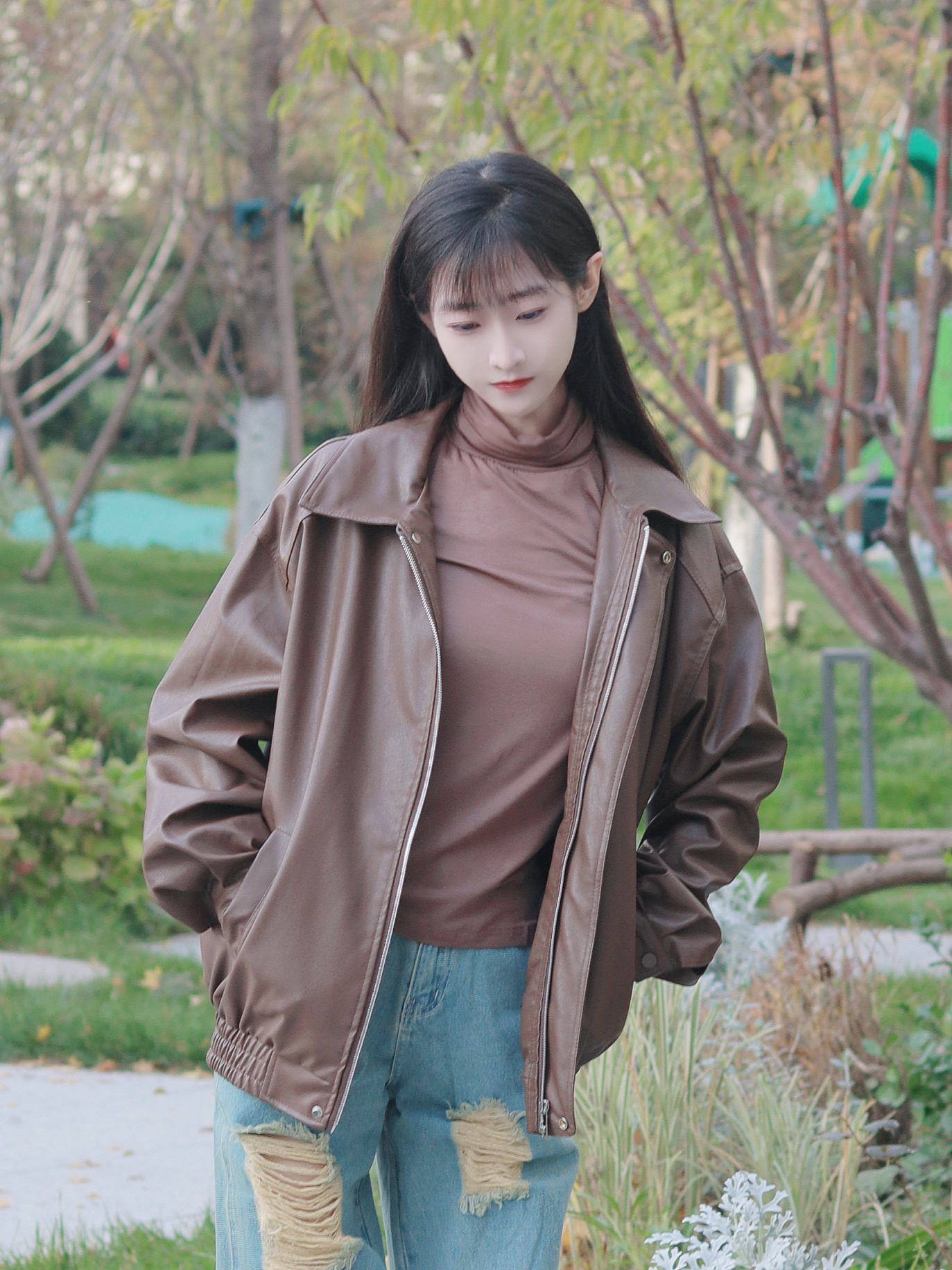 高领上衣🏾简约个性 搭配宽松牛仔裤👖和皮衣外套 个性十足又不失时尚感~