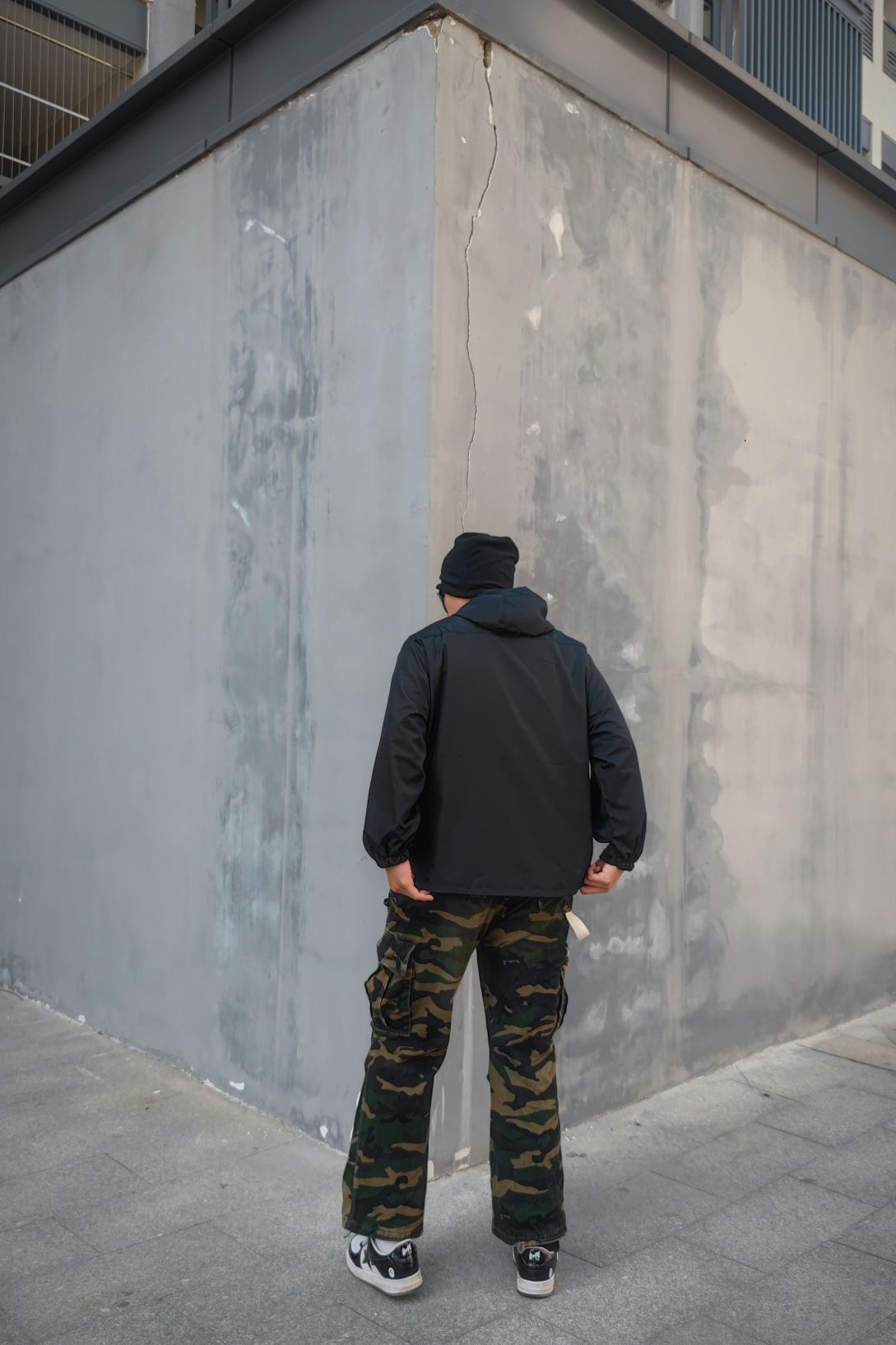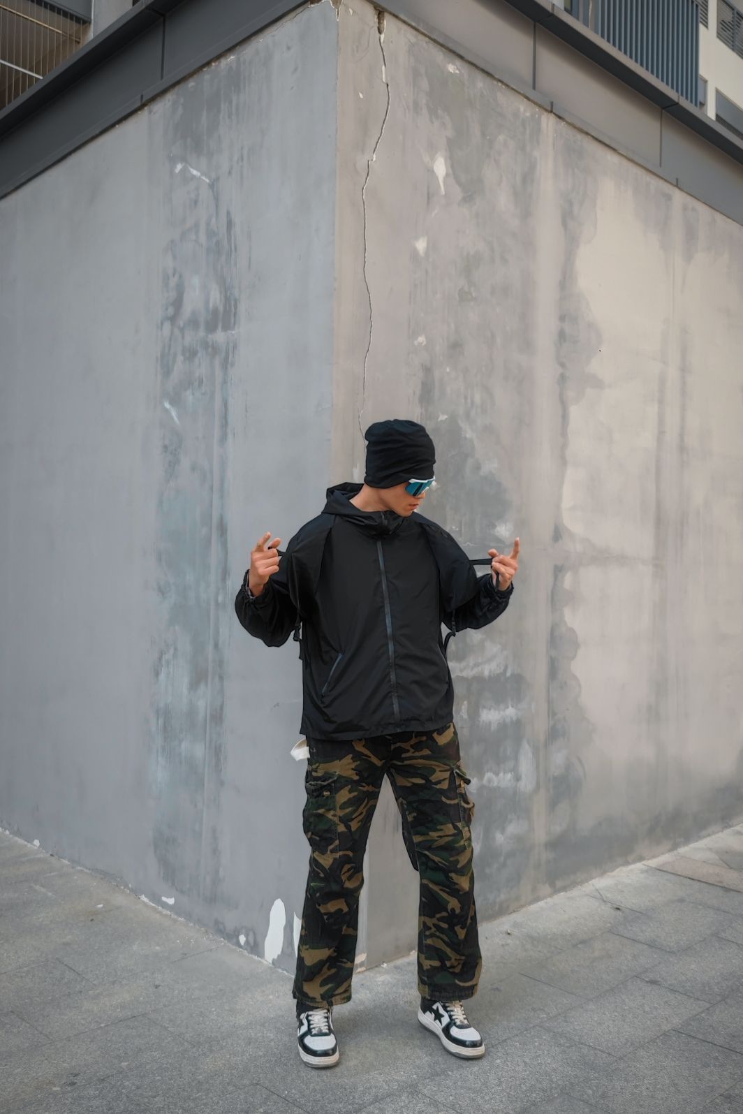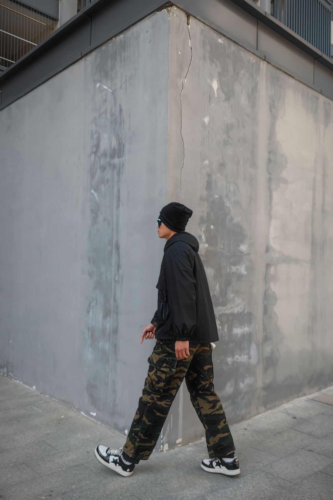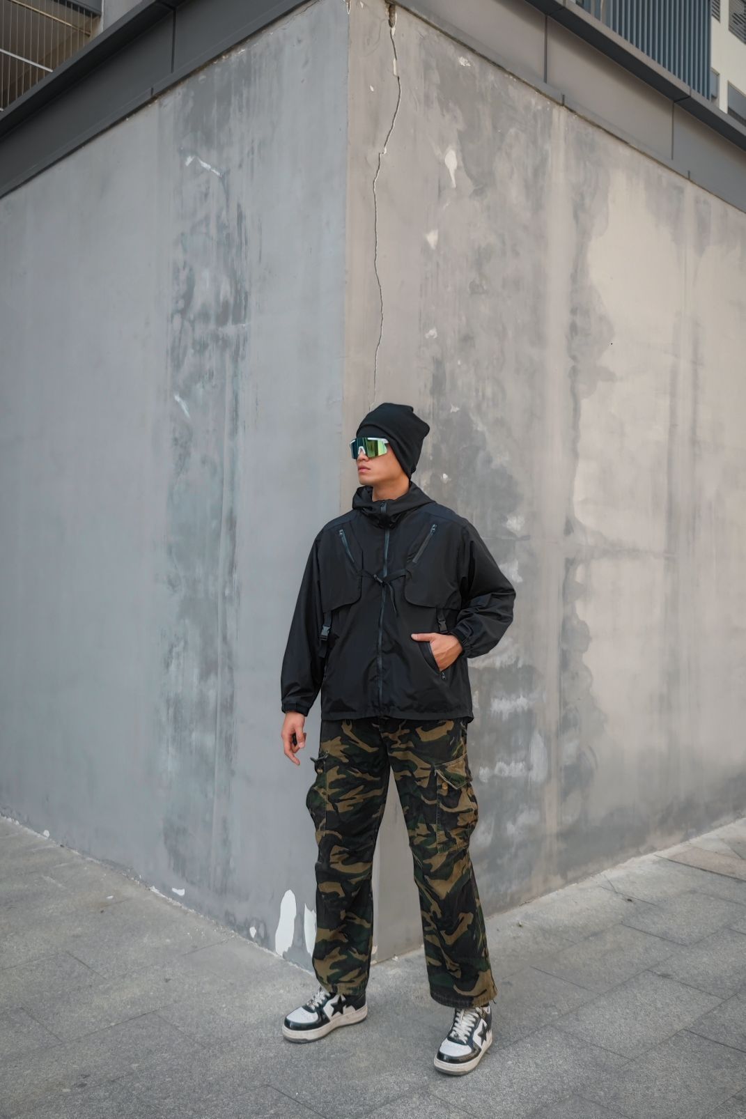 🧢帽子是堆堆帽,头发炸毛不想打理的bro可以安排一下。 👓骑行的眼镜,除了日常骑行,穿搭也是不错的搭配。通勤🧥Foag运动款冲锋衣,透气速干的面料,机能设计,简直不要太润爽。 👖迷彩工装裤,松弛感于层次感拉满了,黑色外套于迷 彩裤的穿搭简直一流。 Bape sta的休闲鞋,经典的熊猫配色,日常百搭好鞋。