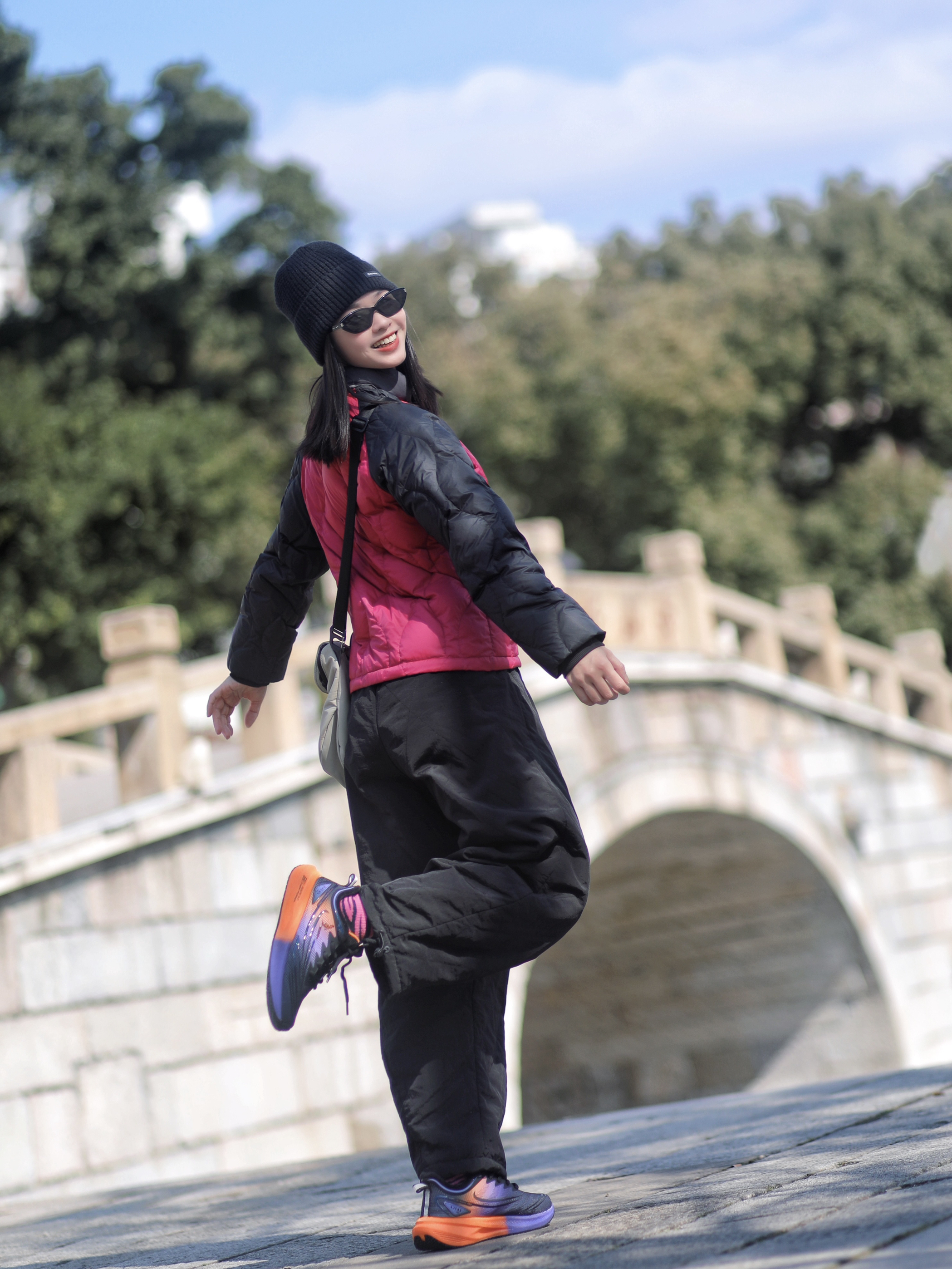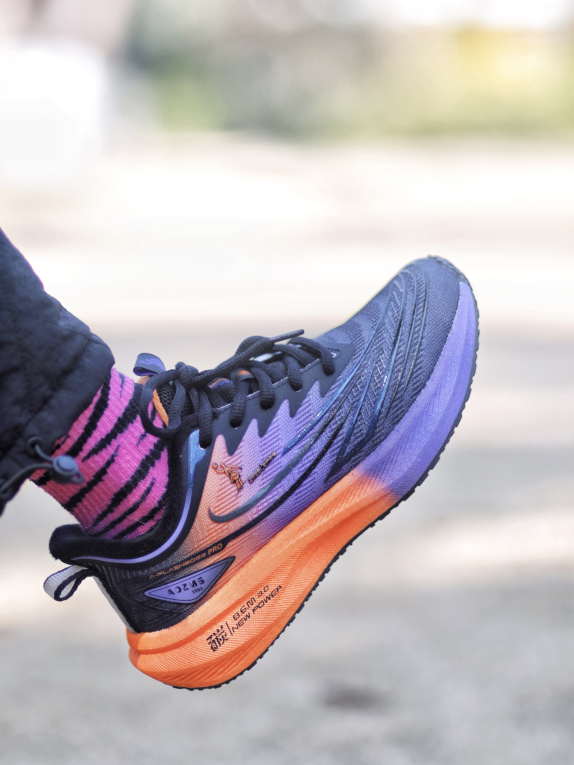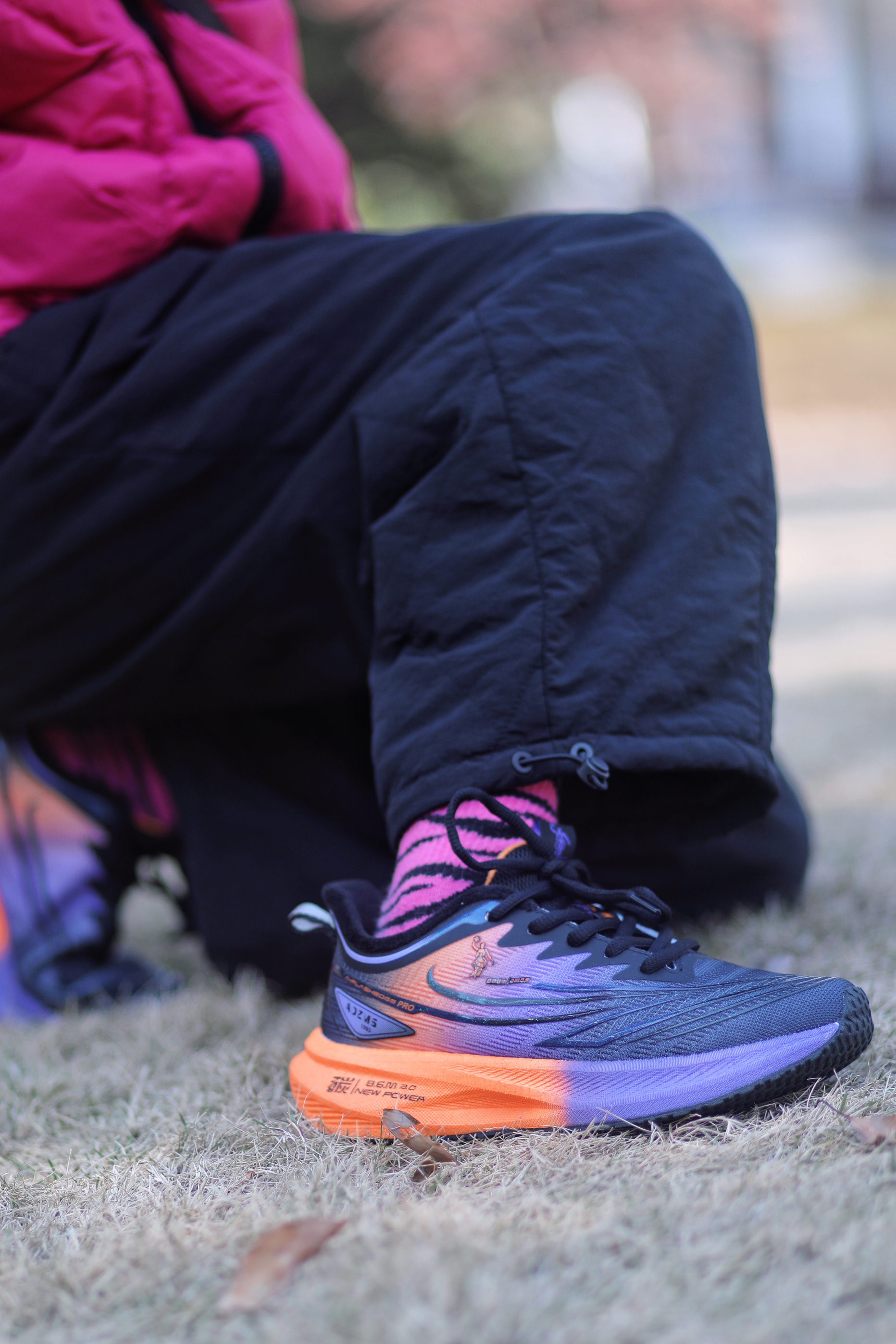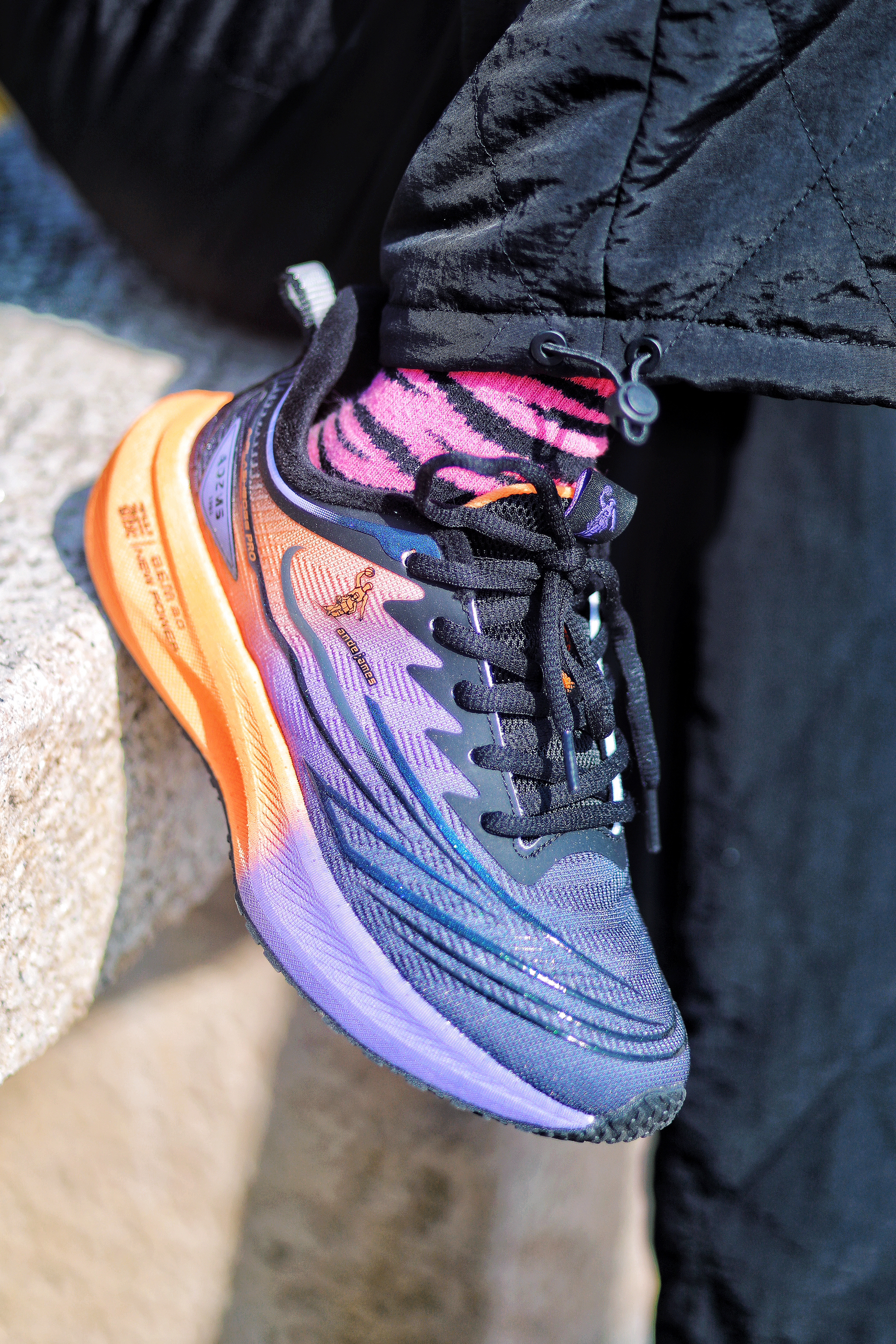 收到了喜欢的跑鞋,赶紧上脚试一试 首先,脚感很舒服,柔软有弹性,里面还是加绒的,冬天穿也太合适了吧。暖暖的。 性能方面,居然是碳板,跑步运动没问题,鞋底防滑性也不错。 了颜值也很ok,黑紫橘配色也太亮眼了,日常穿也很时髦耶