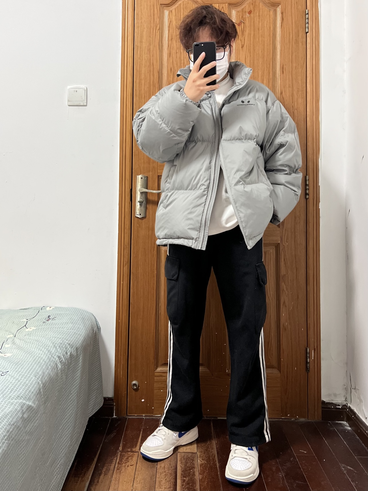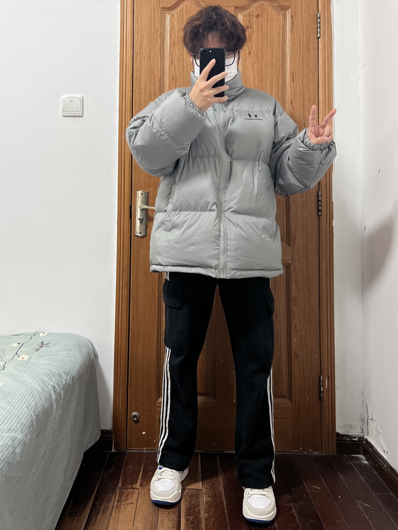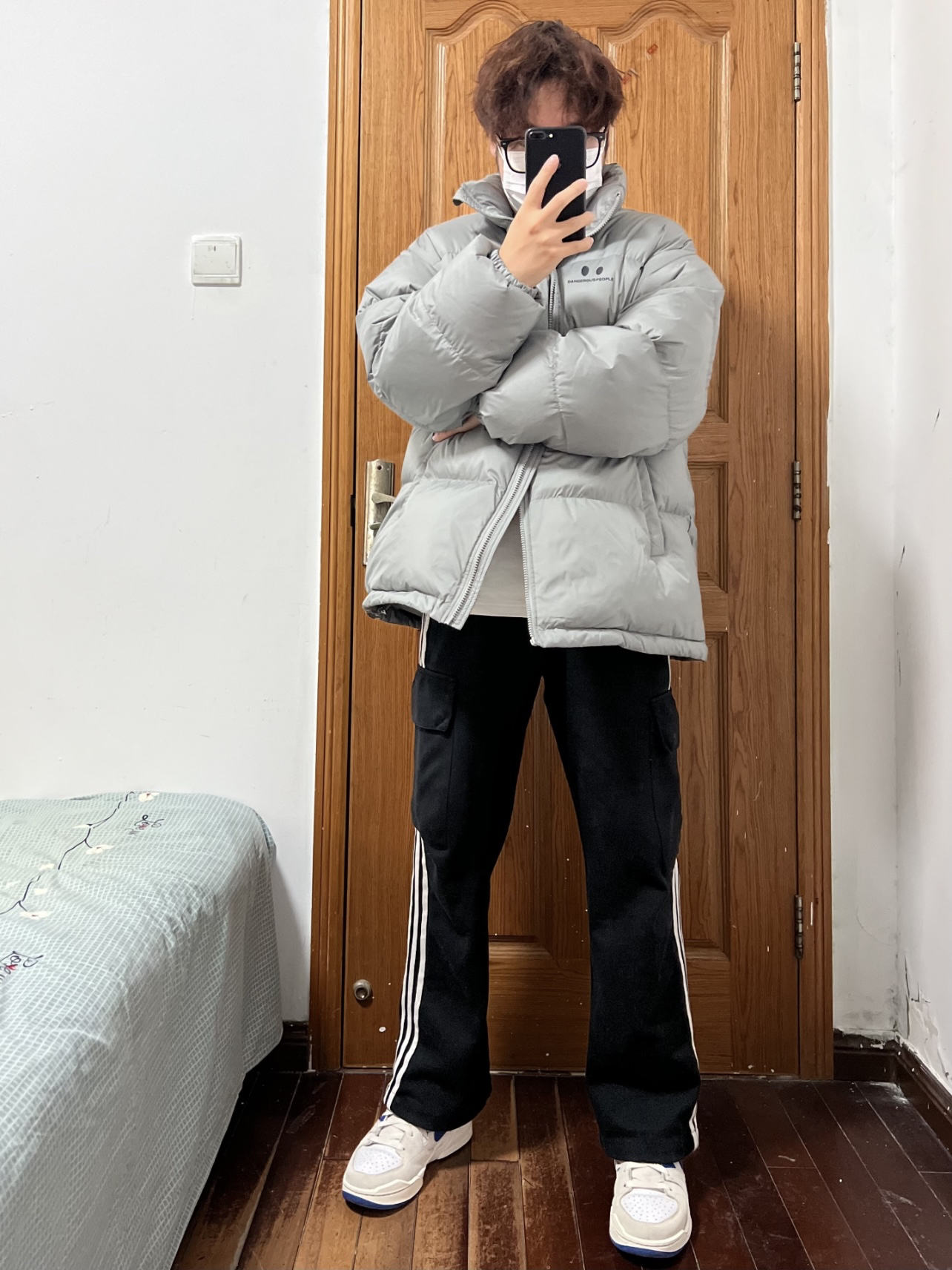 今日份穿搭分享🎉 DANGEROUSPEOPLE立体胶印小眼睛羽绒服 灰色本身就自带高级感💯 超级适合男大穿着啦!少年感穿搭手到擒来 胸口小眼睛👀加logo印花画龙点睛❗️ 面包服的版型蓬松度保暖性都在线 以L码为例充绒205g 内搭我选择白色长袖T简单清爽✌️ 裤子就是黑色长裤搭配小白鞋 👔 DANGEROUSPEOPLE 👖 黑色长裤 👟 Nike 🙋♂️ 170/120斤 L 持...