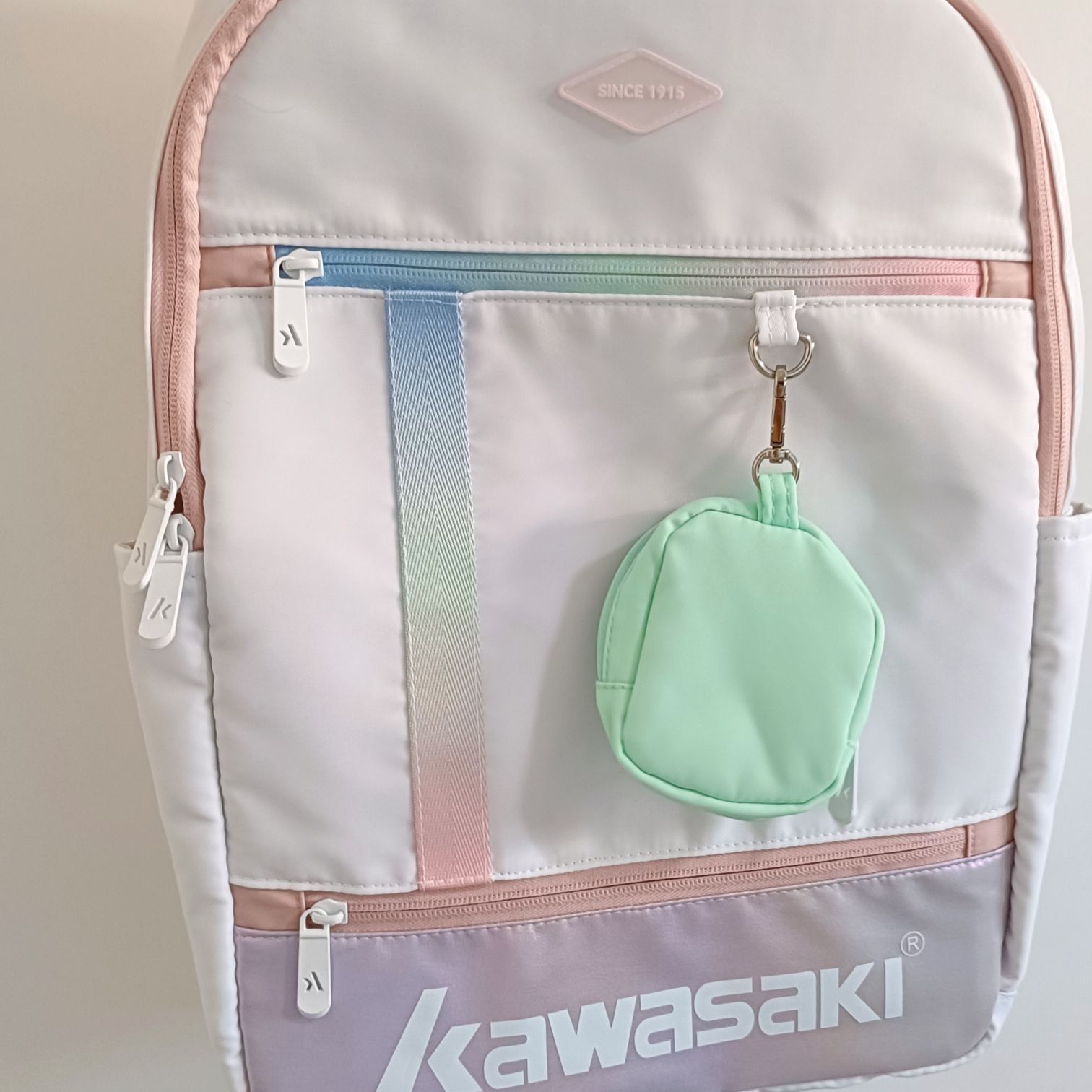 颜值出众:色彩搭配清新柔和,粉、白、紫等色调组合,还有渐变装饰,挂饰可爱,外观时尚吸睛。 品牌可靠:川崎是知名运动品牌,品质有保障,“SINCE 1915”标识彰显品牌历史底蕴。 收纳实用:多个拉链口袋,方便分类存放羽毛球拍、球、衣物等物品,取用便捷。 材质耐用:包身材质结实,做工精细,拉链顺滑,日常使用和携带不易损坏。