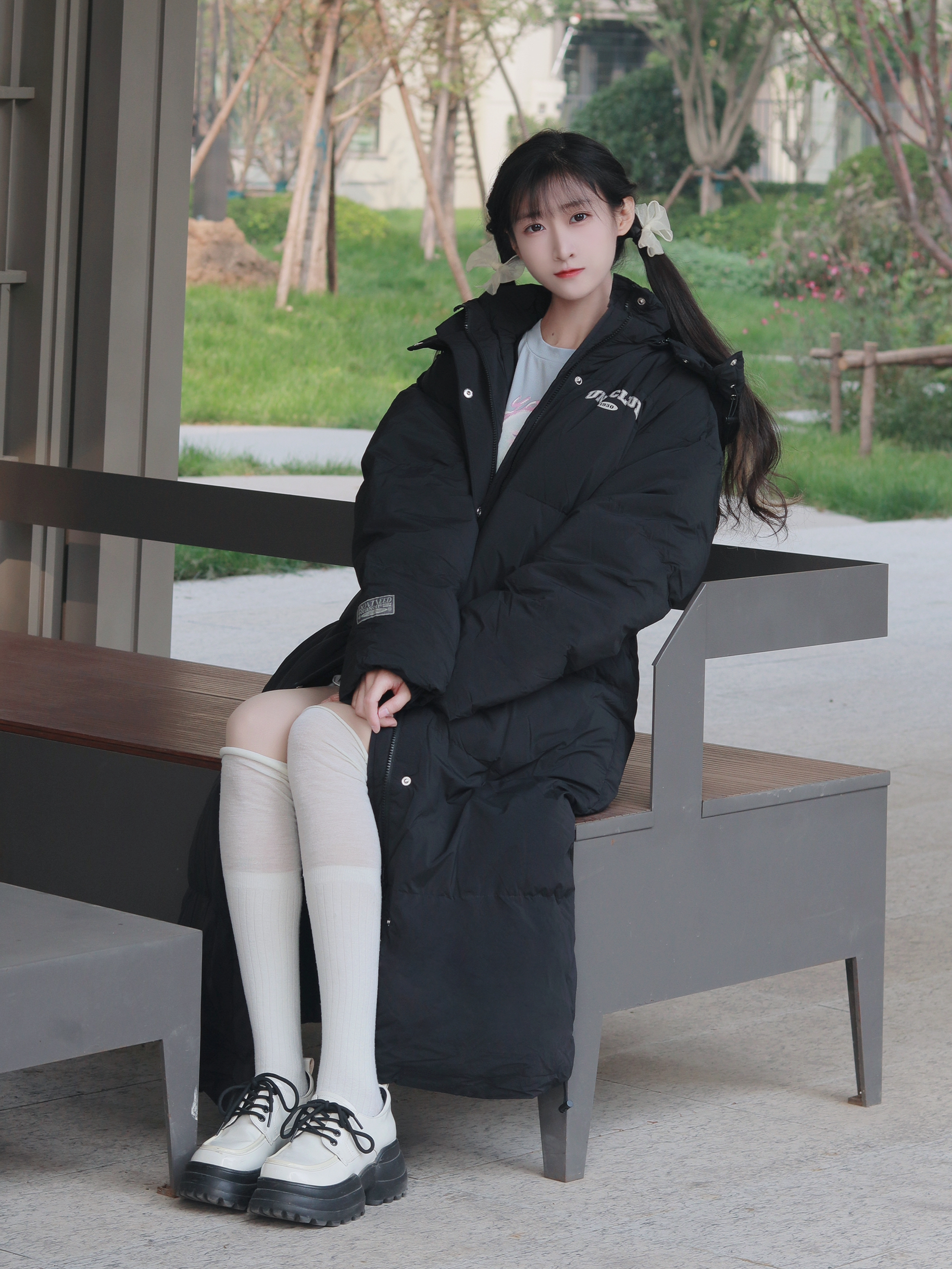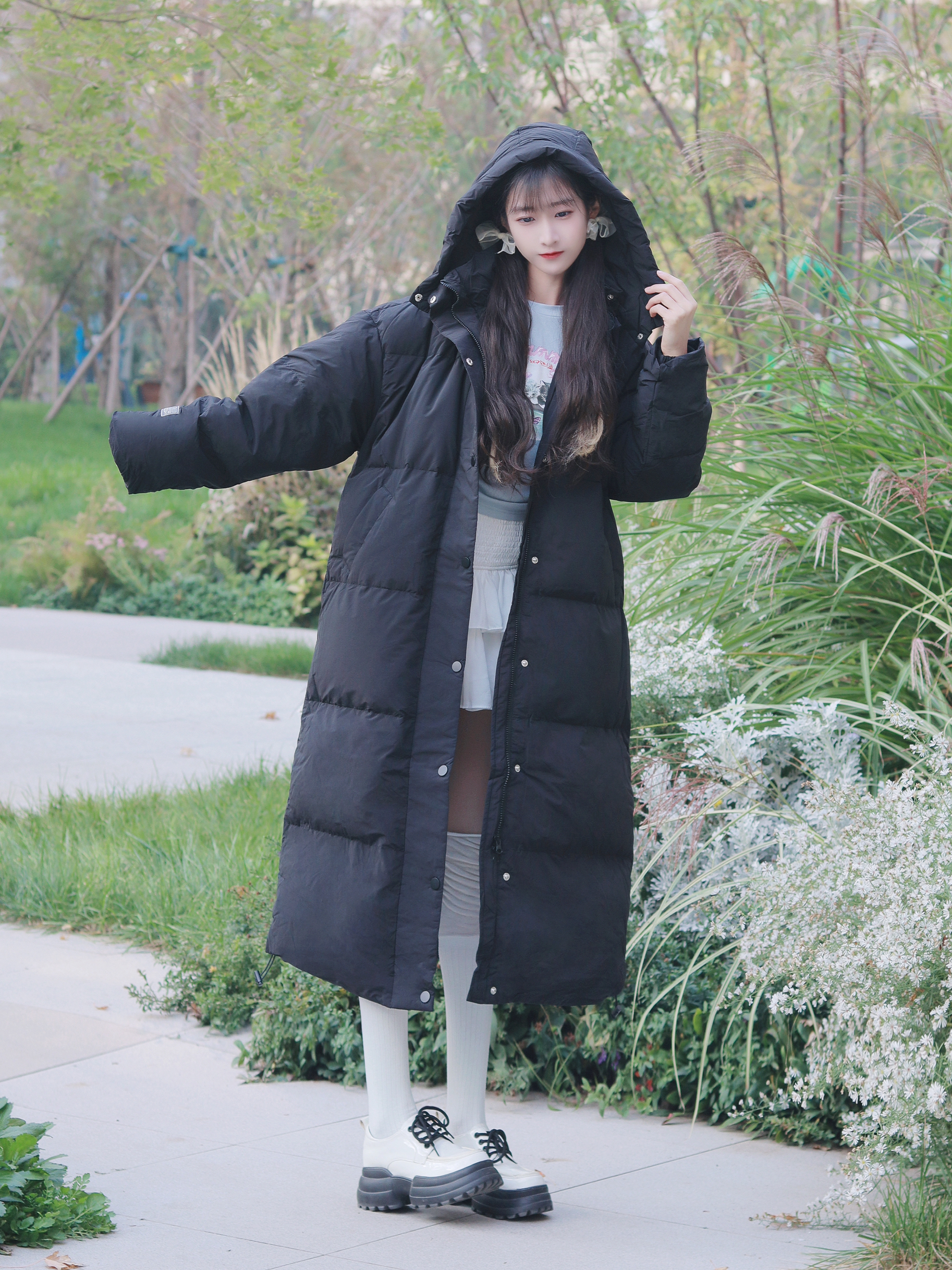 黑色羽绒服🧥保暖厚实 搭配蓝色上衣和蛋糕裙🍰 甜美俏皮又轻松保暖~