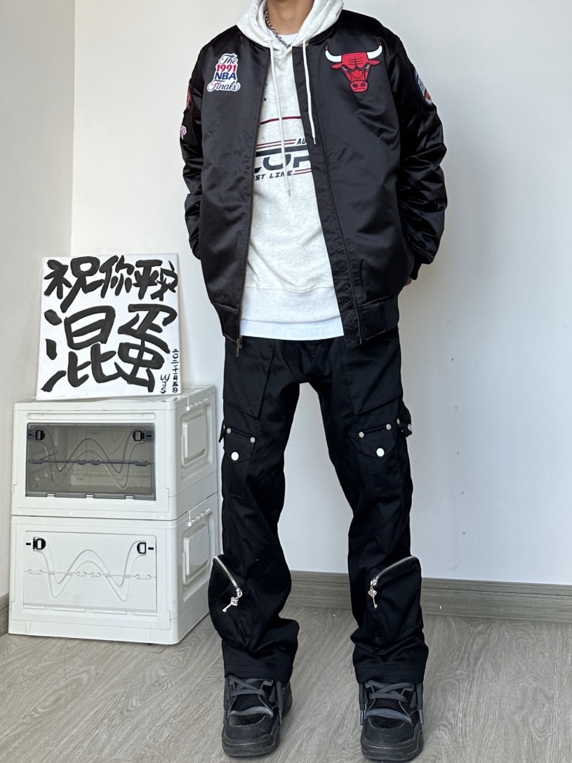 🧩上衣是来自Mitchell &ness的复古缎面棒球服整体版型宽松,刺绣贴布设计很酷!缎面材质上身高级感满满!纯黑配色日常又百搭。 ⛰️来自Treclub的多口袋工装裤,立体口袋设计上身很有层次。@武武二十武