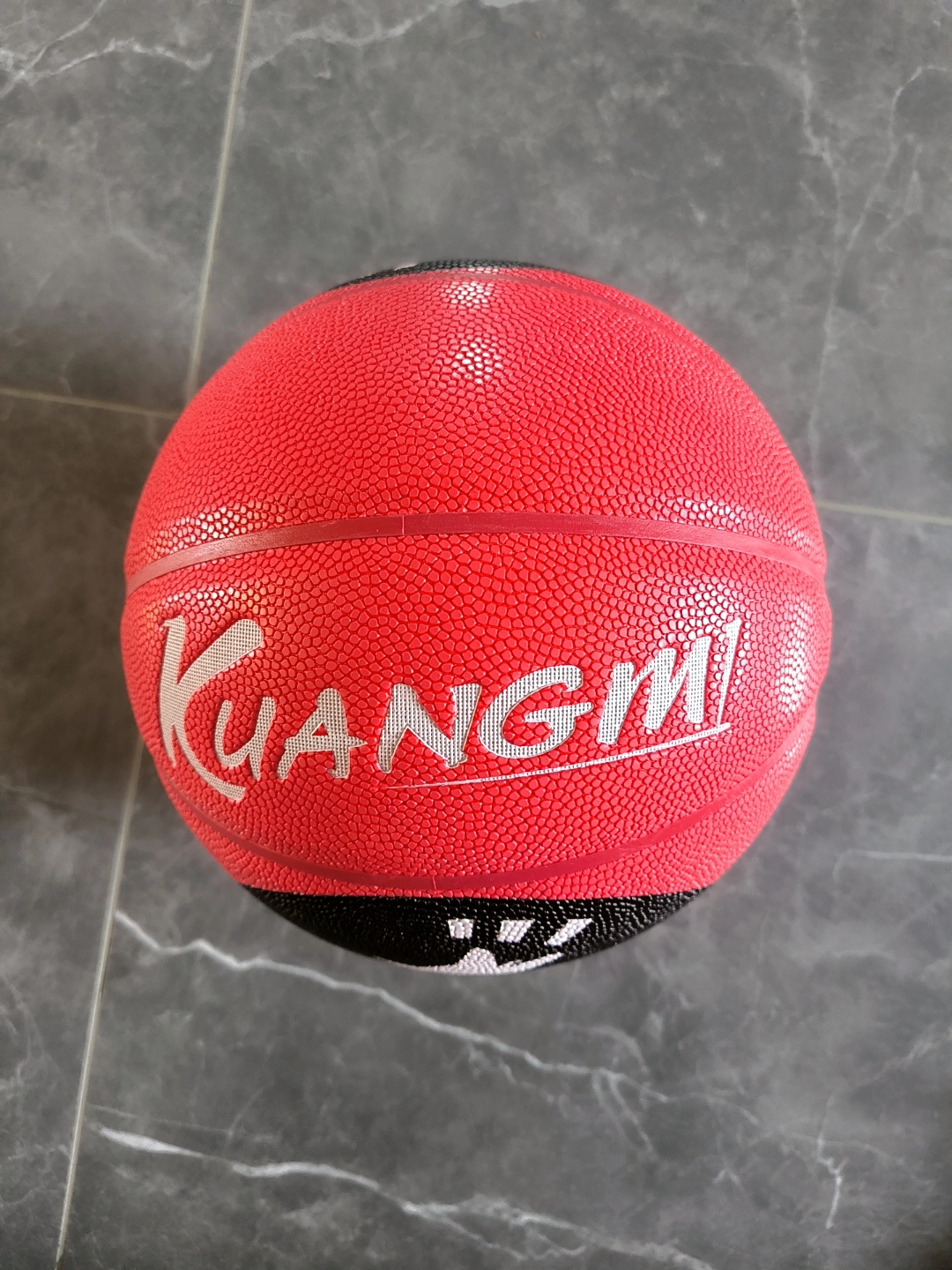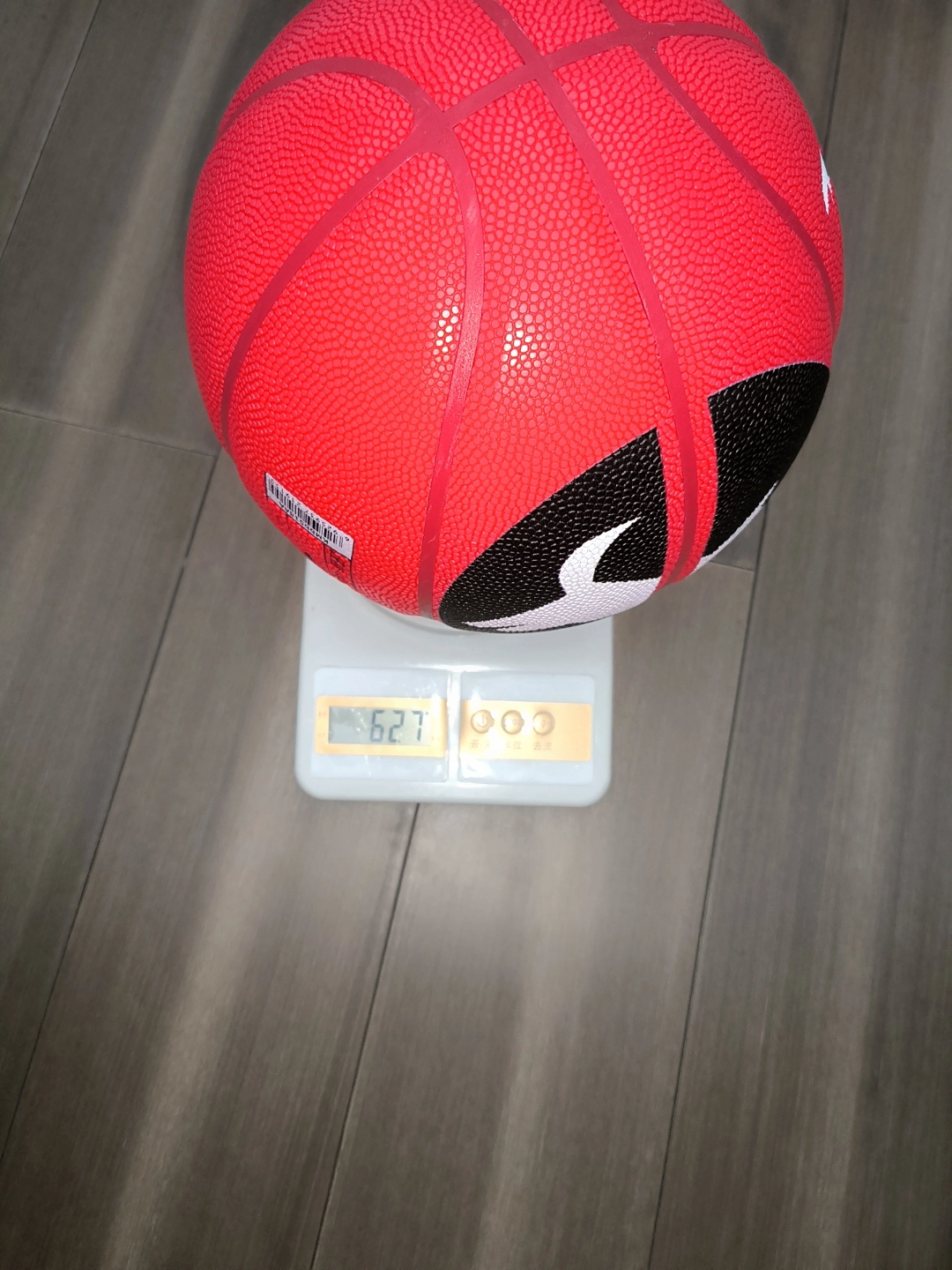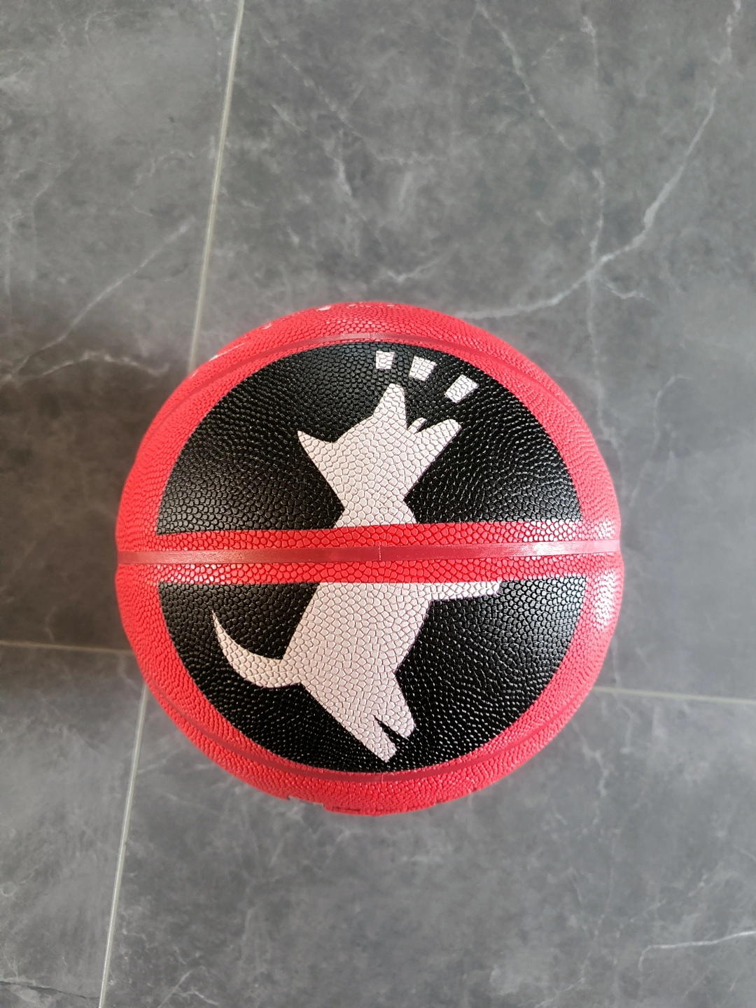 篮球是7号球,整体为大红色,篮球的中间。有一个大大的禁止狗叫的图案,颜值非常抗打。 篮球整体净重627g,大人小孩都可以用,表皮的pu材质非常耐磨,打外场也不用担心。 篮球买回来还送一个打气筒、一个收纳袋和一个带香薰的小圆片。收纳袋非常大,香薰、打气筒、篮球可以一起放进去。 个人使用后总价以下几点 优点: 表皮很耐磨。 表皮很吸汗。 缺点: 篮球中间图案处稍微有点滑。 新球刚拆开包...