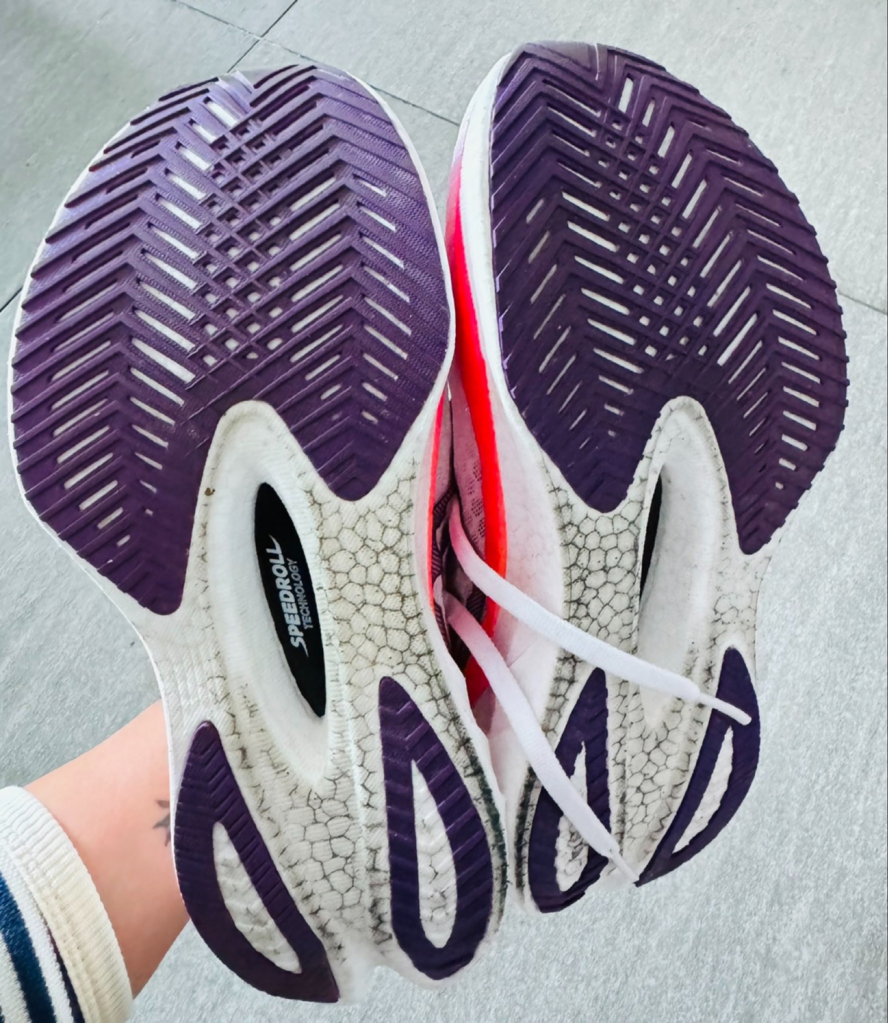 首先说说颜值,这个首发的配色,确实是好看,logo很大很夸张,这也很索康尼。 第二,鞋面是flyknit,和百分之4一样,非常舒适,包裹又好,鞋子整体很轻,44.5码只有200多克。 颜值不错,但鞋底弧度较平,就是没有啡鹏3的舒适滚动感和前掌发力点,缺少索味,个人感受。 材料弹性确实比飞鹏3好一点,但如果追求弹性,不管软弹还是韧弹,都有更好的选择,所以这一代最大的升级就是颜值了。爱好者确实上脚率高...
