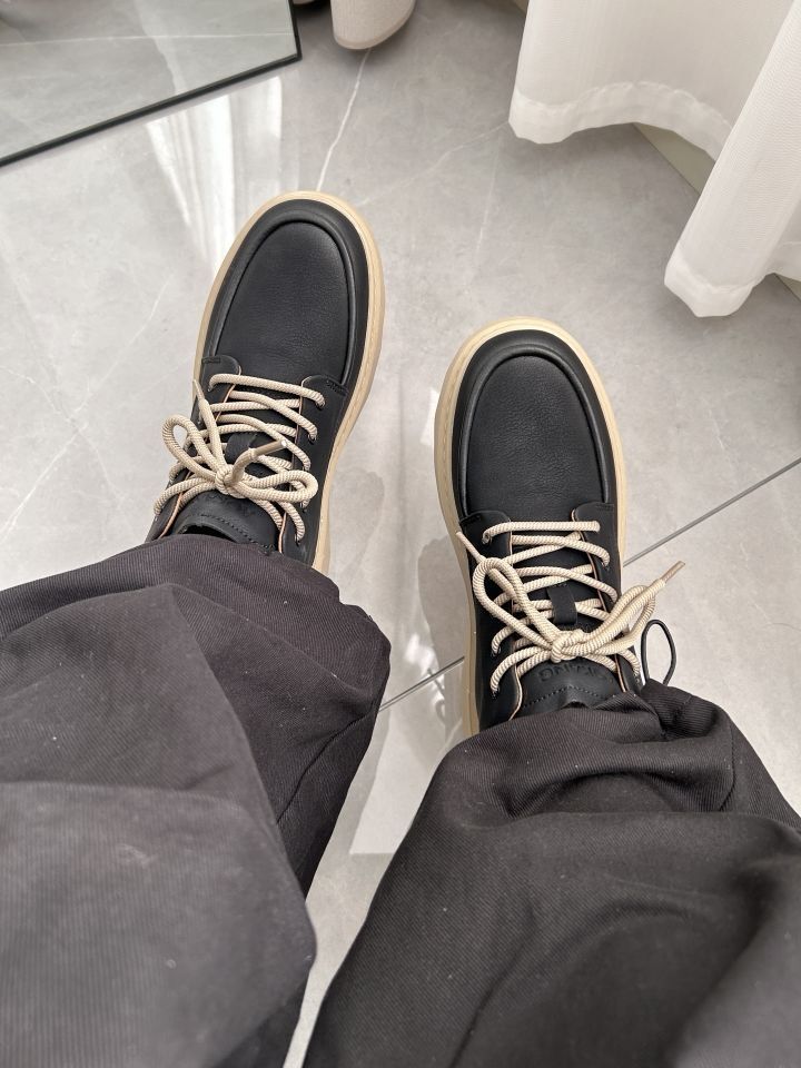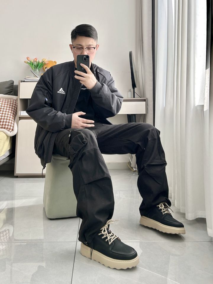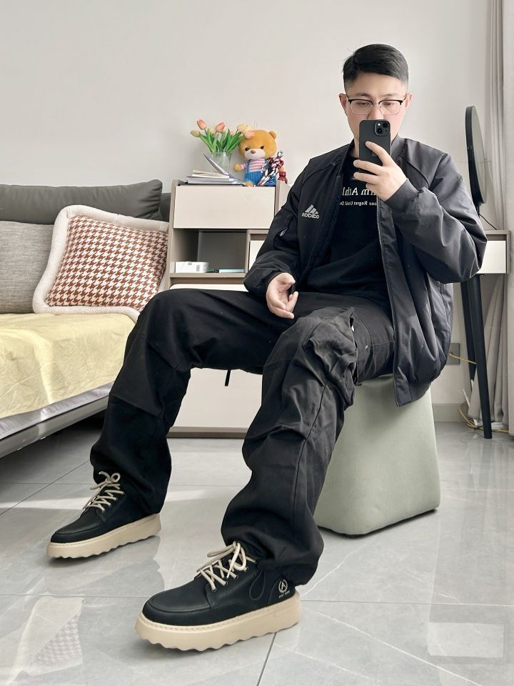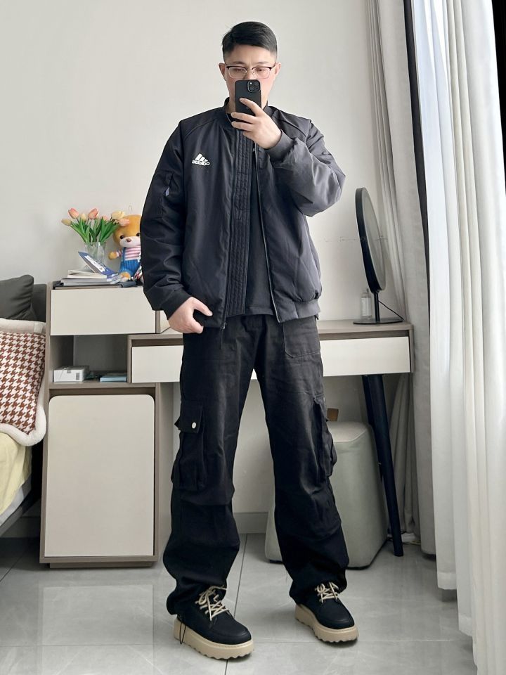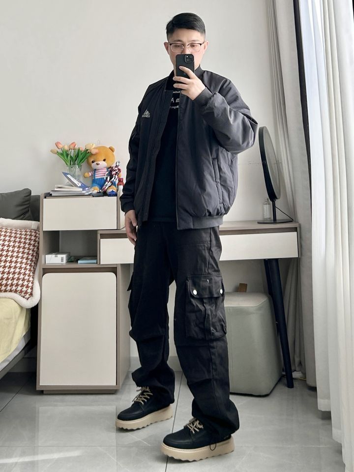 一件阿迪达斯棉服飞行夹克外套 一条黑色工装休闲裤 鞋子来自 奥康/AOKANG 空军一号厚底中帮休闲板鞋 黑色皮革鞋面,柔软细腻,很有质感 内里柔软舒适,日常穿很合适 上脚很好看,简约休闲酷感个性 耐磨防滑加厚鞋底,轻便舒适显高