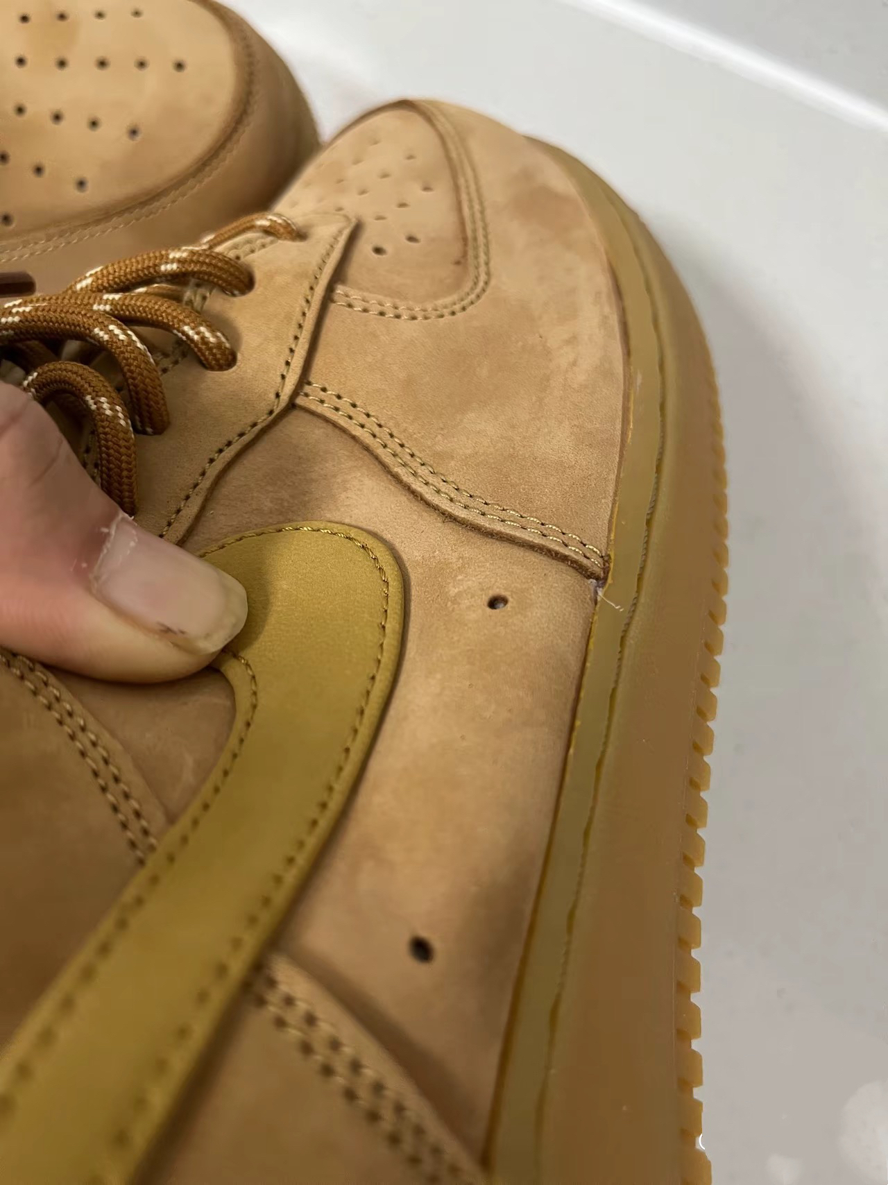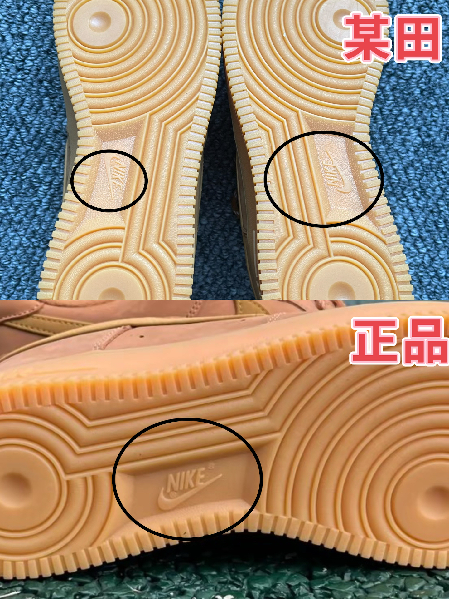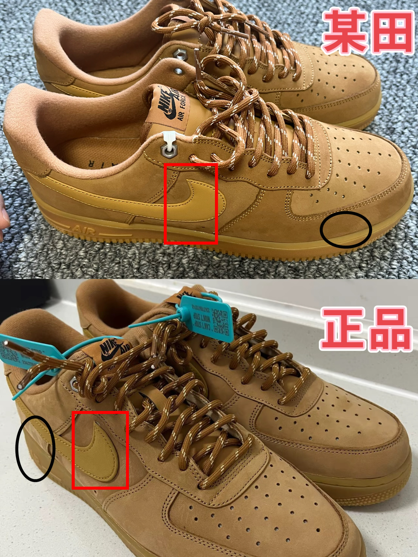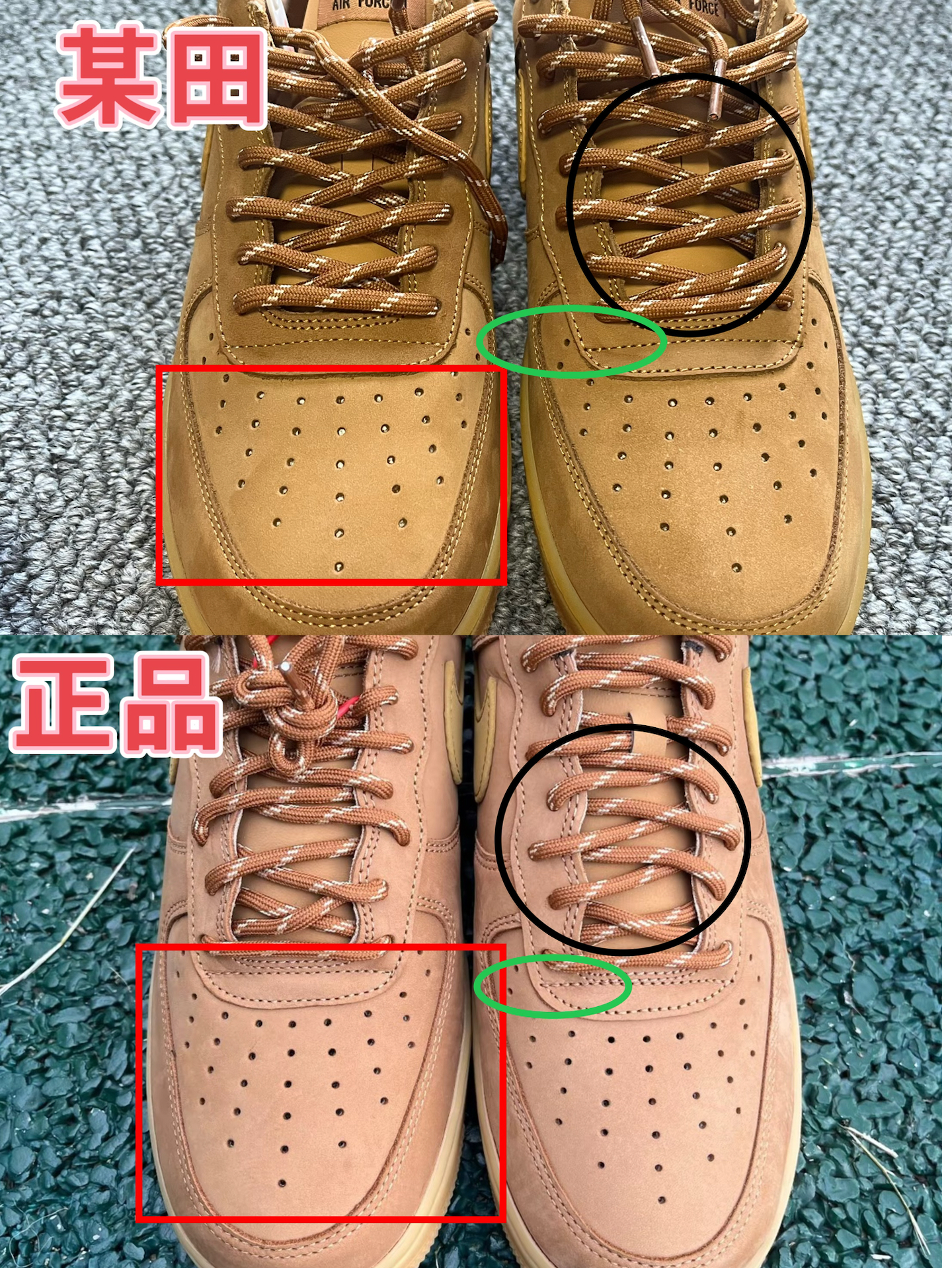 1后跟logo压印 正品压印均匀字体自然清晰「整体角度方正」 仿品压印深浅不均印记颜色深应该是烫印「有点偏斜不正且整体偏小」 2正品勾尖与仿品勾尖形状偏差「用的材料明显不同」 正品的刷感明显仿品的需要手动磨毛才勉强出现 正品皮质的切面平滑 仿品皮质的切面能看出毛糙感像把渣子压制在一起的 3鞋面打孔正品与仿品一眼差别 鞋面走线正品与仿品差距很大 鞋带正品与仿品质量也不同,正品质量更好 4鞋...